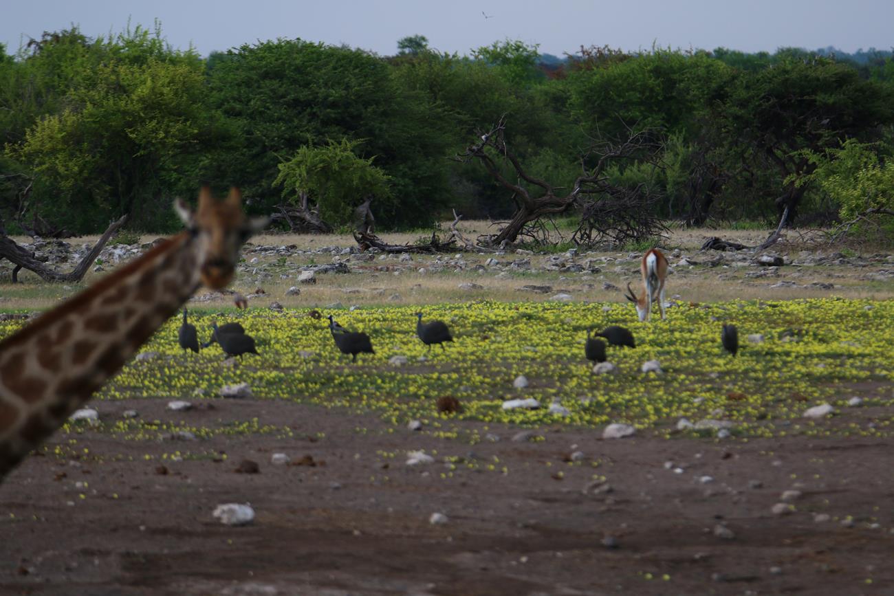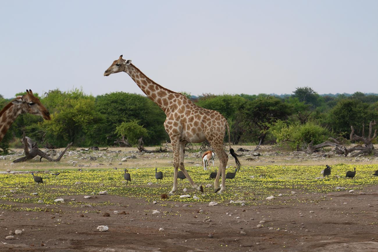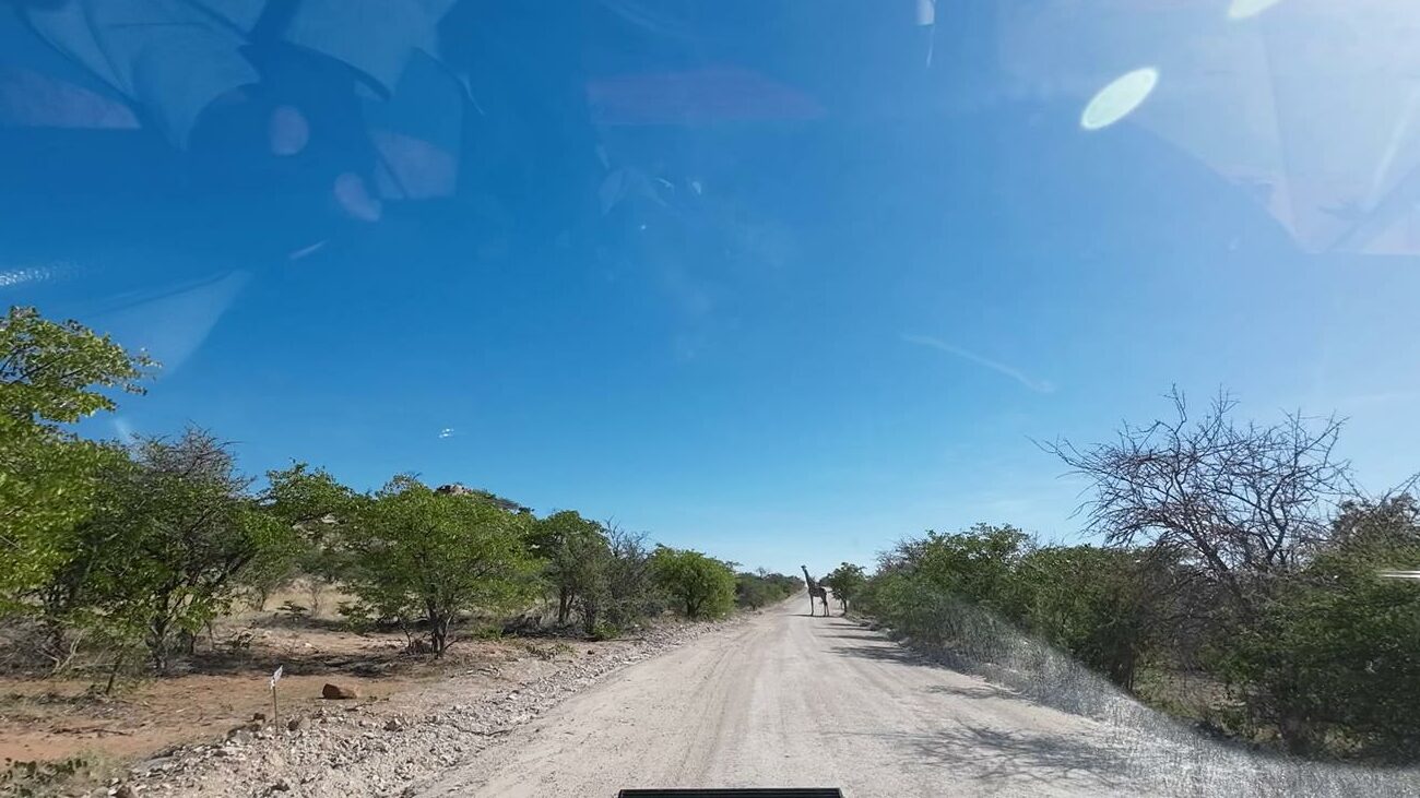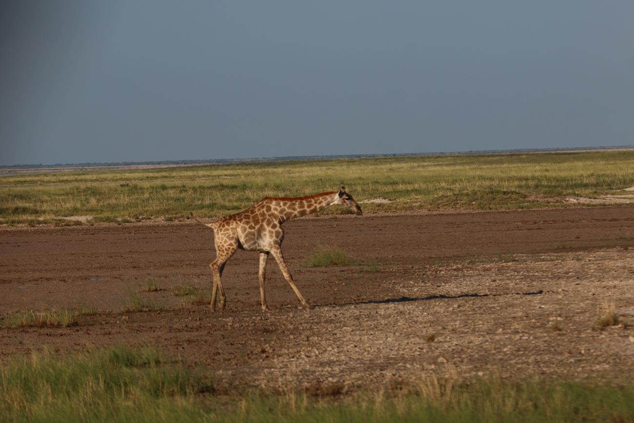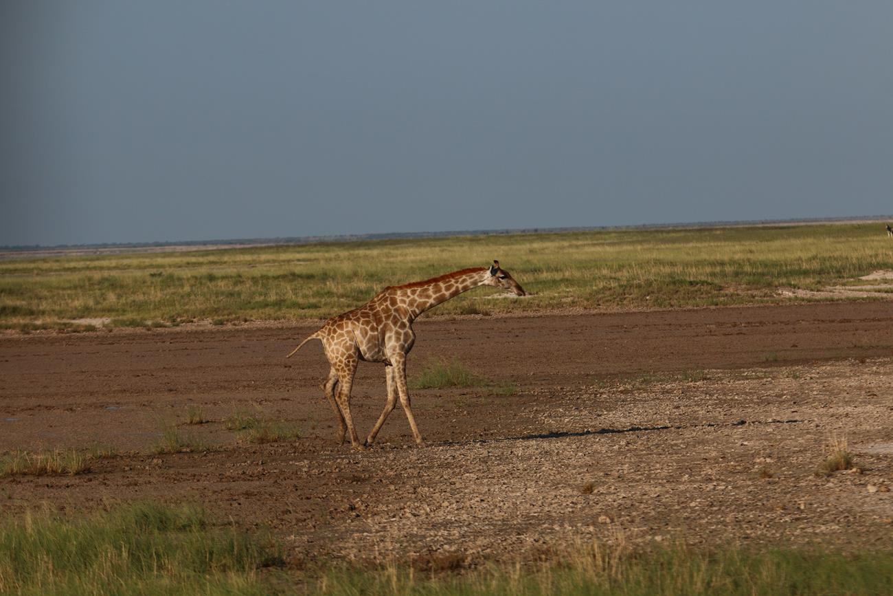 Retour sur les pistes vers le Pan et bien sûr un petit nuage. Certaines girafes ont des difficultés à traverser le pan, car il est encore gorgé d’eau.