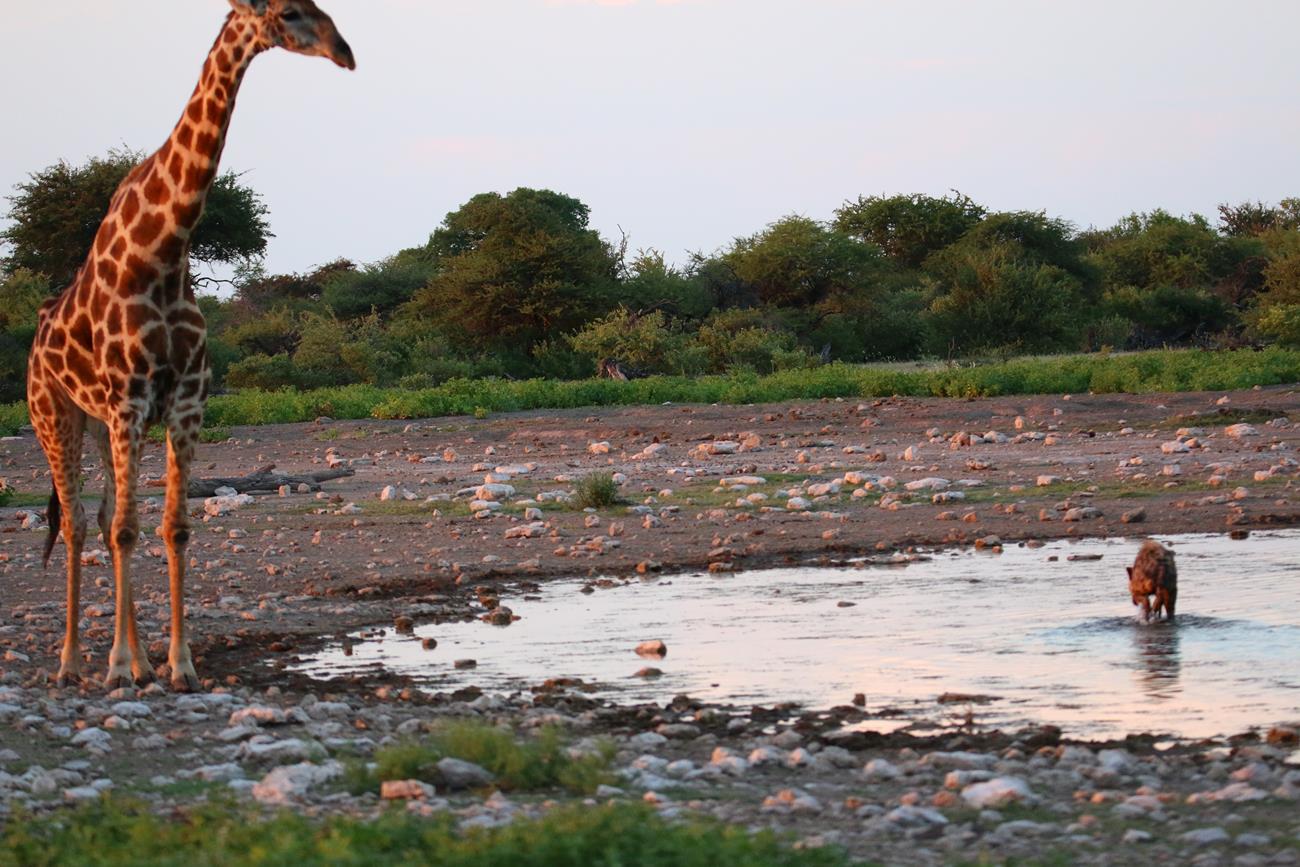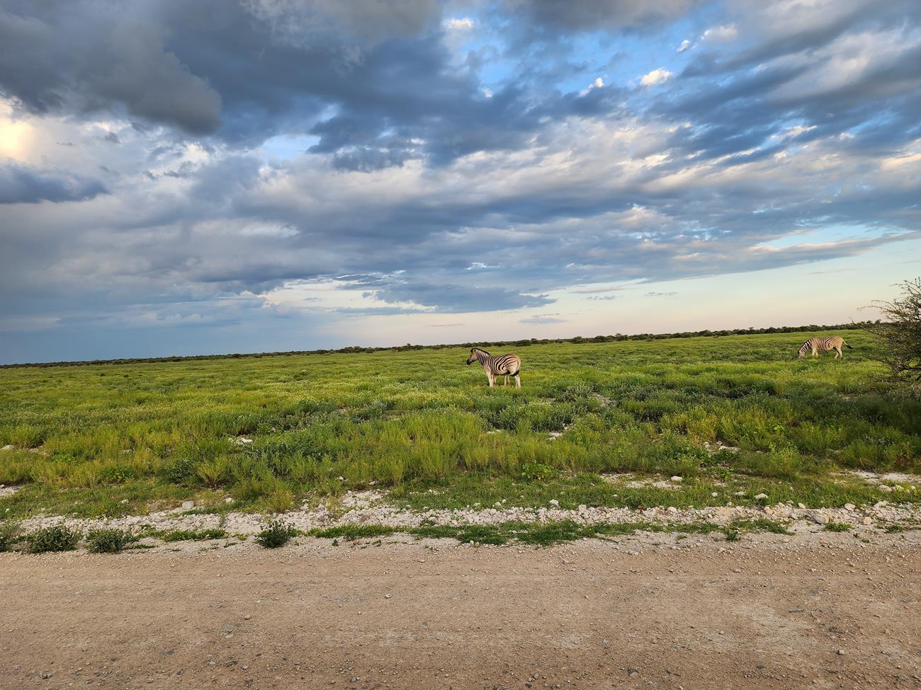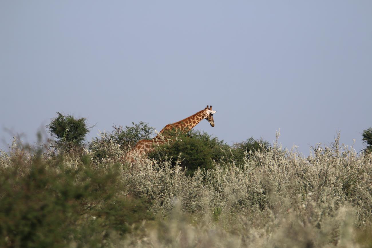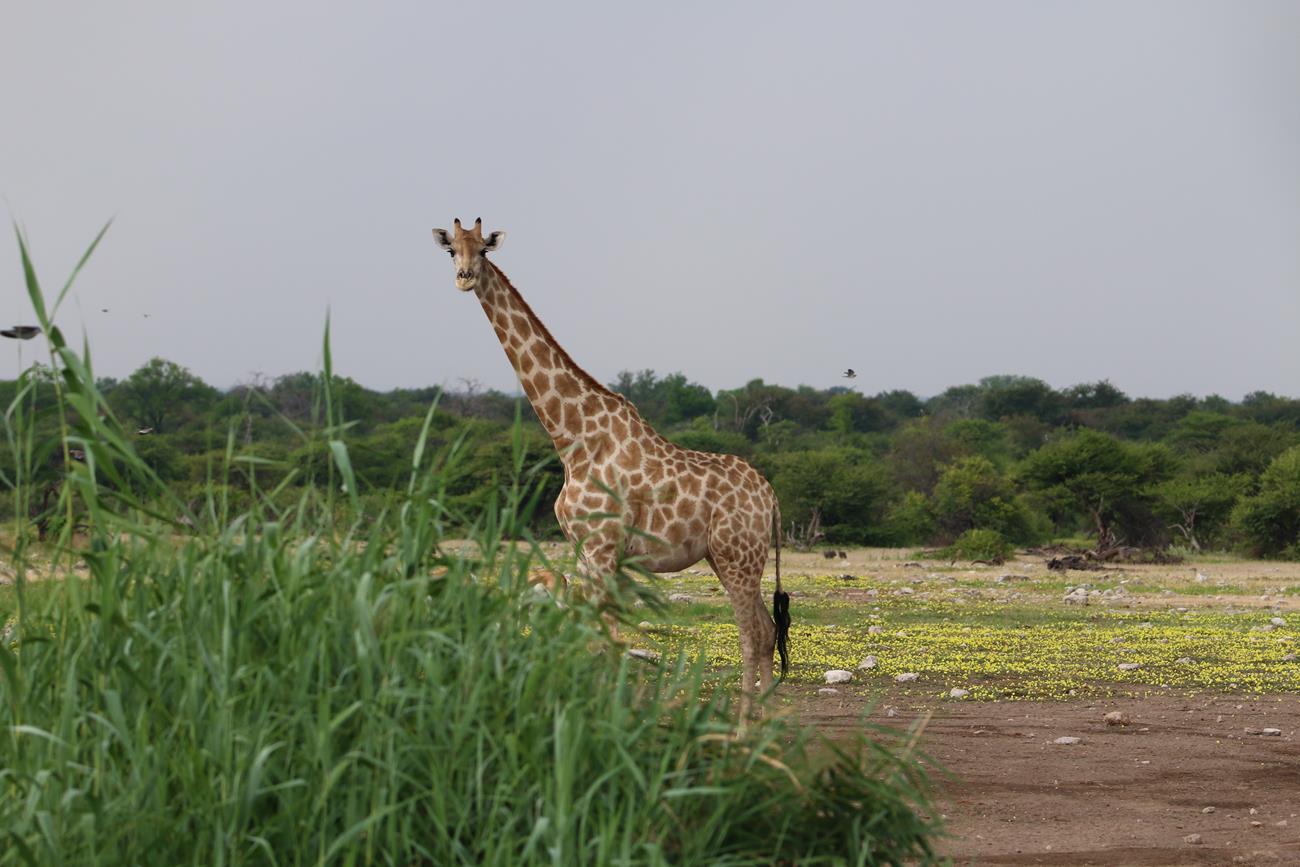 Retour sur les pistes vers le Pan et bien sûr un petit nuage. Certaines girafes ont des difficultés à traverser le pan, car il est encore gorgé d’eau.