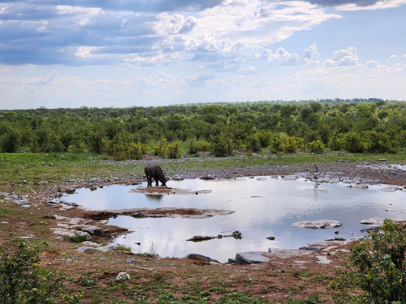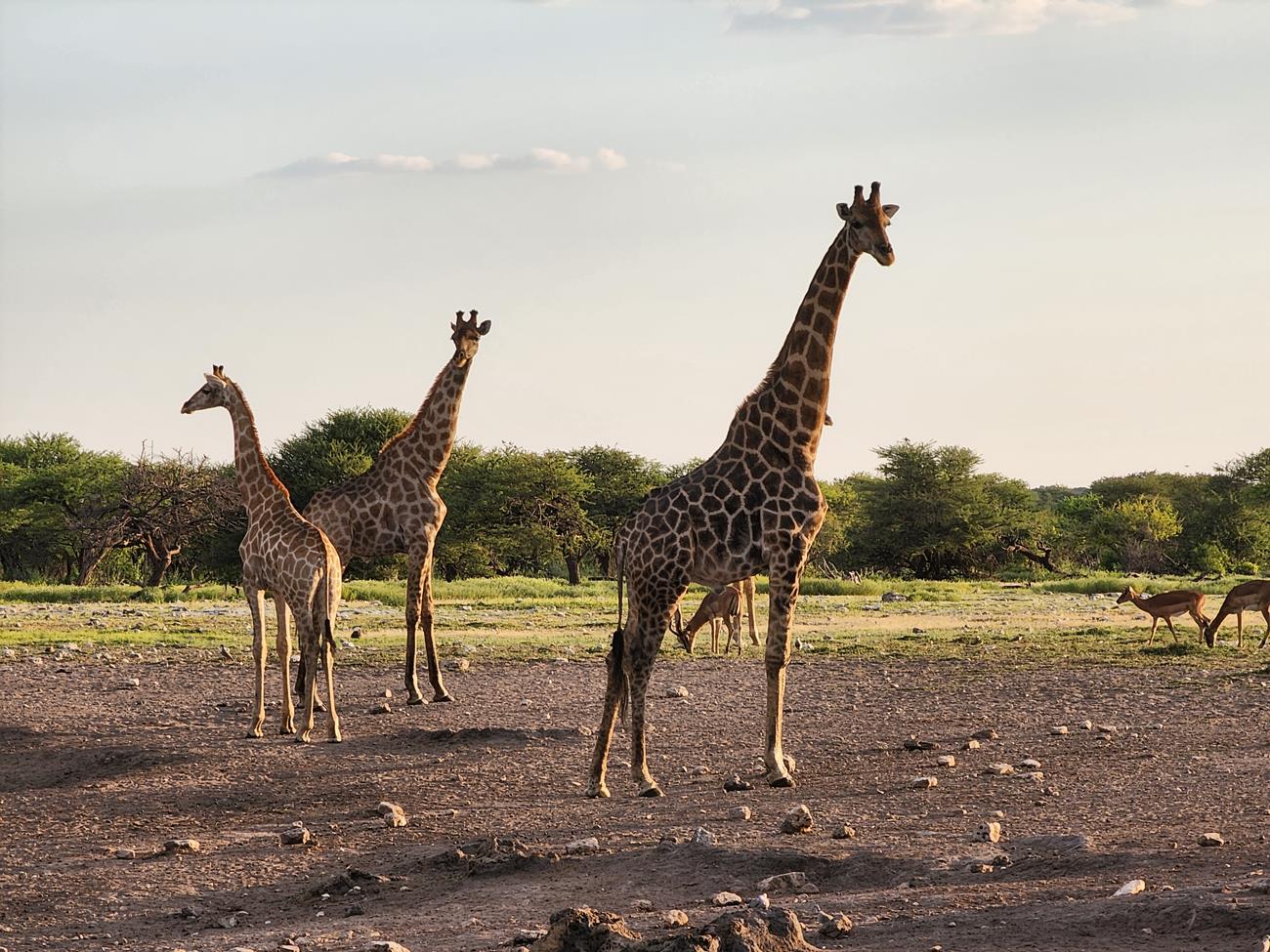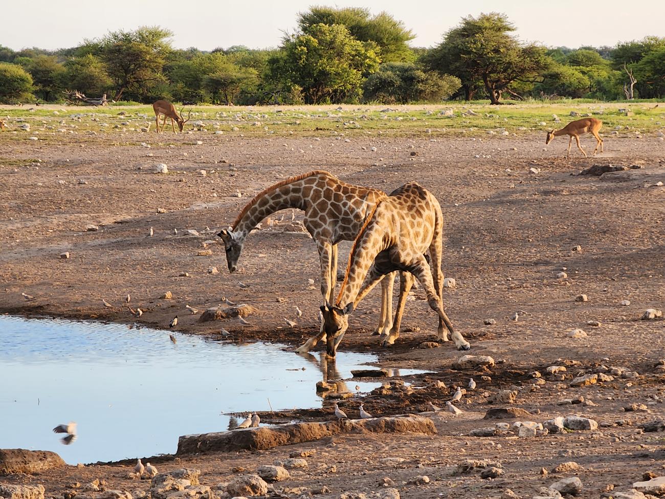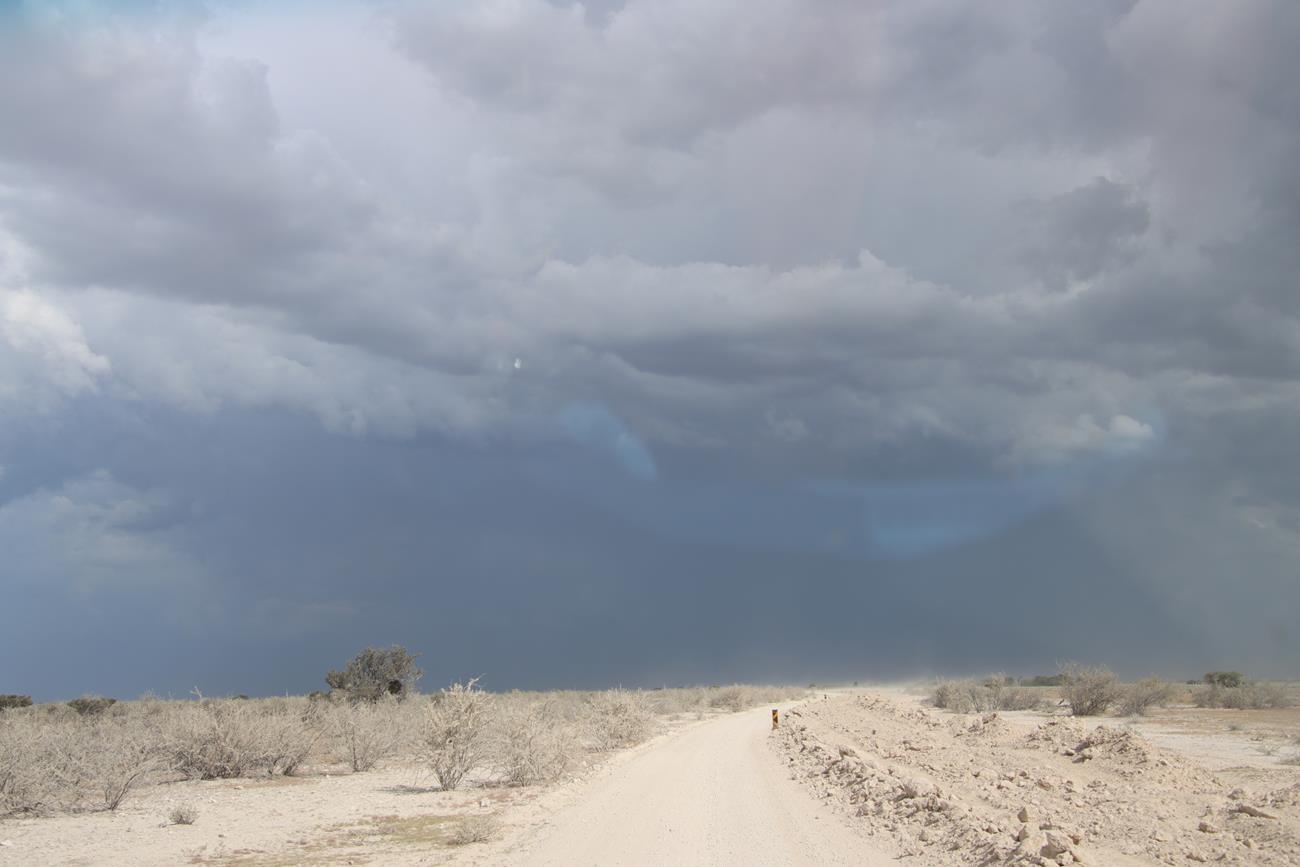 Retour sur les pistes vers le Pan et bien sûr un petit nuage. Certaines girafes ont des difficultés à traverser le pan, car il est encore gorgé d’eau.