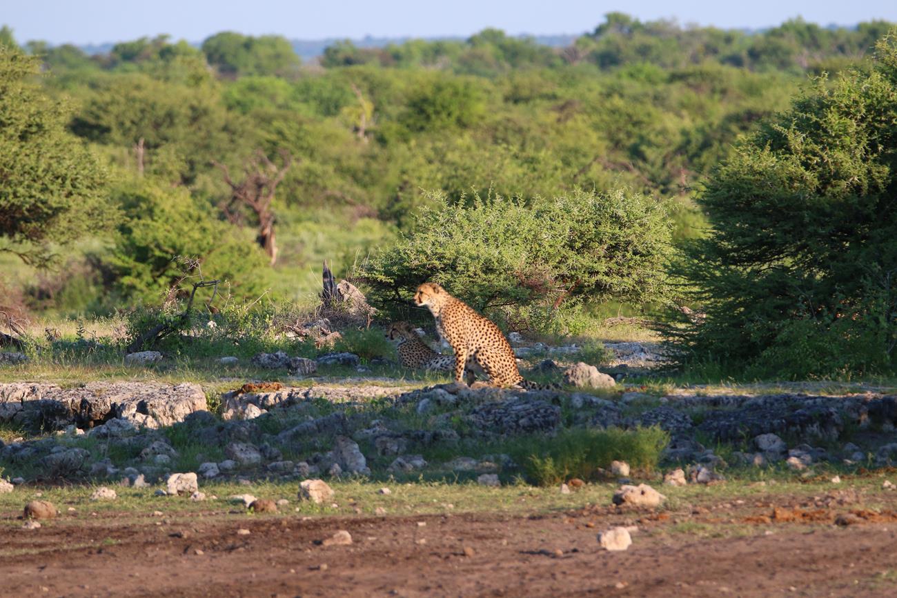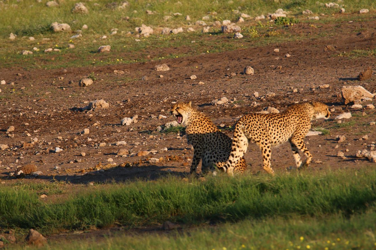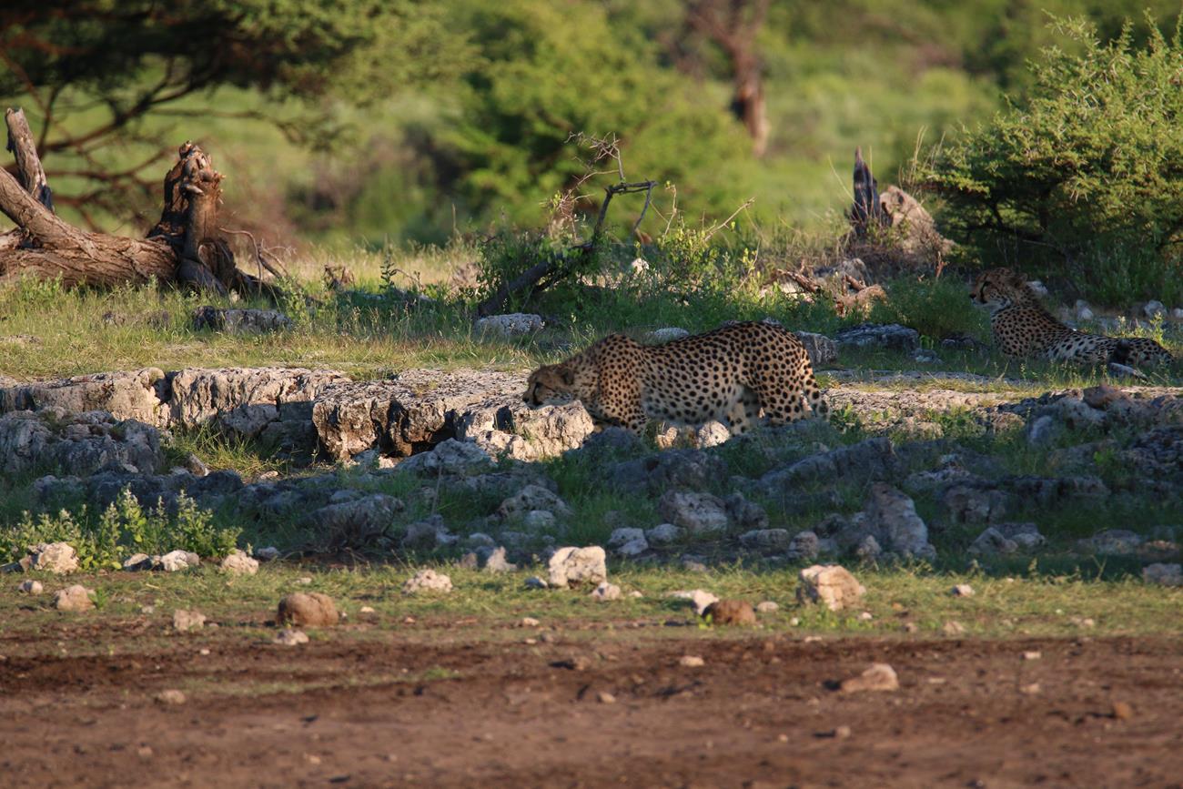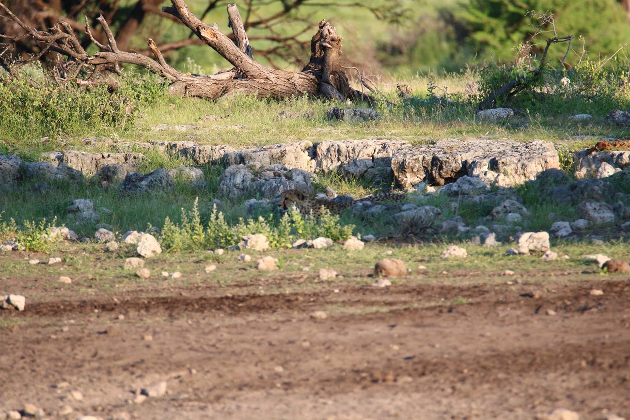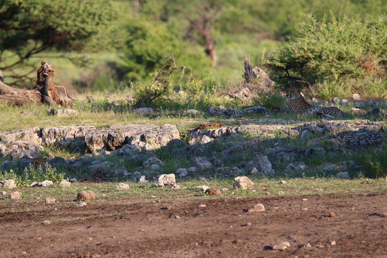 Les guépards finissent par s’allonger et se dissimuler sous un arbuste pour un et l’autre entre des cailloux pour l’autre. Impossible de retrouver le troisième.