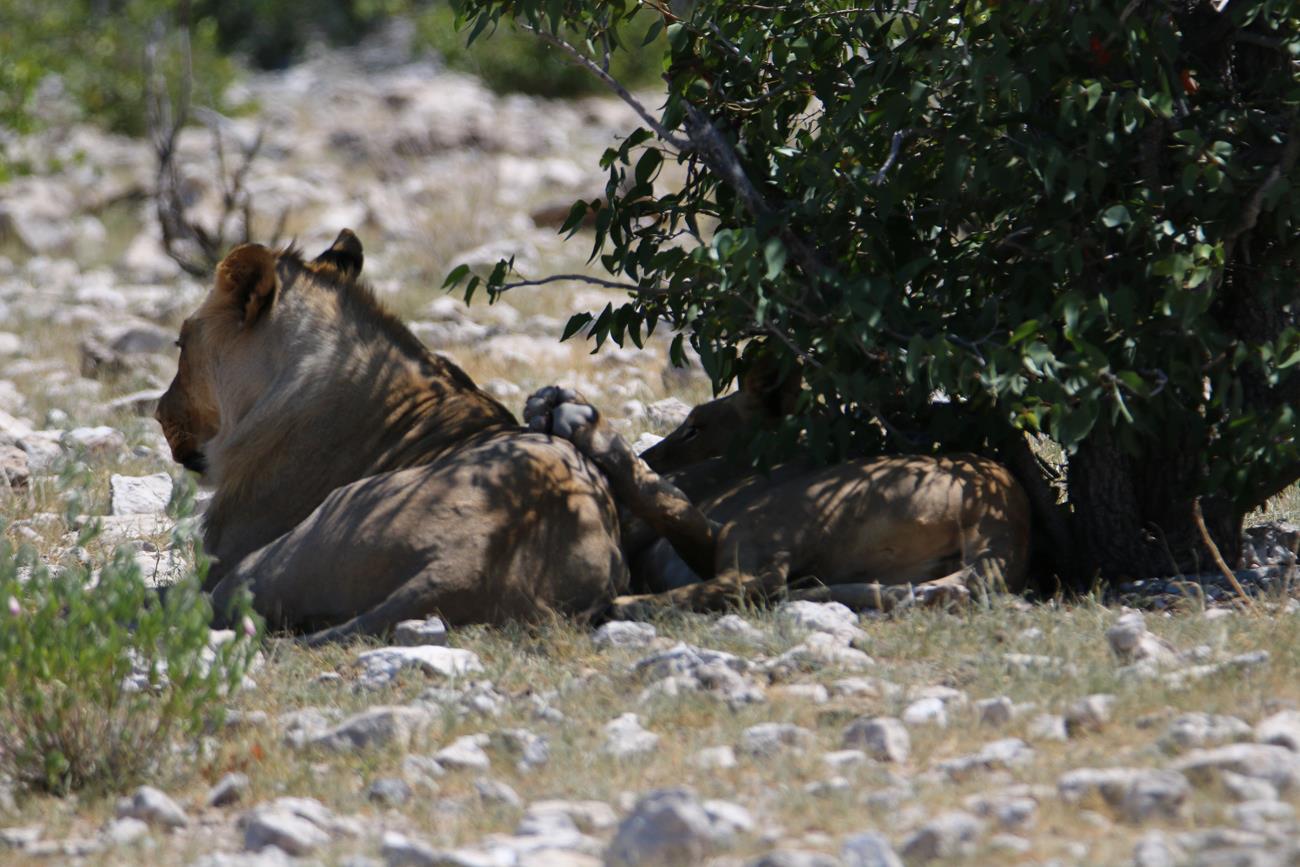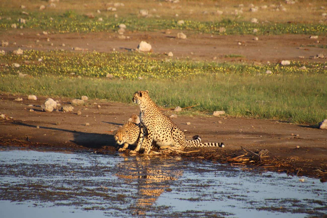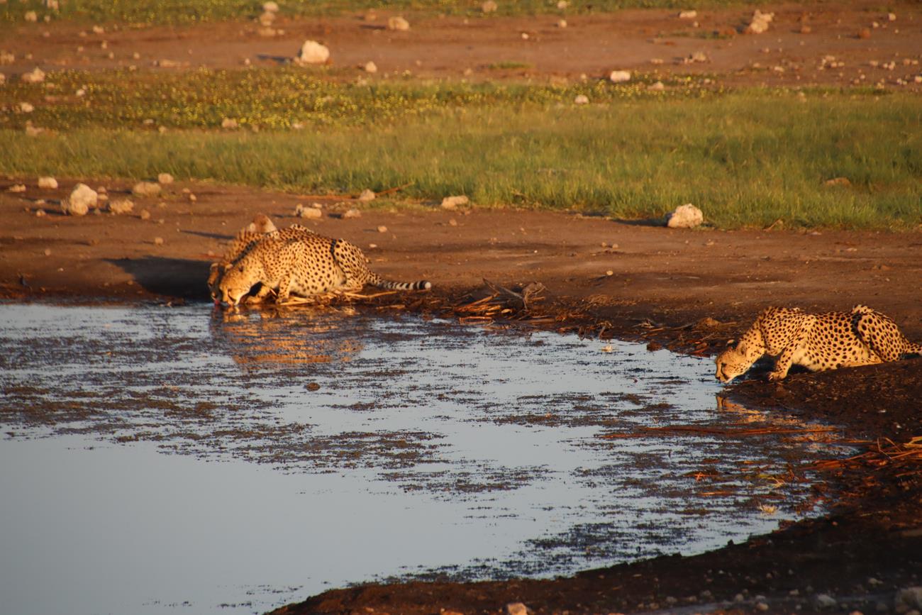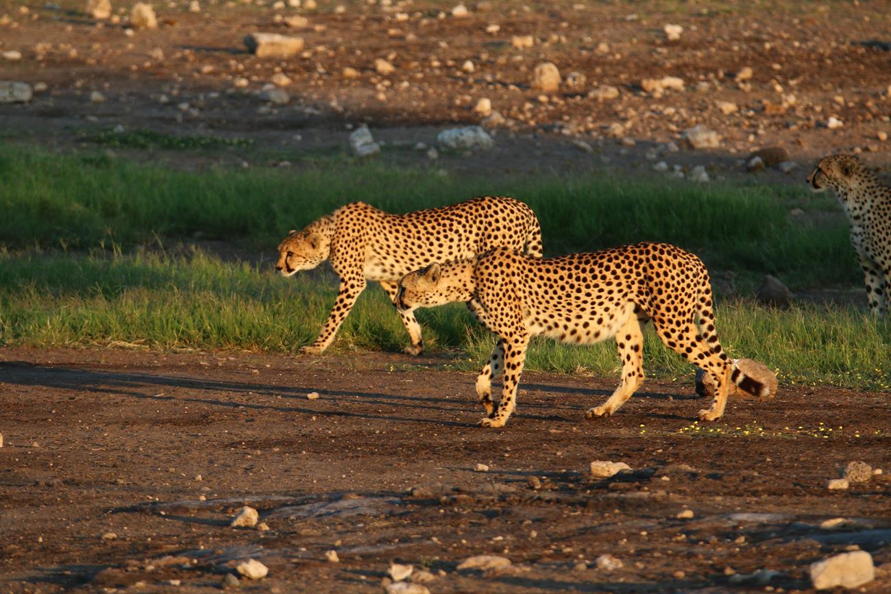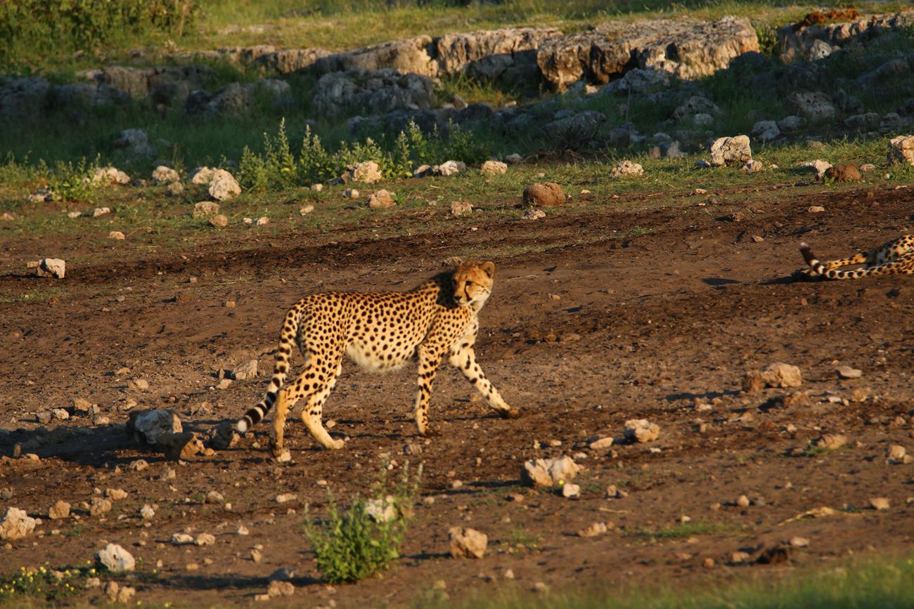 Les guépards finissent par s’allonger et se dissimuler sous un arbuste pour un et l’autre entre des cailloux pour l’autre. Impossible de retrouver le troisième.