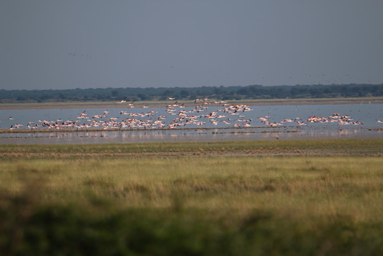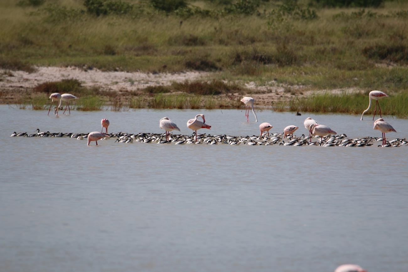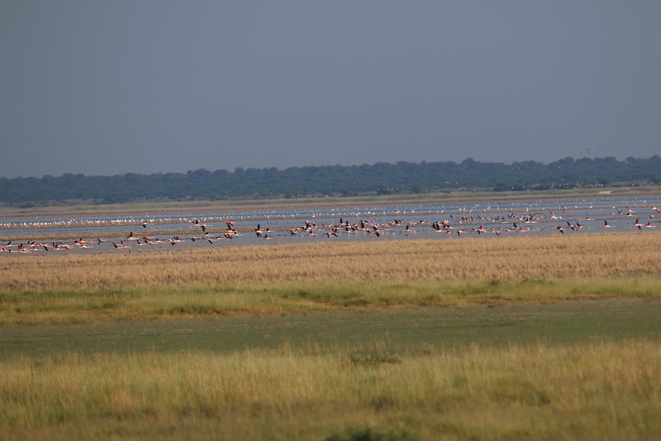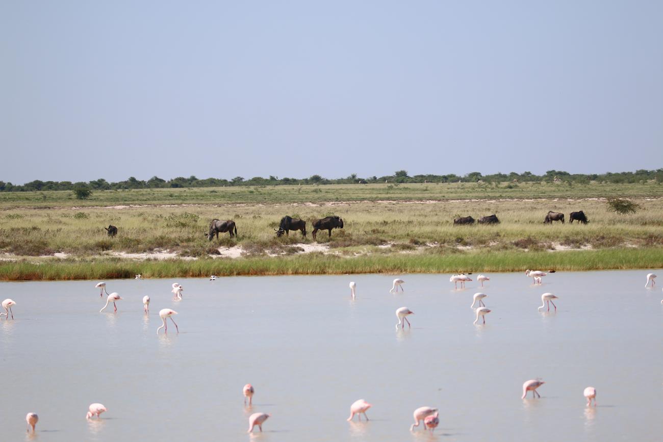 Nous relongeons le Pan . Flamands rose et le flamant nain, canards de toutes sortes avec les gnous et les zèbres en arrière plan .