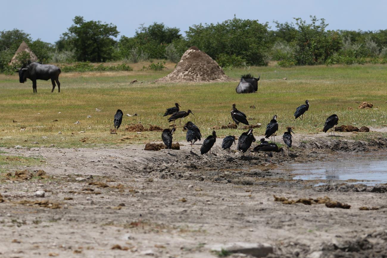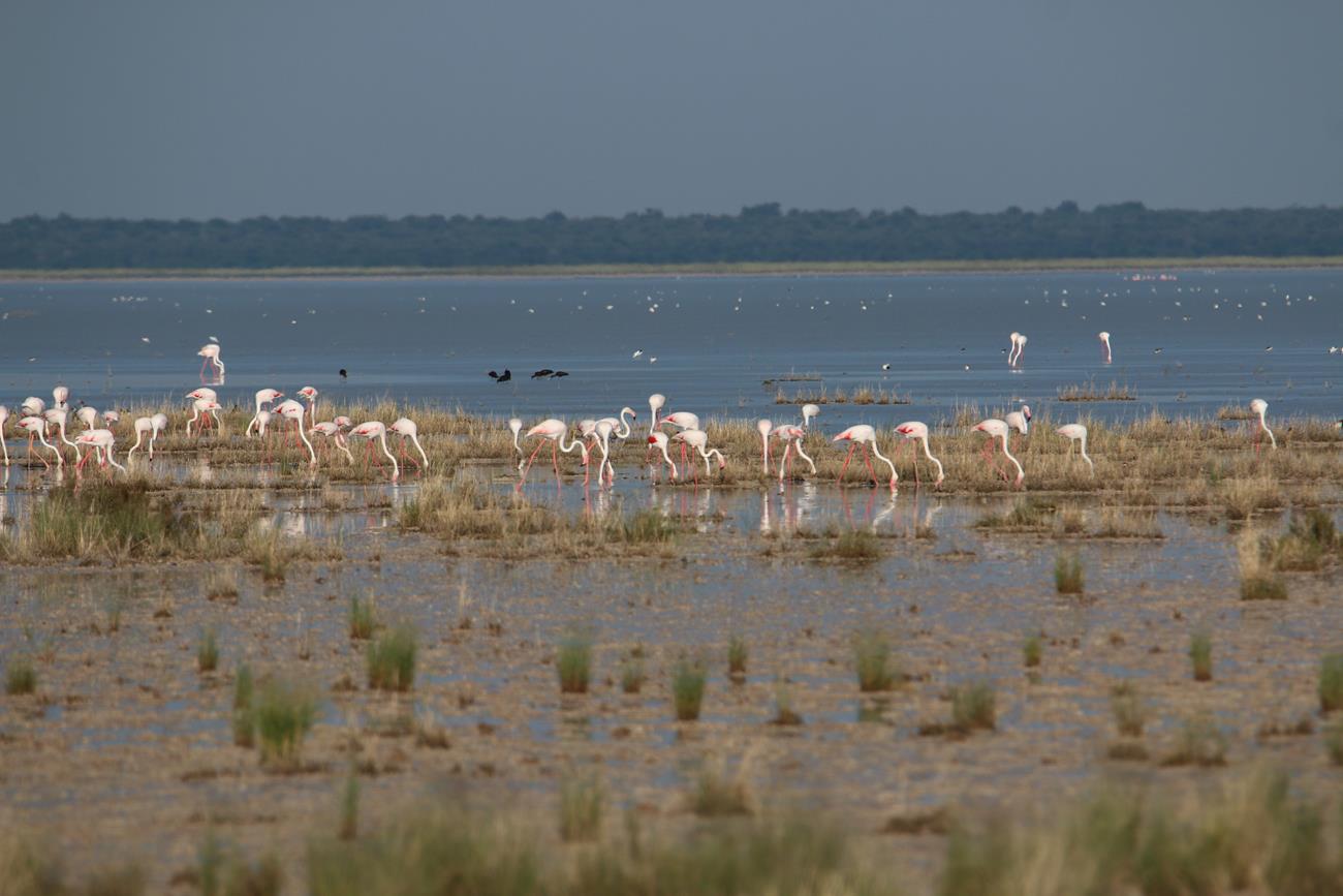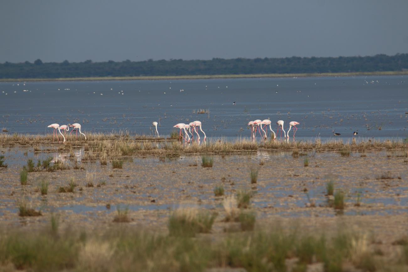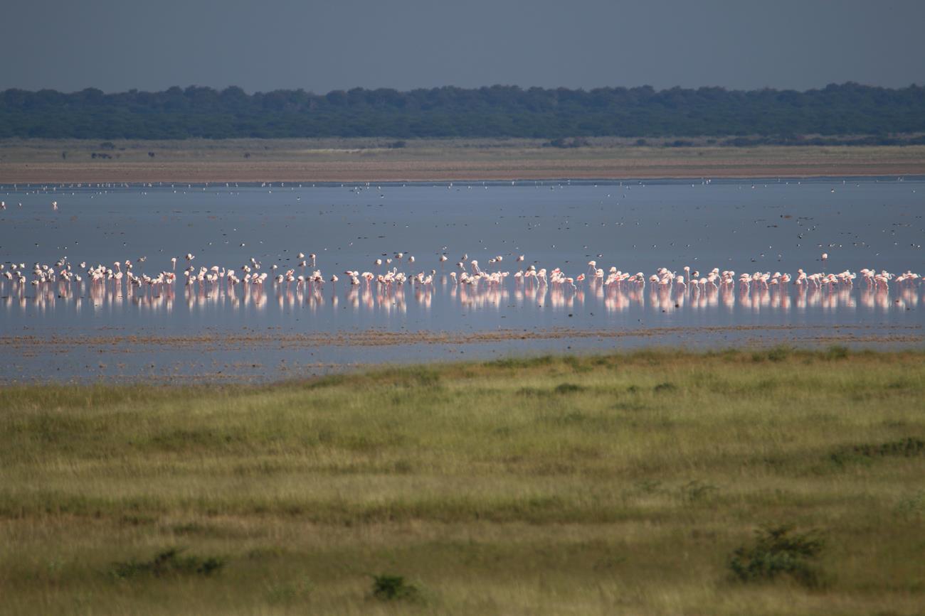 Nous relongeons le Pan . Flamands rose et le flamant nain, canards de toutes sortes avec les gnous et les zèbres en arrière plan .