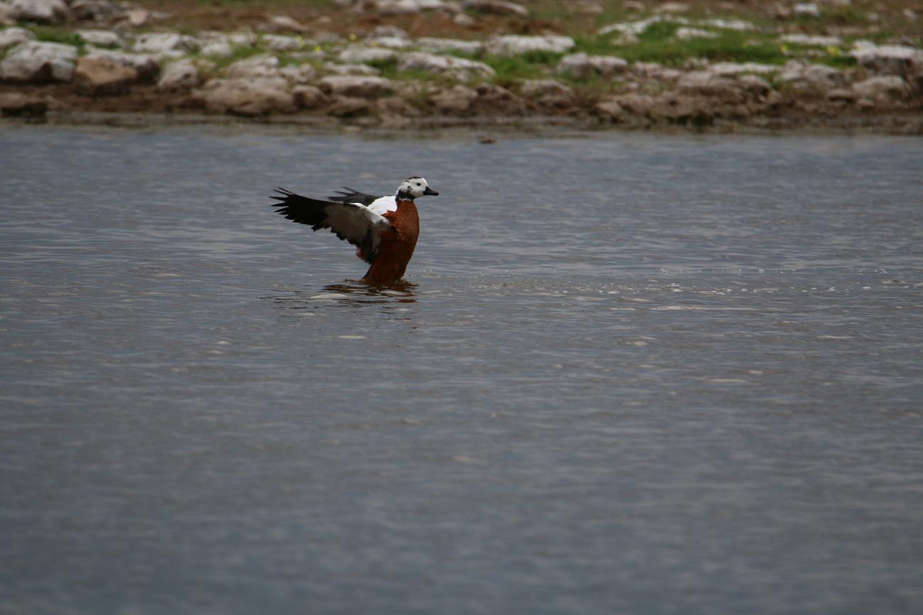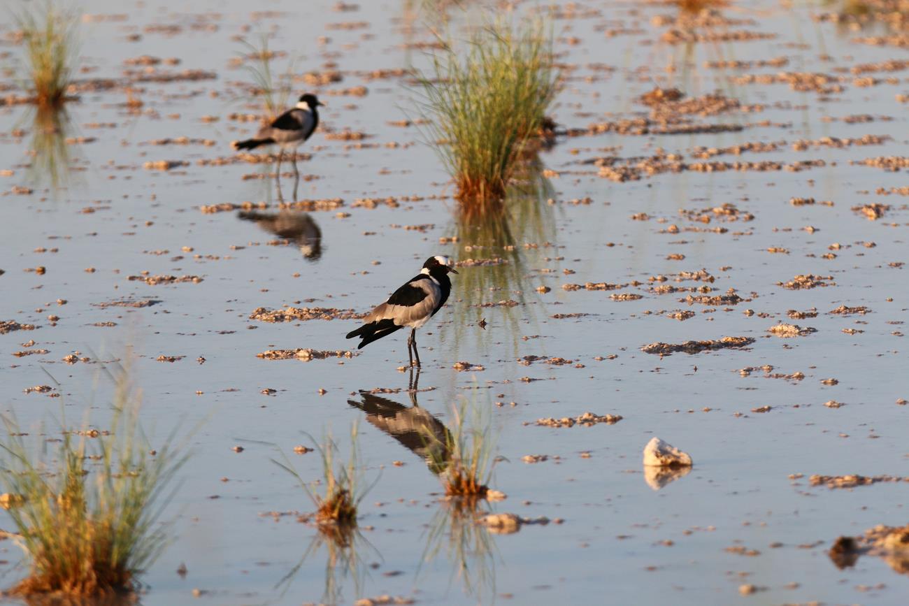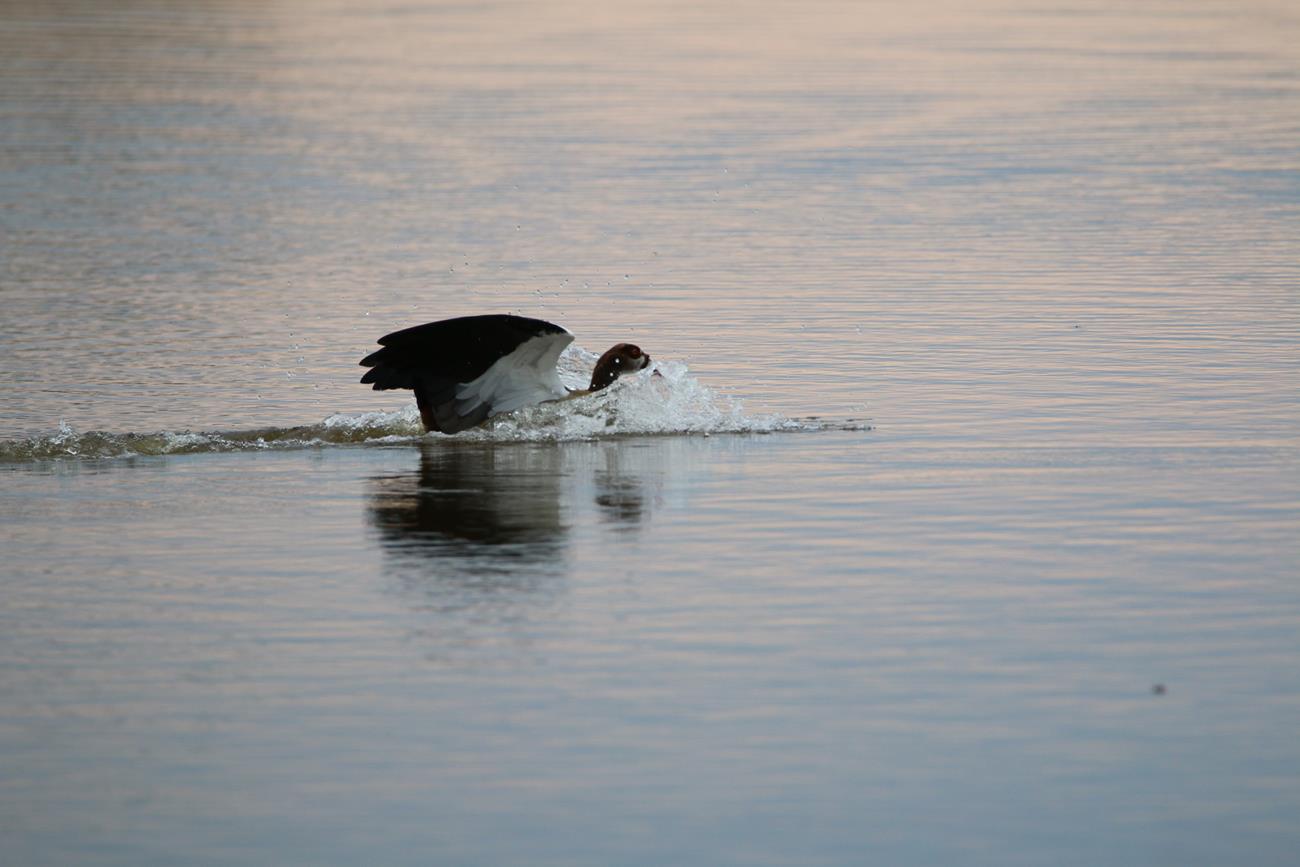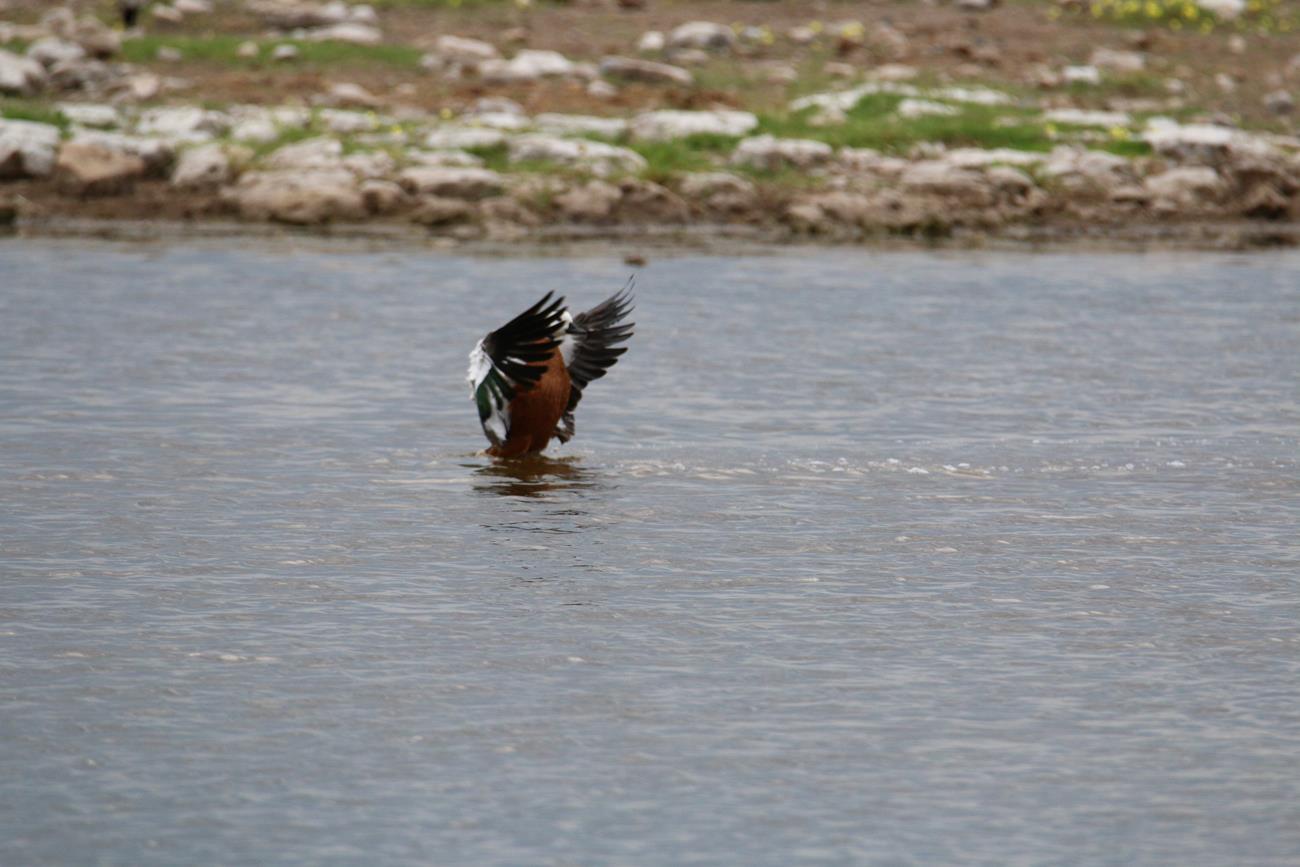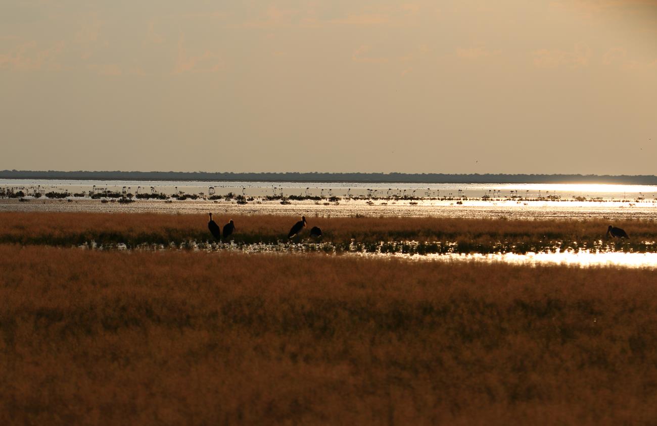 Nous relongeons le Pan . Flamands rose et le flamant nain, canards de toutes sortes avec les gnous et les zèbres en arrière plan .