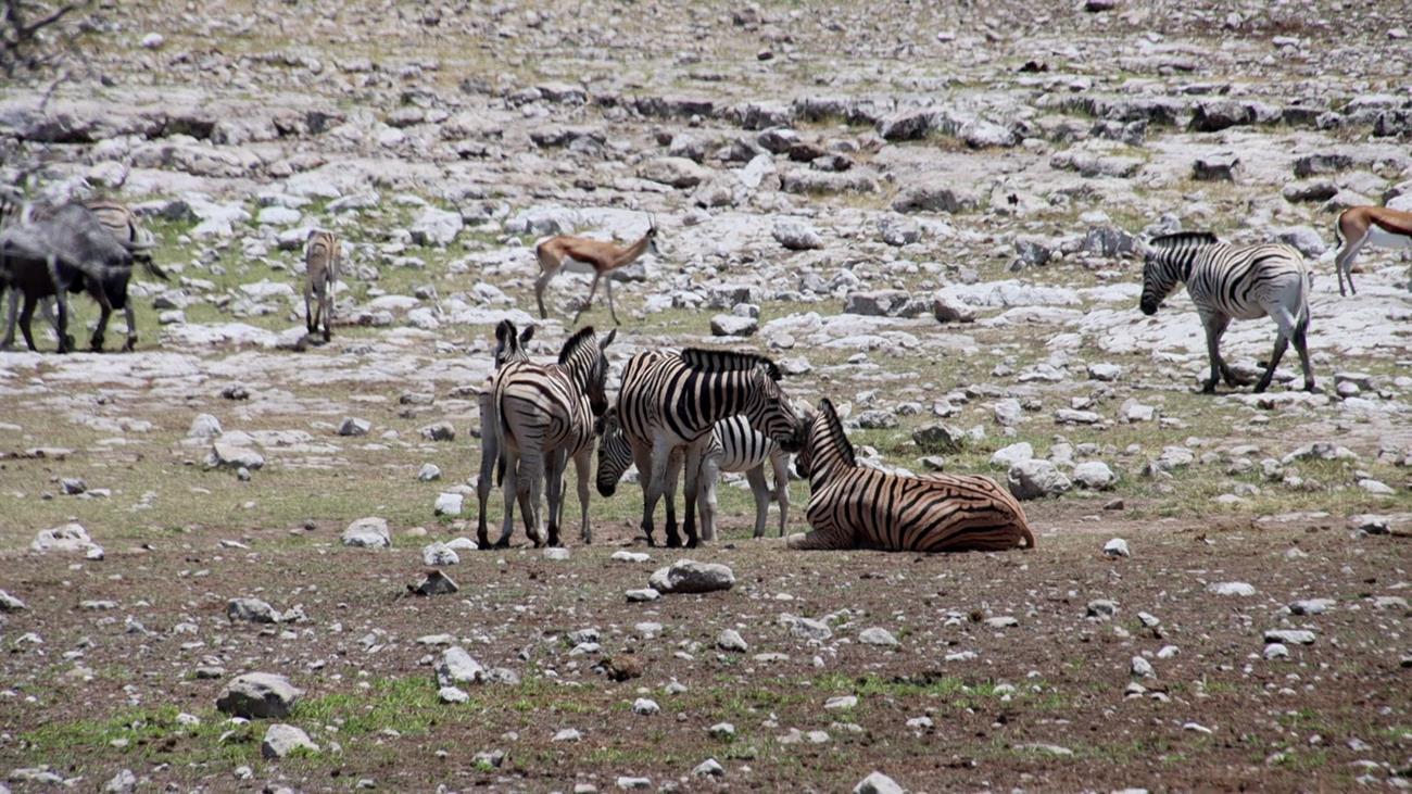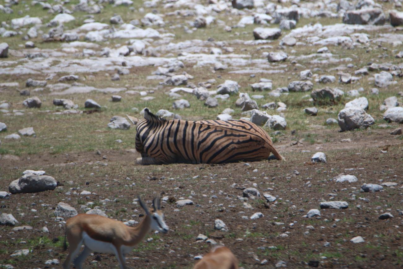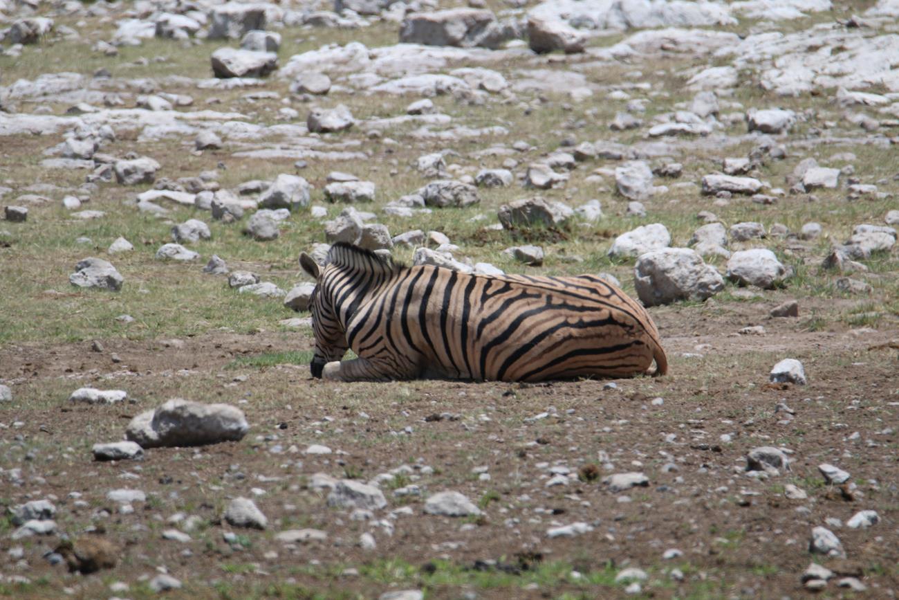 Notre regard est attiré par un zèbre qui est allongé et qui ne semble pas en pleine forme.