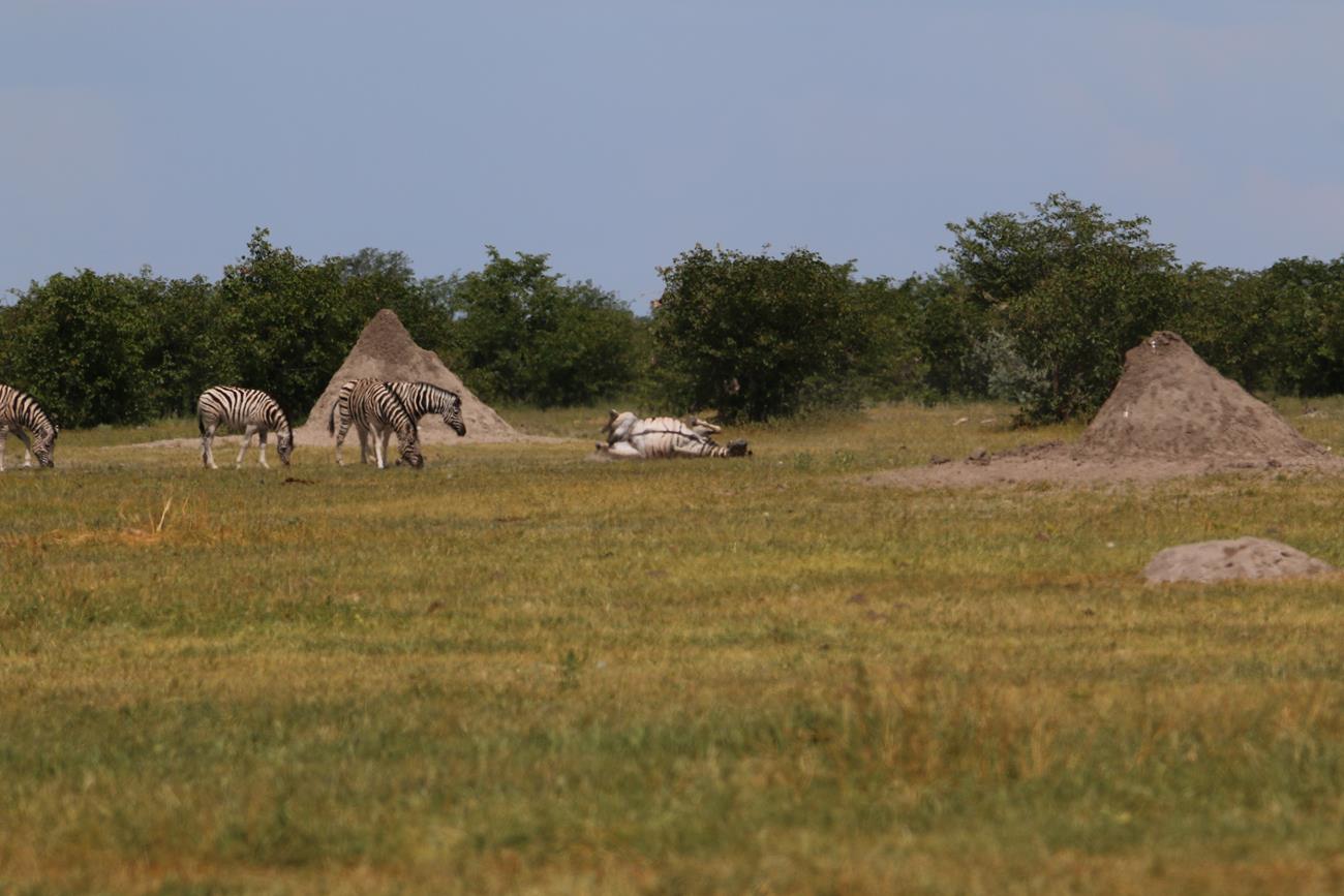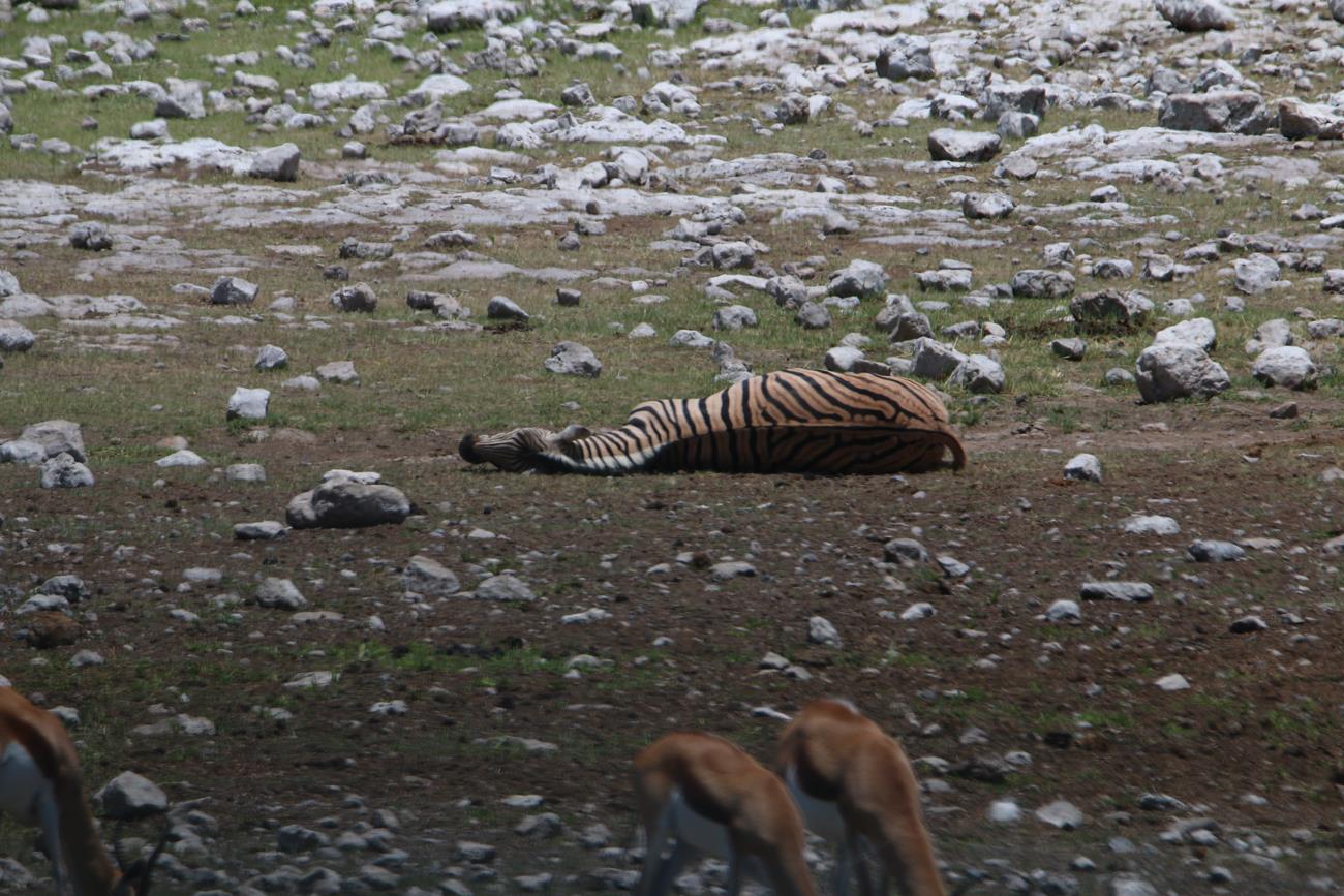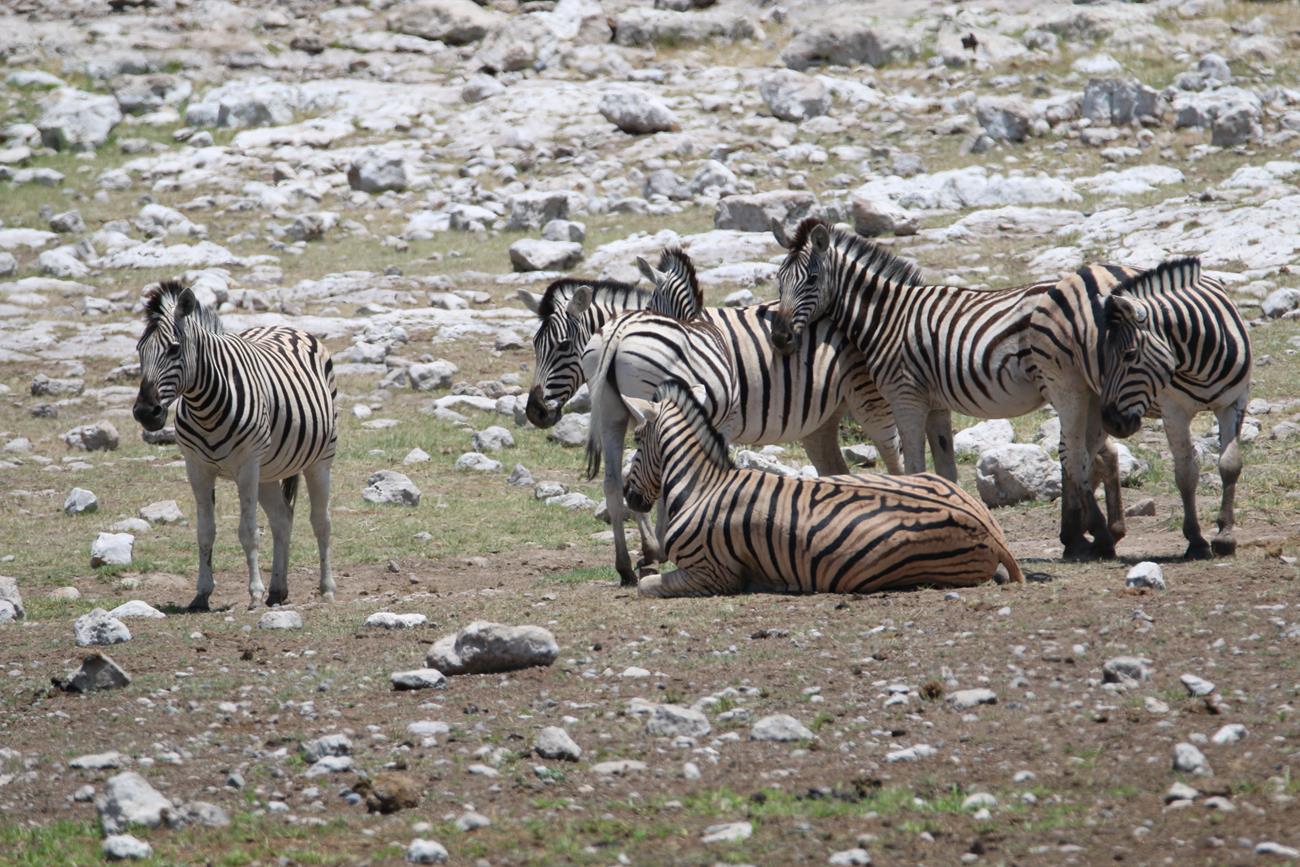 Notre regard est attiré par un zèbre qui est allongé et qui ne semble pas en pleine forme.