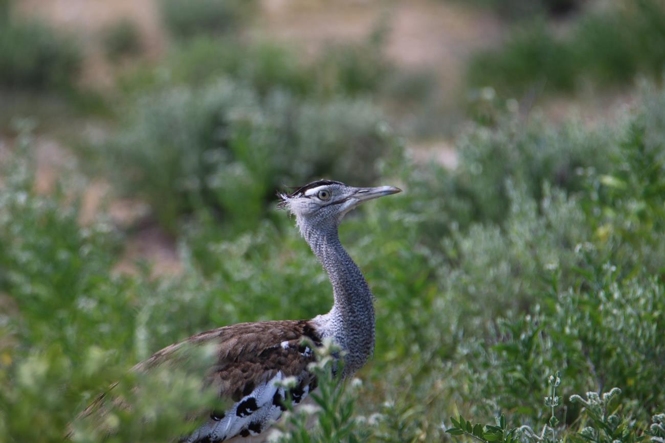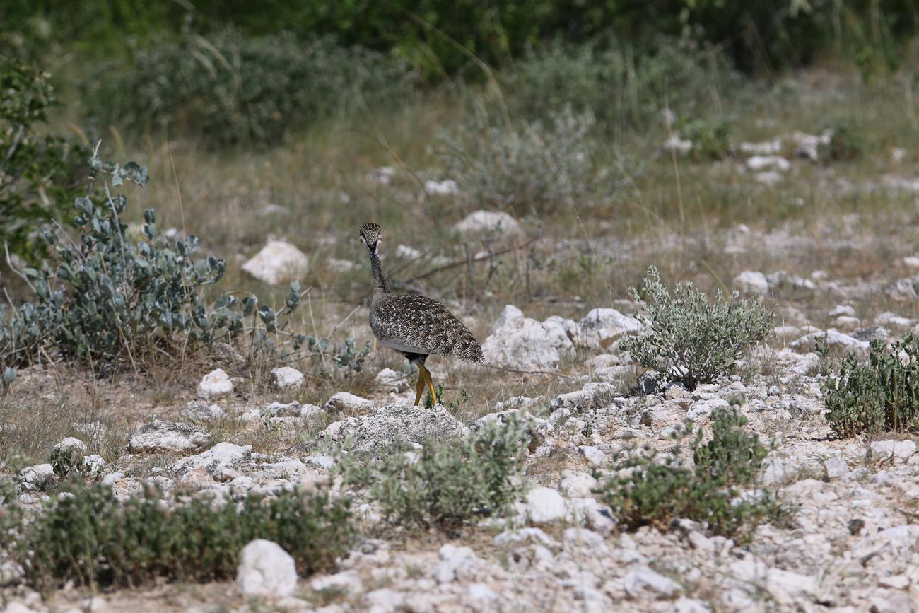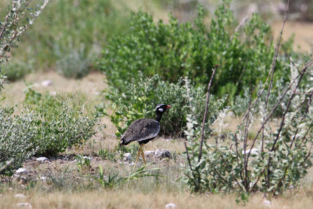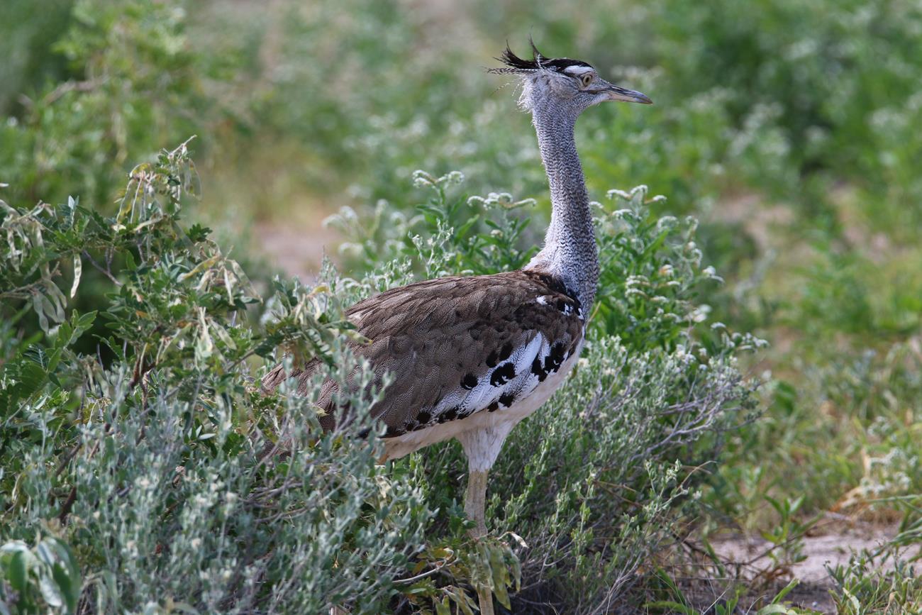 Ha une Kori l’outarde. Silencieuse et peu craintive, elle se déplace lentement à la recherche de nourriture. C’est l’un des oiseaux capables de voler les plus lourds du monde.