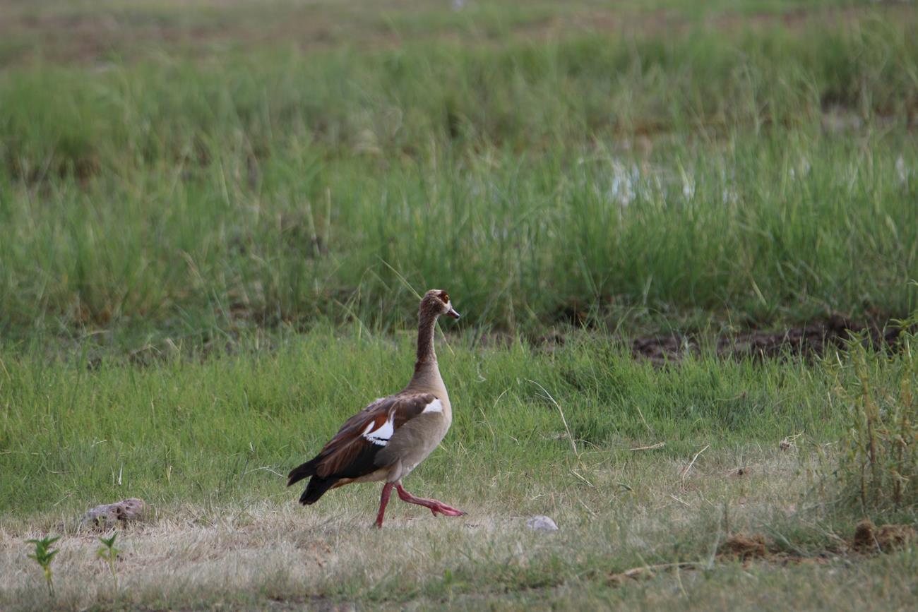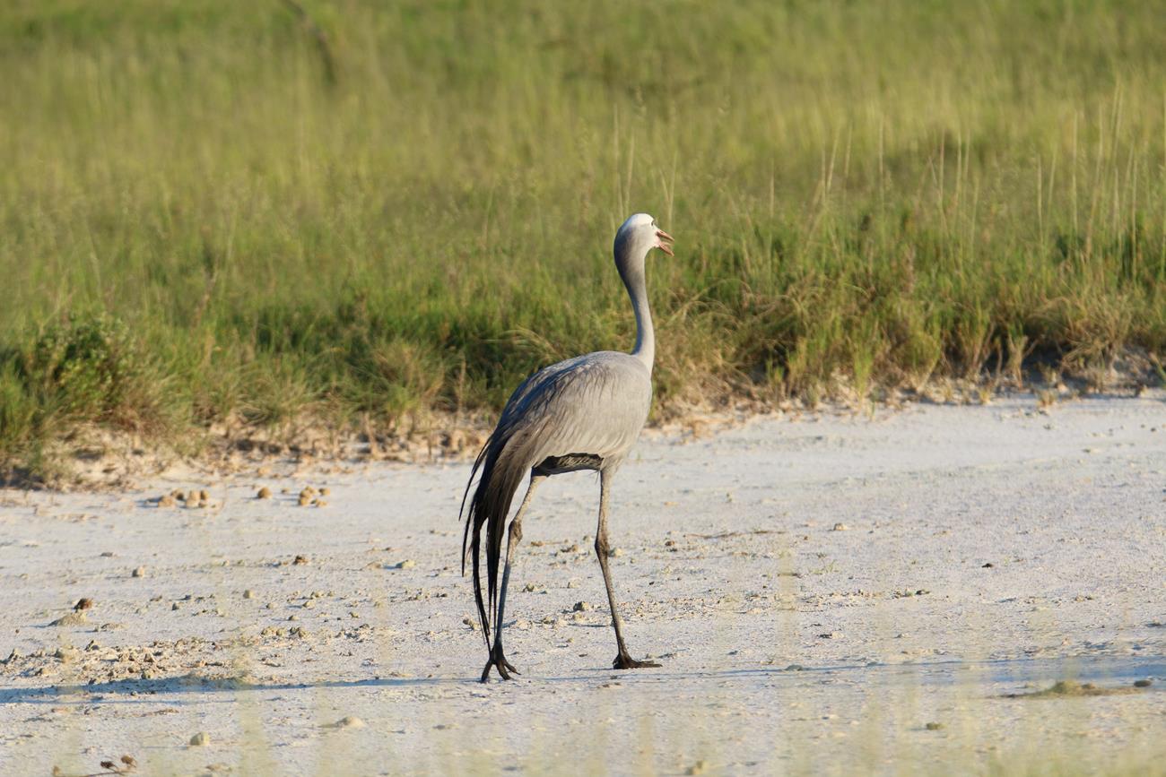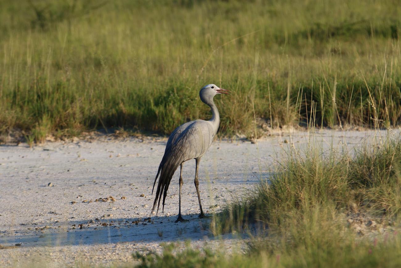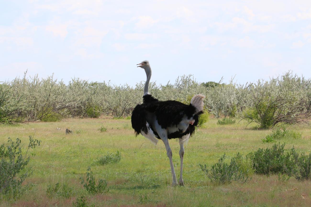 Ha une Kori l’outarde. Silencieuse et peu craintive, elle se déplace lentement à la recherche de nourriture. C’est l’un des oiseaux capables de voler les plus lourds du monde.