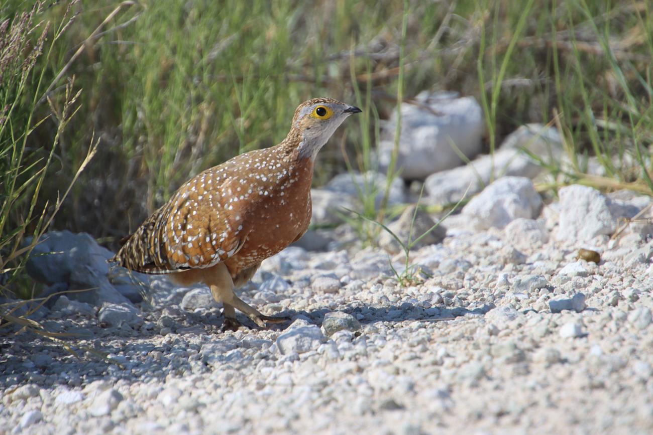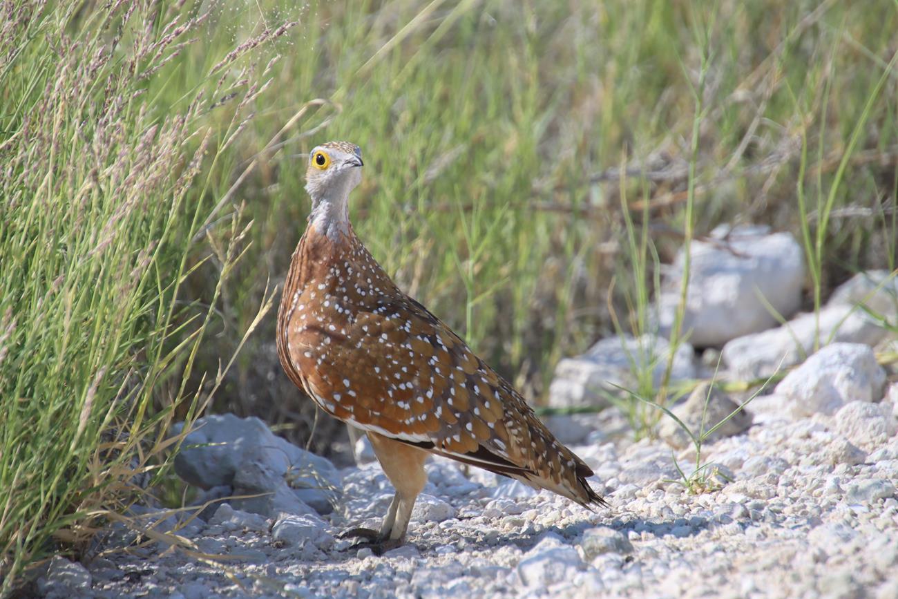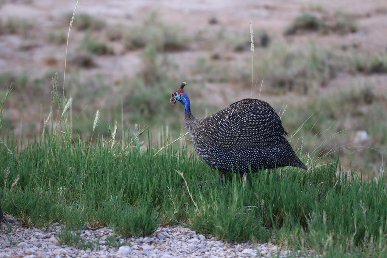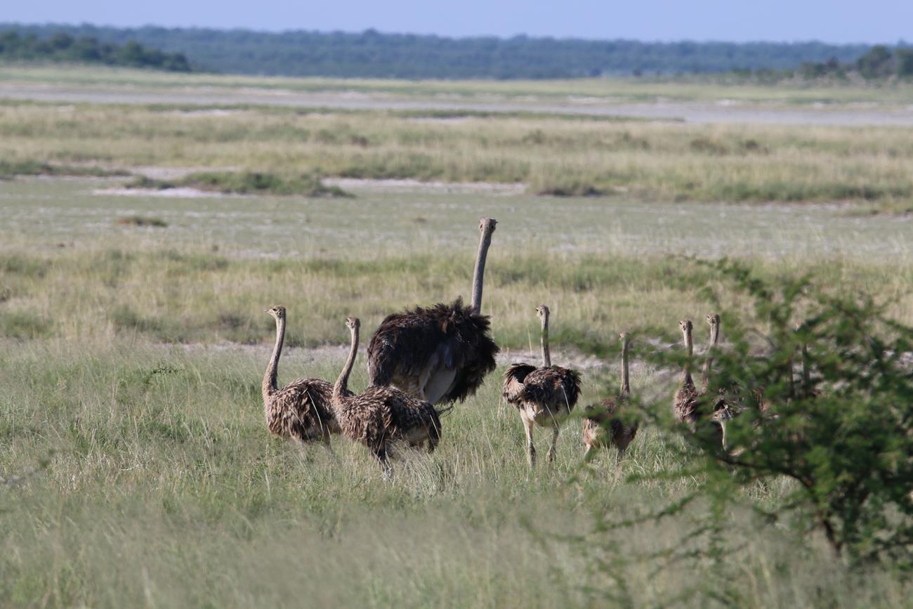 Ha une Kori l’outarde. Silencieuse et peu craintive, elle se déplace lentement à la recherche de nourriture. C’est l’un des oiseaux capables de voler les plus lourds du monde.