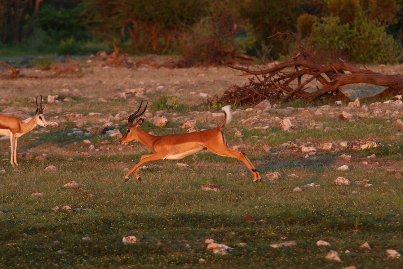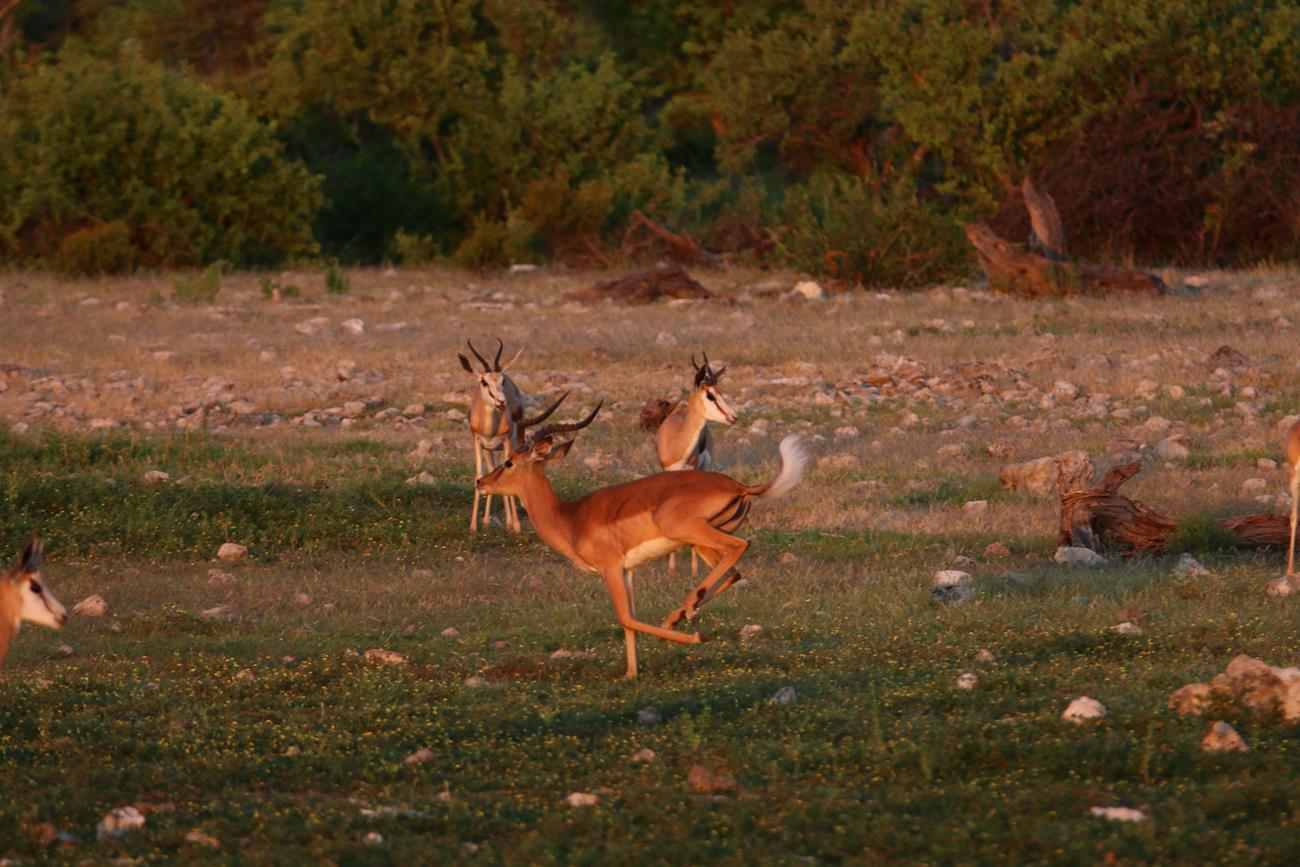 Nous continuons notre ballade des étoiles plein les yeux. Au point d’eau des dizaines d’antilopes complètement euphoriques. Elles sautent et courent dans tous les sens. Notre guide nous explique qu’elles sont tout simplement folles de joie car il y a à manger, de l’ eau et qu’il ne fait pas chaud ( le matin).