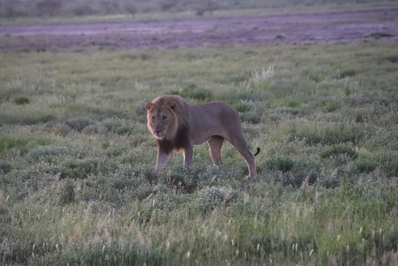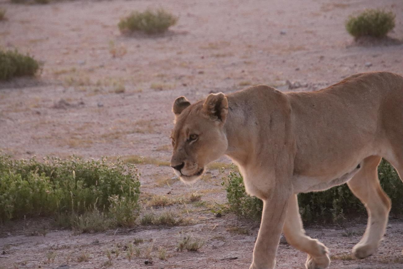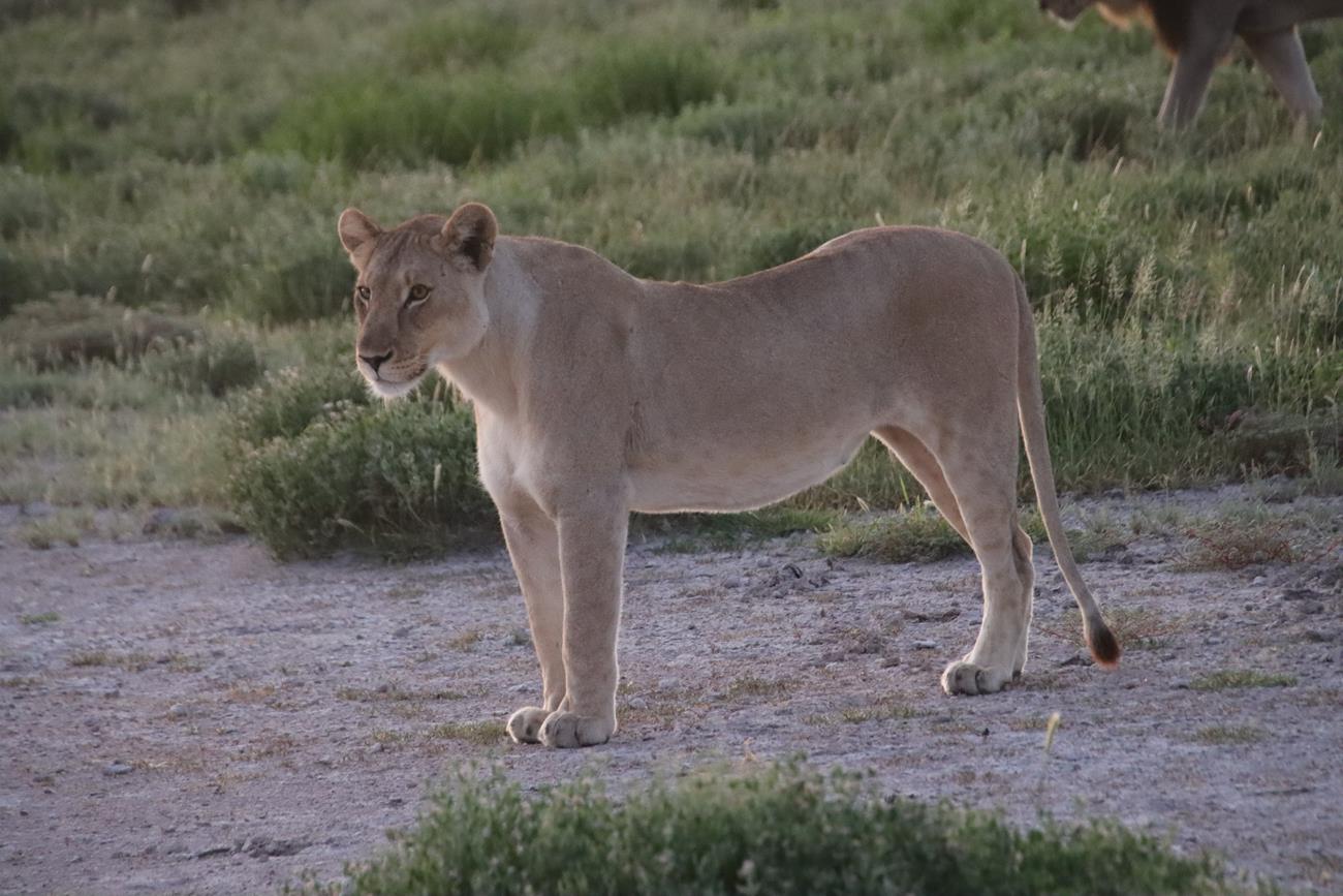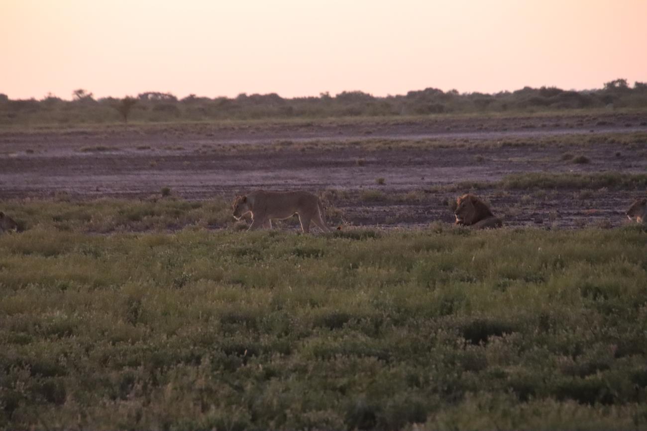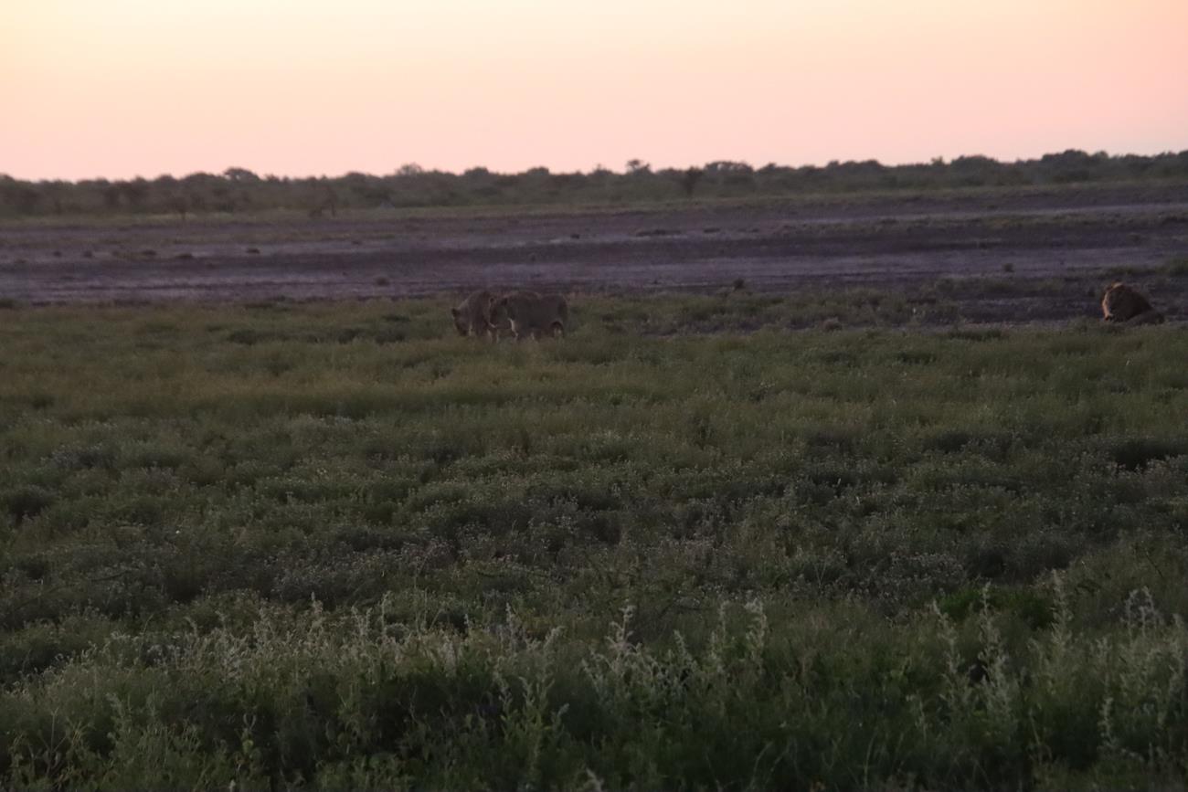 Le jour commence à se lever, et là par contre c’est extra. Soudain la voiture s’arrête et Fatima pointe le doigt vers la gauche. Là,au milieu de la prairie, 2 lionnes et 1 lion.