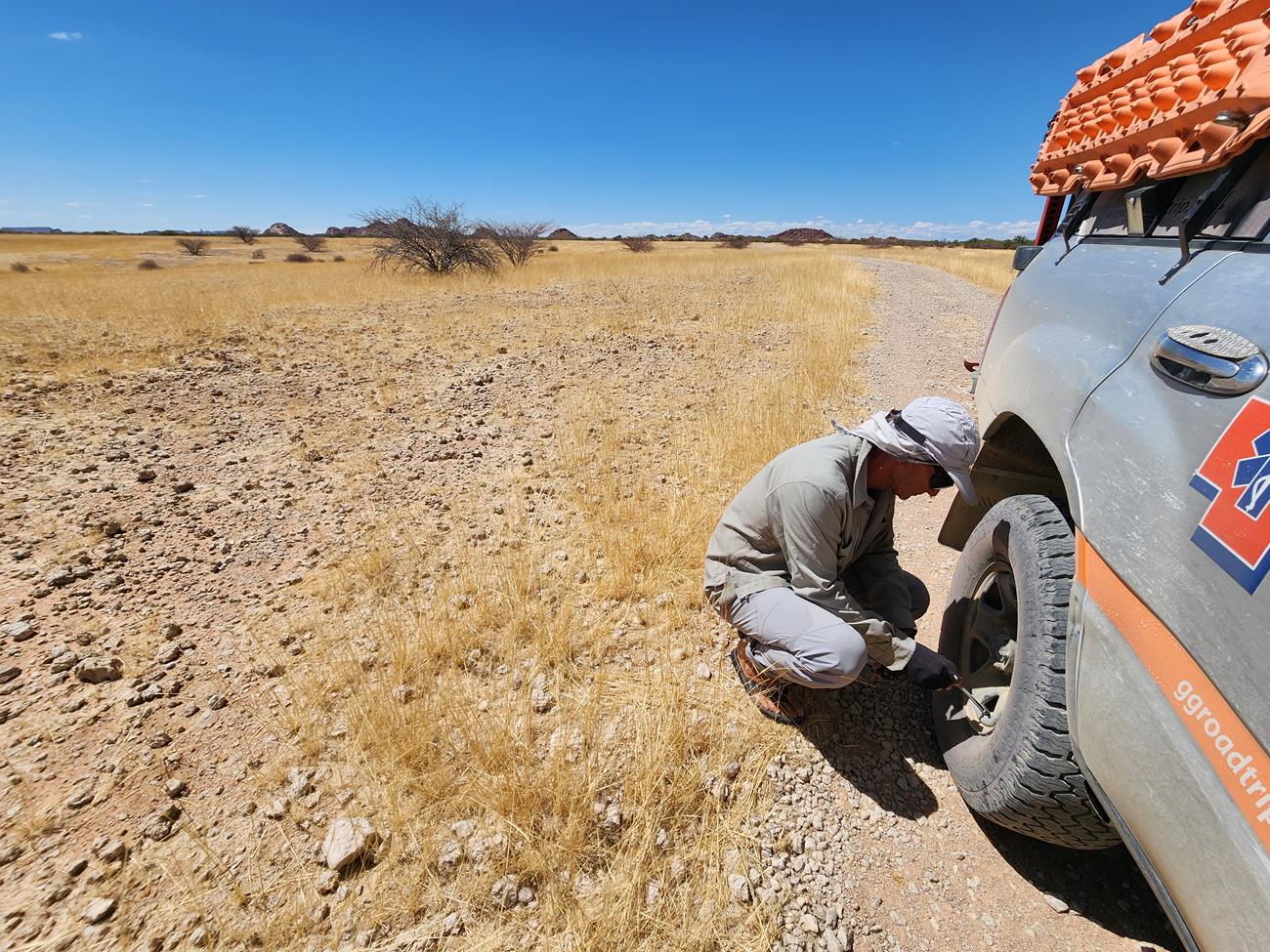 Alors cette fois, rien à faire des pneus. Nous avons 2 roues de secours donc no stress. Mais en fait ils sont costauds. Top pour le sable, stable pour la route et solide pour les cailloux.