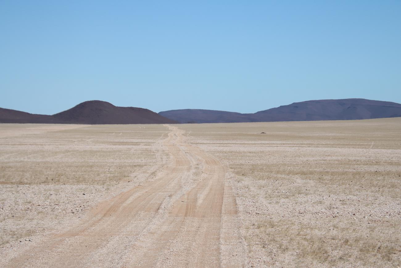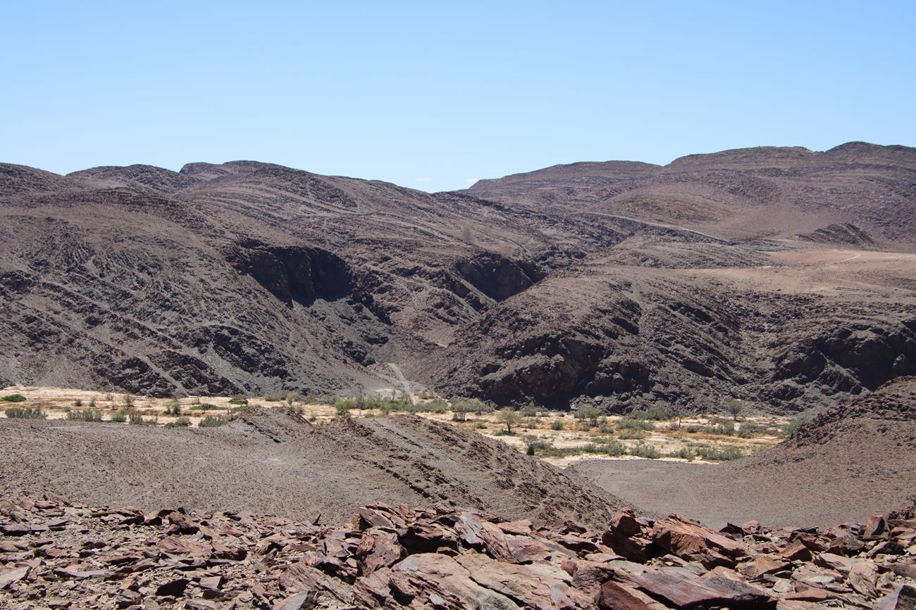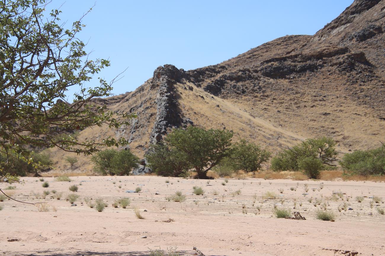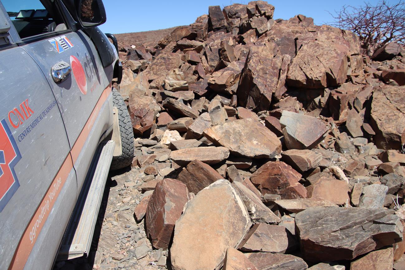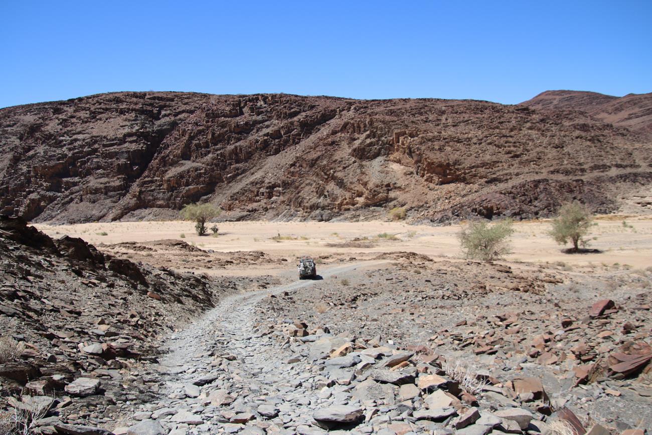 Nous continuons un peu dans le lit de la riviere Ugab, mais il y a encore pas mal d’eau et pour le coup, les pneus ne vont pas du tout dans la gadoue, donc nous décidons de remonter .