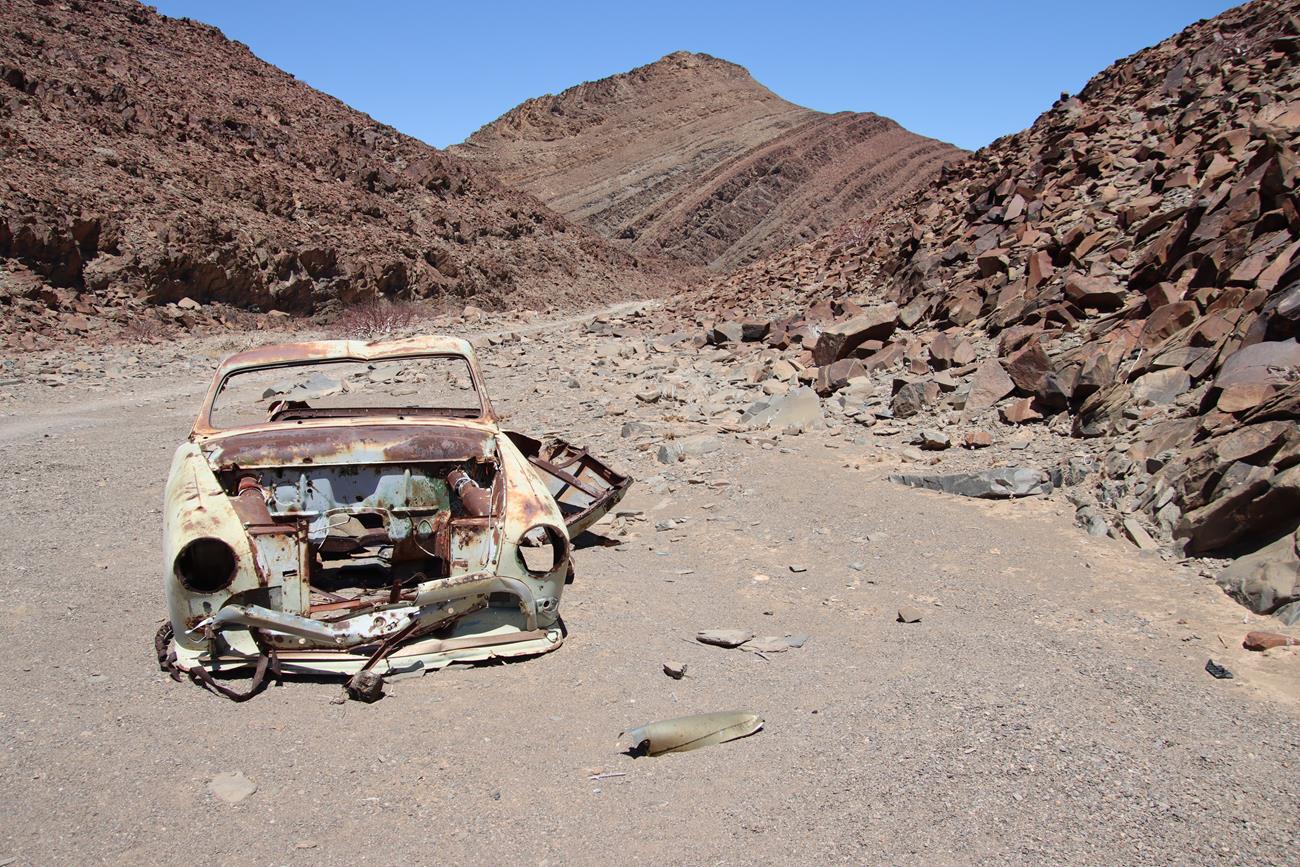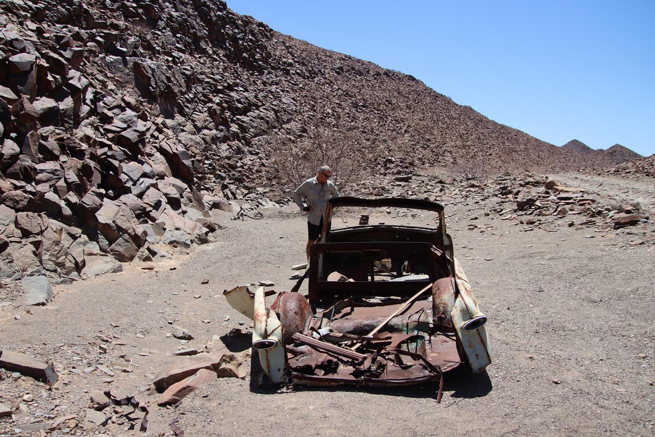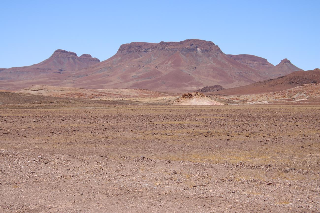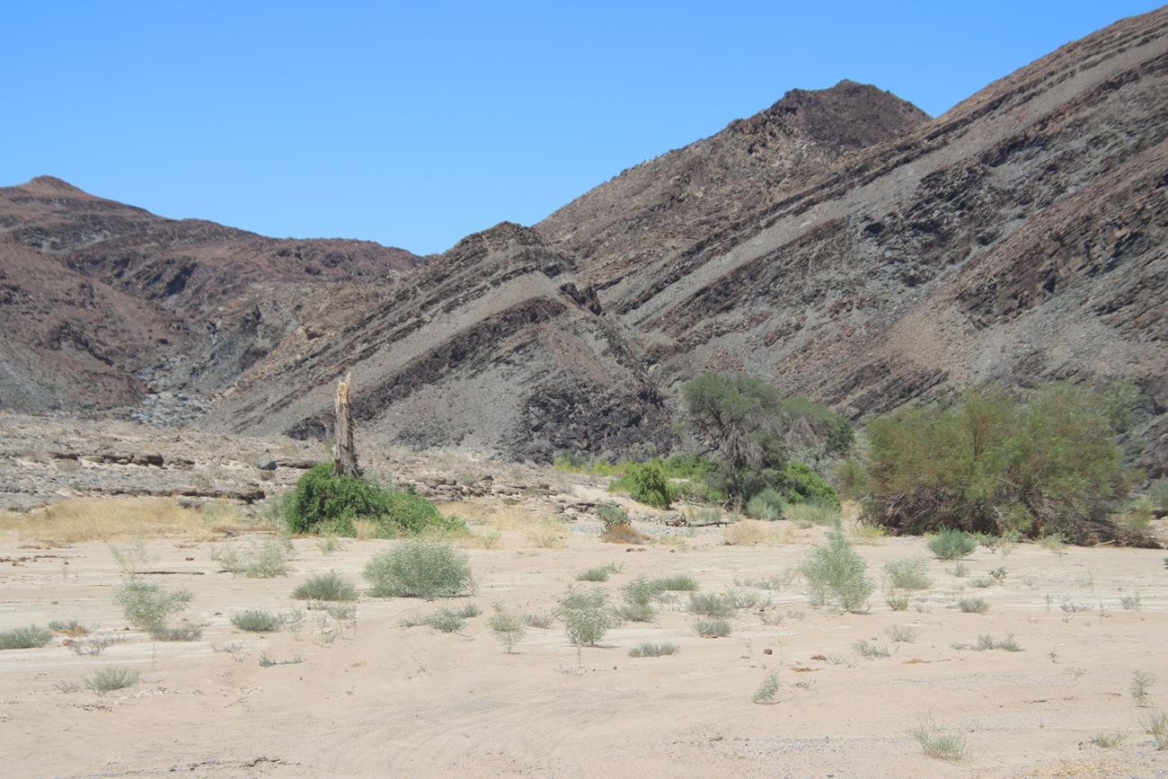 Nous continuons un peu dans le lit de la riviere Ugab, mais il y a encore pas mal d’eau et pour le coup, les pneus ne vont pas du tout dans la gadoue, donc nous décidons de remonter .