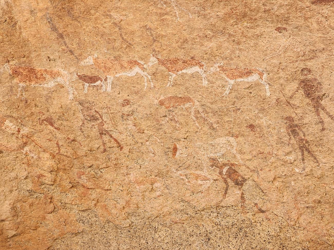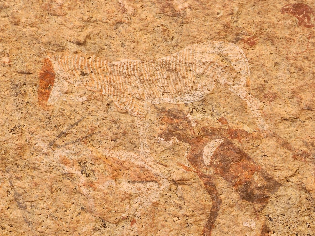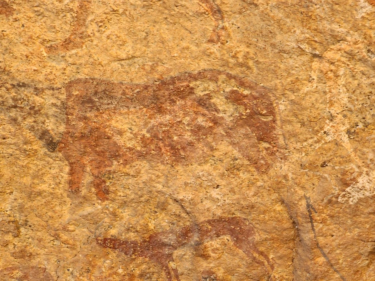 On y voit plusieurs d’autres humains dessinés, ainsi que divers animaux. Des oryx, mais aussi un quagga (espèce qui n’avait pas encore disparu à l’époque de la peinture), une gazelle gérénuk, un gnou et même un manchot !