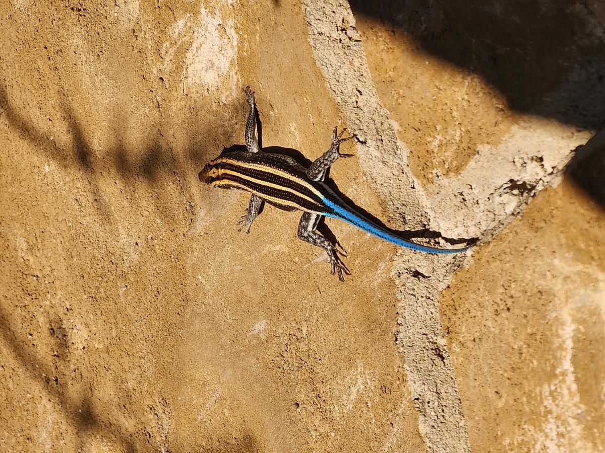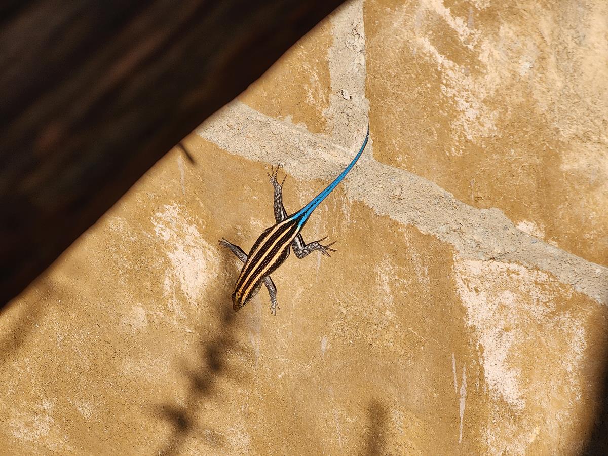 Nous disons aurevoir au petit lézards à queue bleu qui nous tenue compagnie dans le bloc sanitaire.