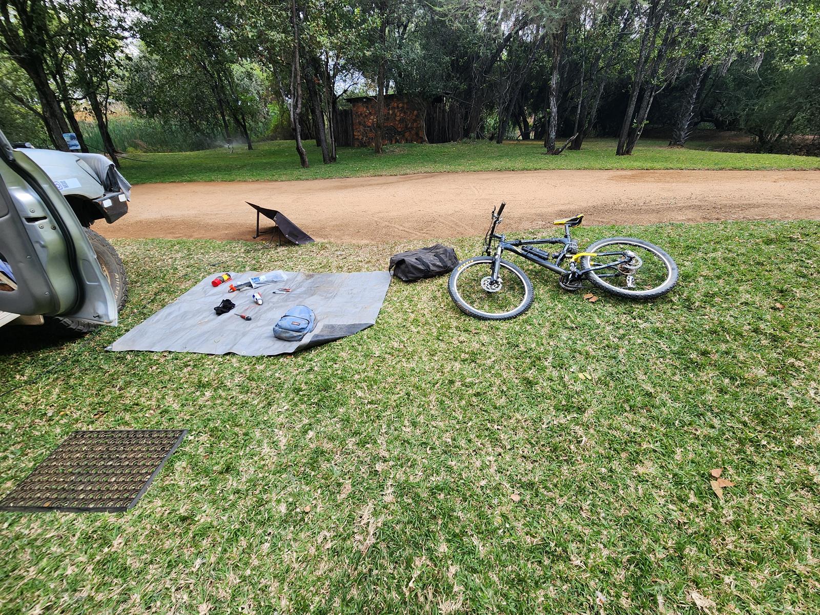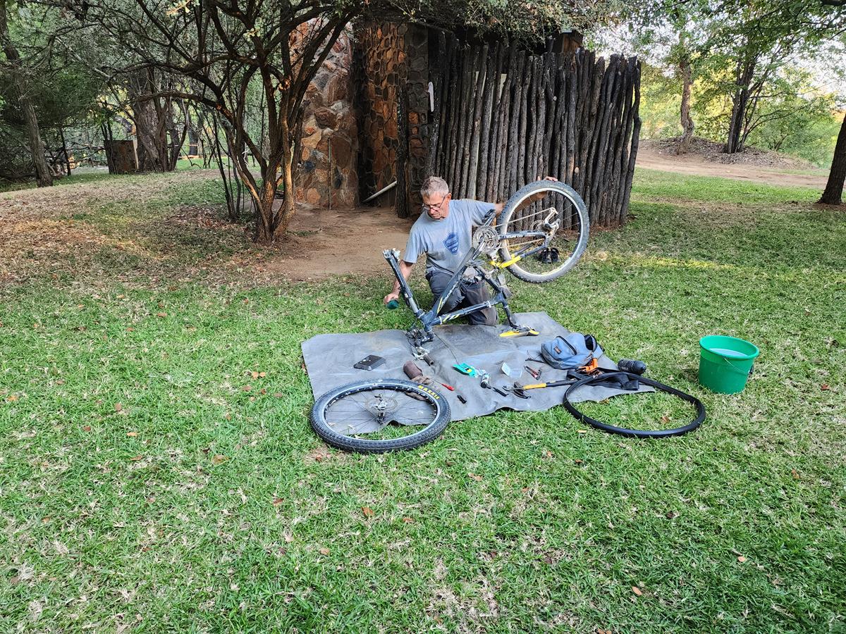Réparation pour la énième fois des crevaison du aux épines d’acacia. Comme il est accroché derrière à chaque passage un peu étroit , paf pchiiiitttt!