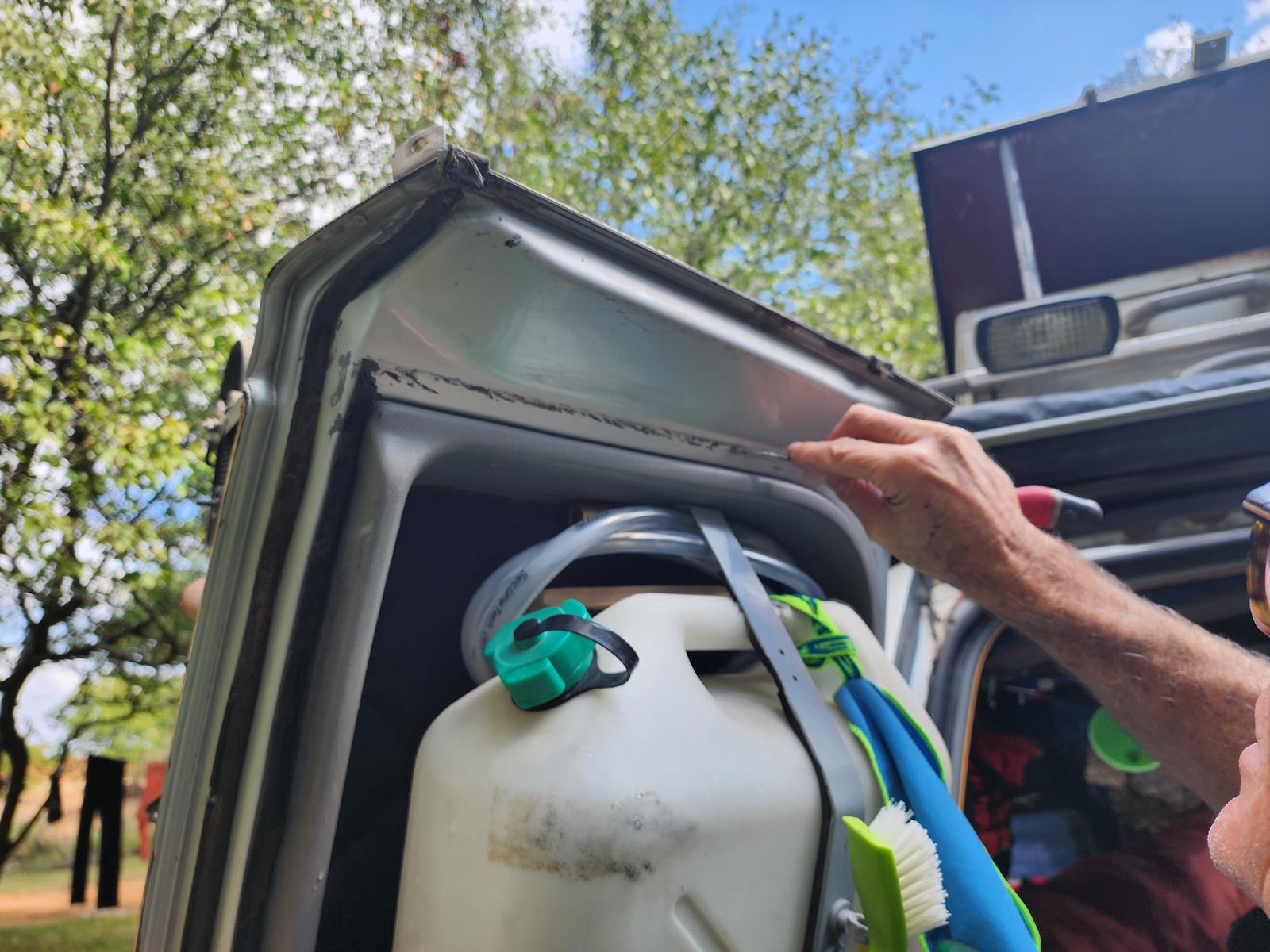 Finalement nous restons un jour de plus. Nettoyage cuisine et Yann continue le bricolage sur le vélo et refait les joins des portes arrières…poussière, tu ne passeras plus, enfin on l’espère !