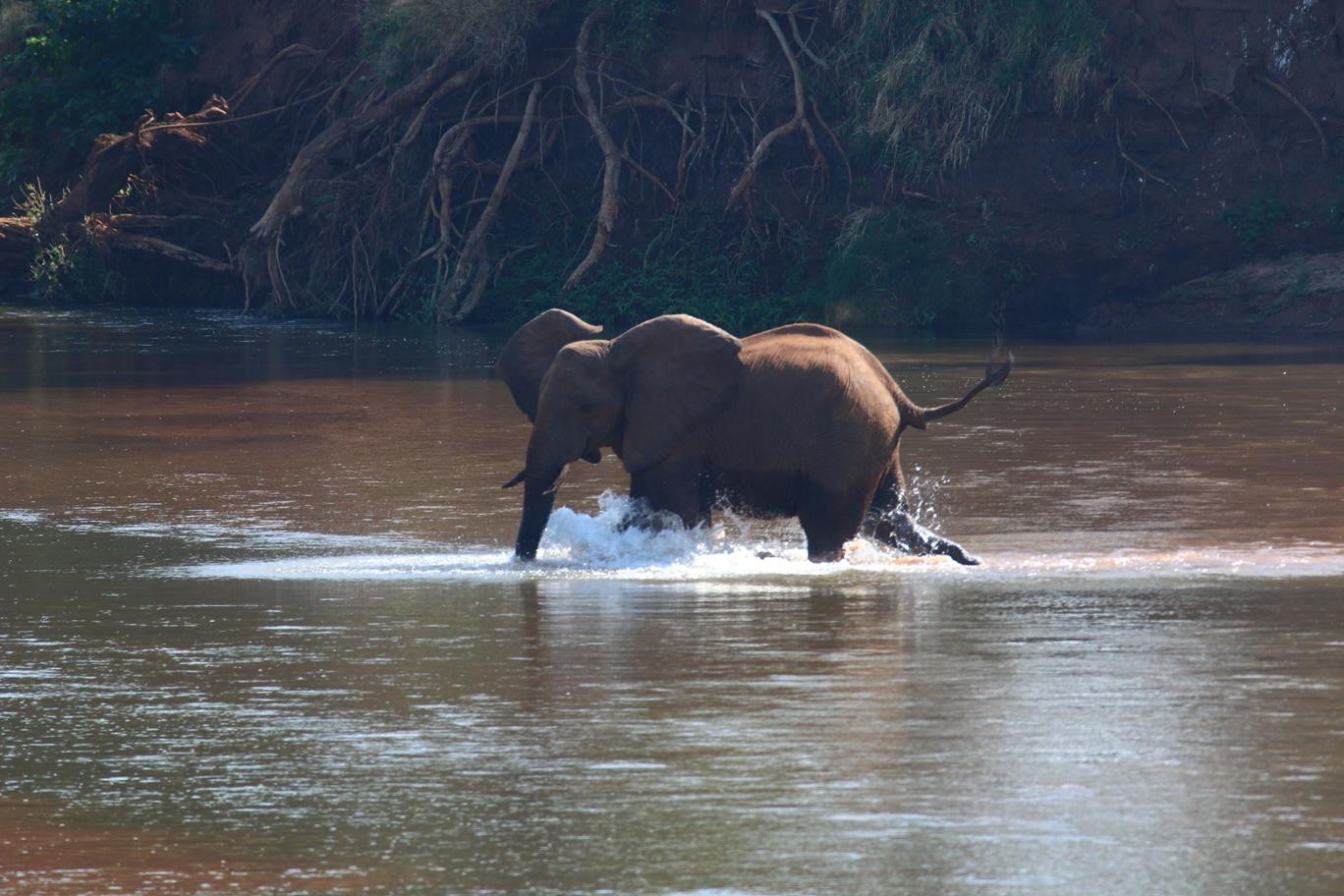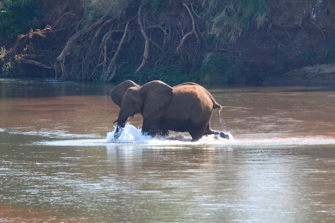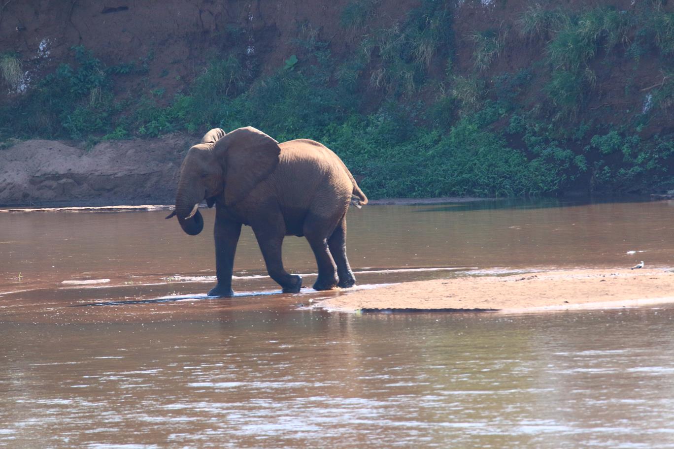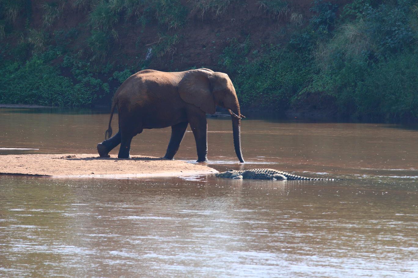 Ici, la scène est surprenante et stressante. L’éléphant avance d’un pas bien décidé vers un petit ilôt de sable qui semble bien gardé par Sieur Croco .