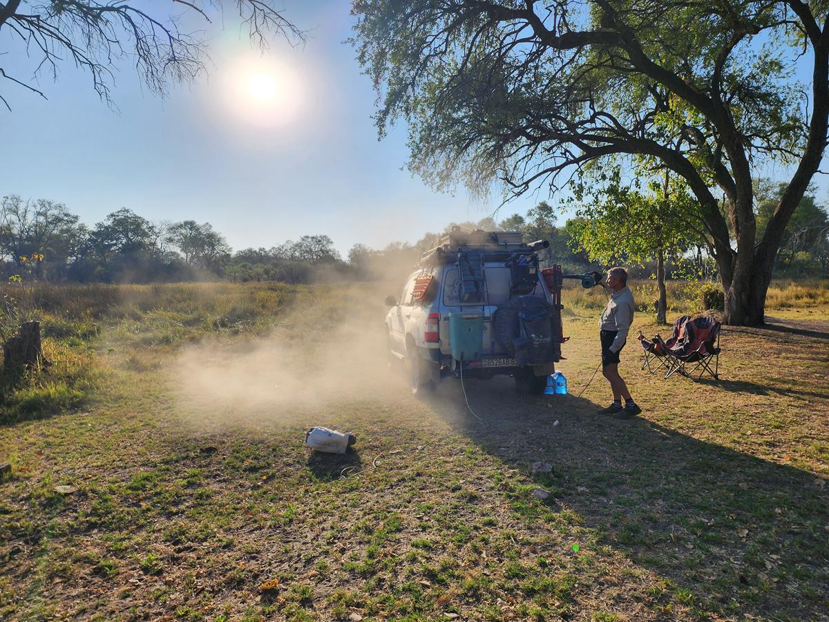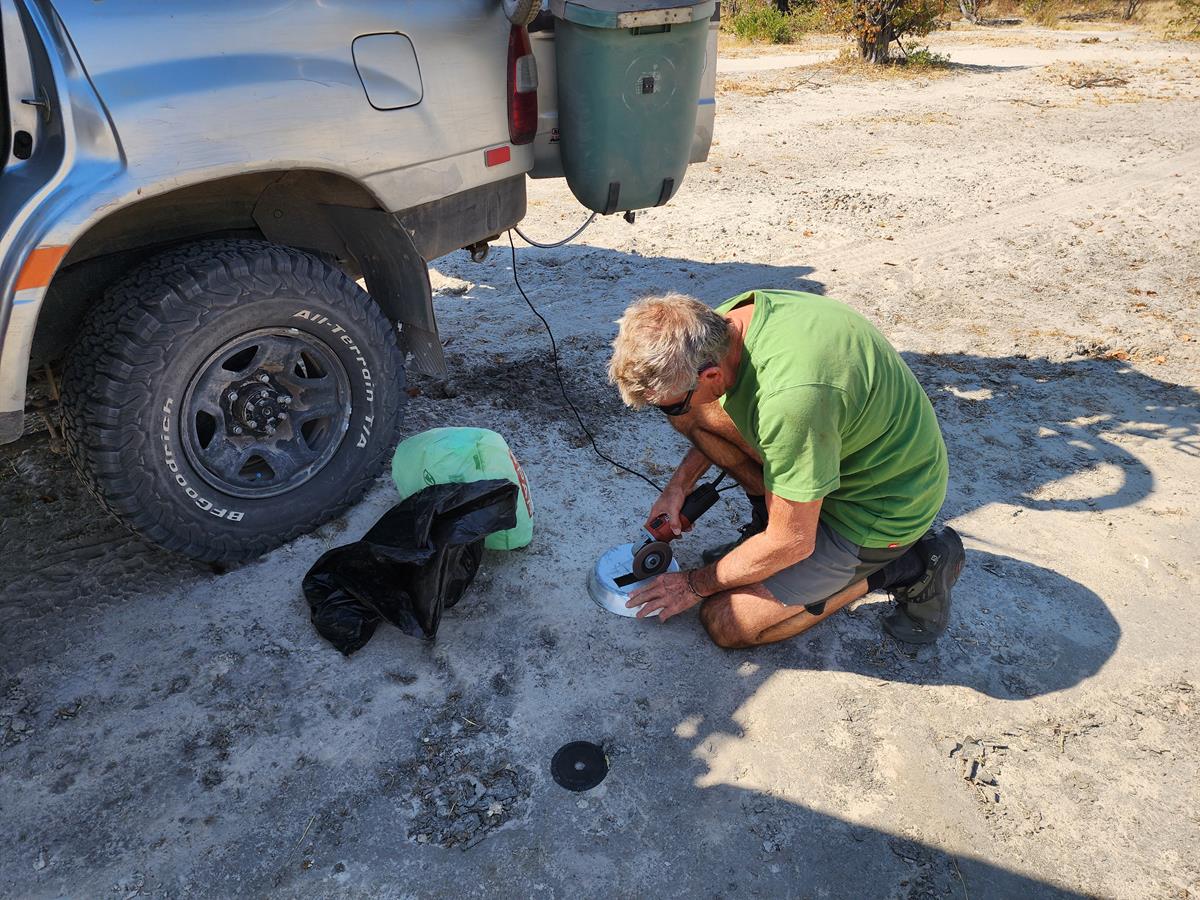 Nous arrivons à Maun en début d’après midi, direction le même camping que la dernière fois, le Sédia. Nous nous installons et là ,NONNNNNNNN , Yann a coupé complètement le contact. Neiman bloqué une fois de plus. Bien, demain sera un autre jour et, cette fois, Neiman va goutter à la disqueuse !