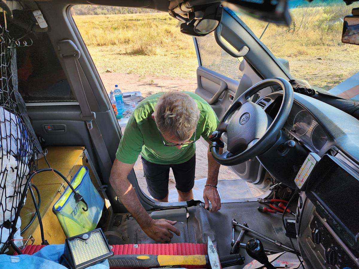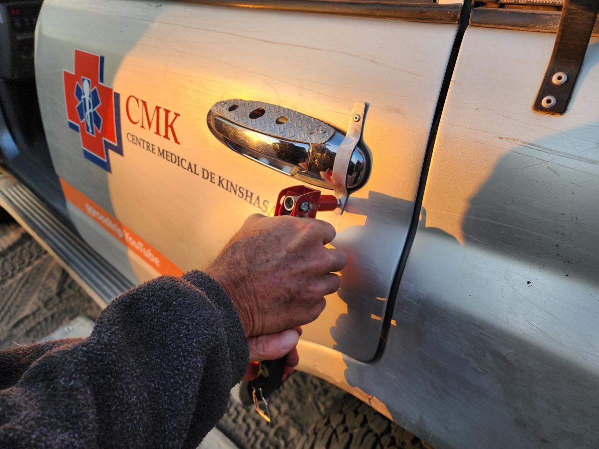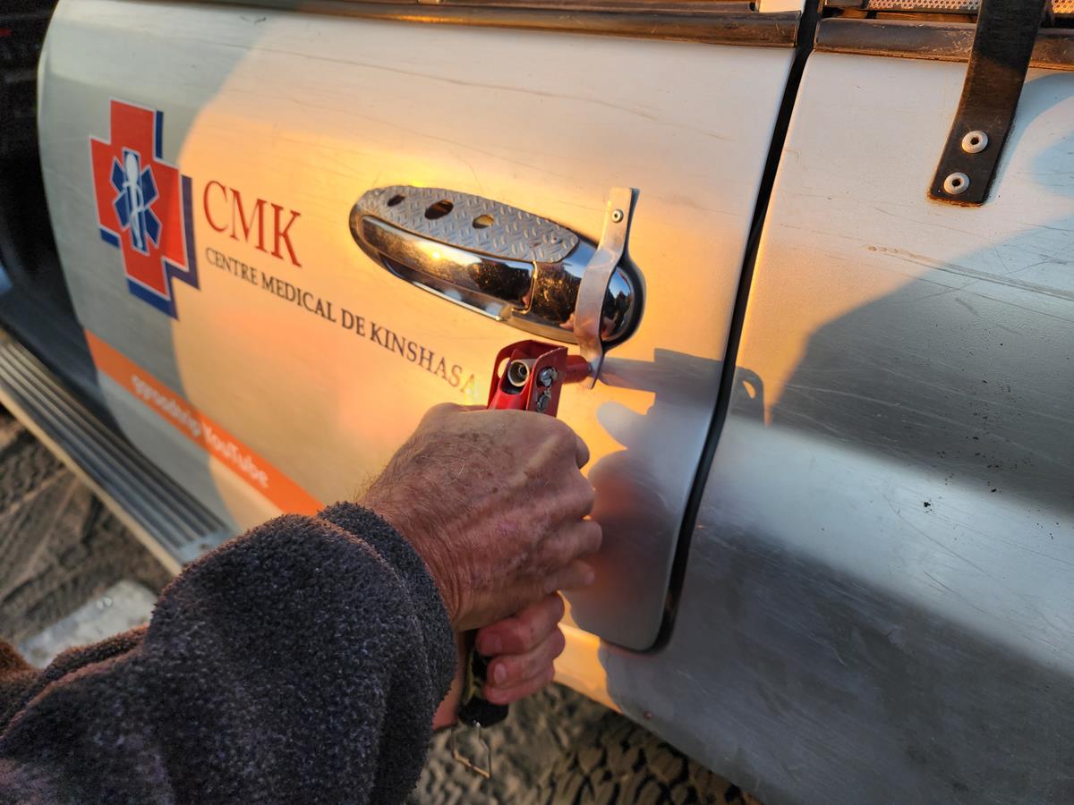 Avant d’arriver au camping Yannick prépare deux morceaux de tôle coupés dans une poêle qu’il avait acheté pour réparer la poignée de mon côté qui ne tenait plus à cause des policiers kinois qui veulent souvent entrer de force dans les véhicules.