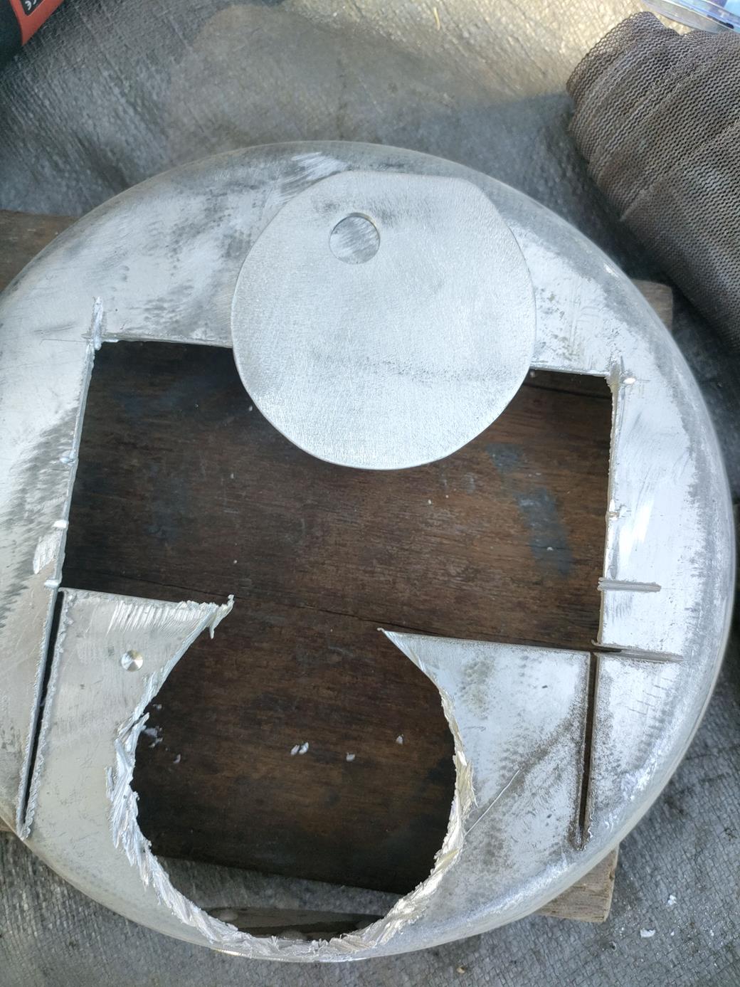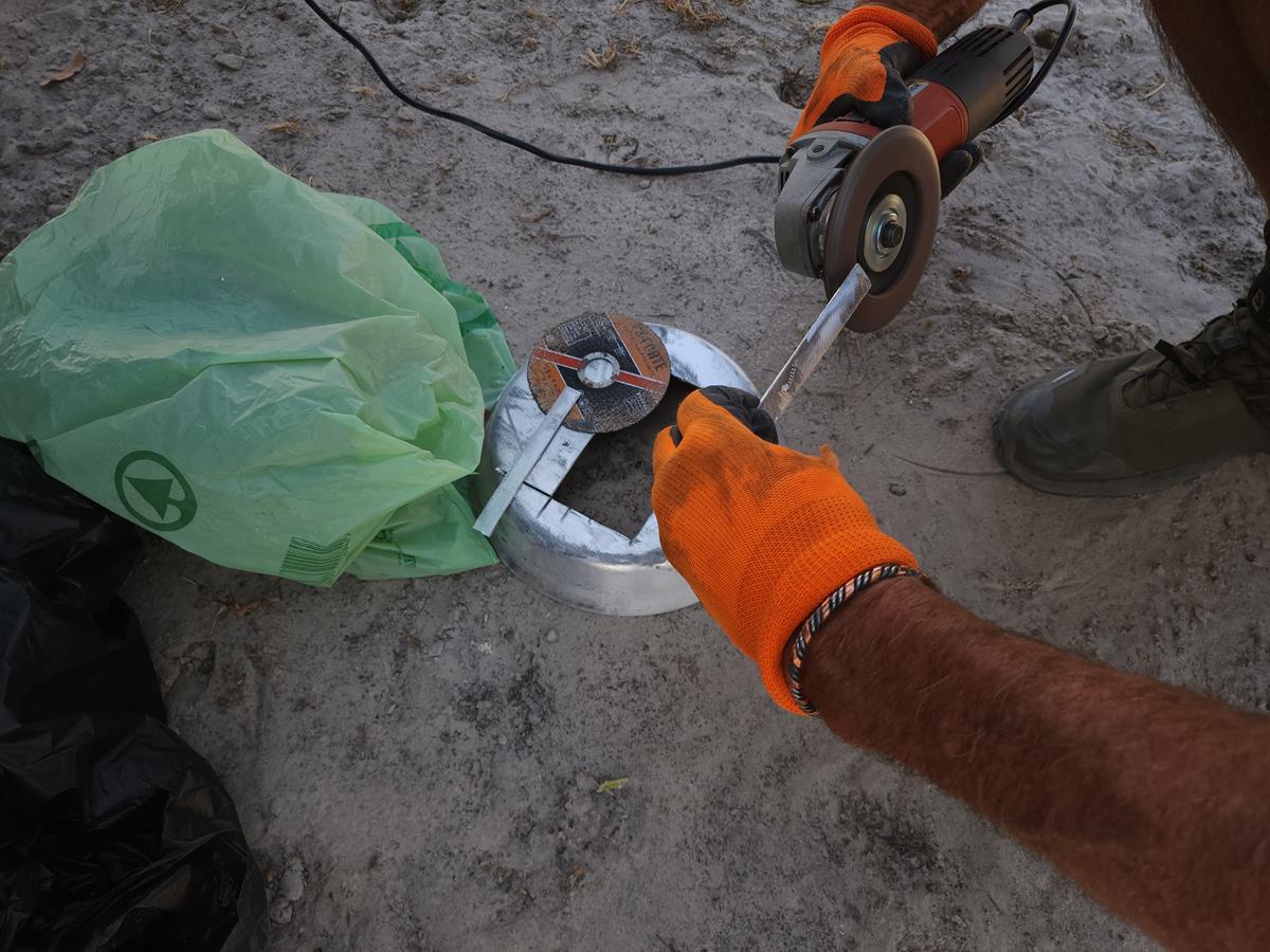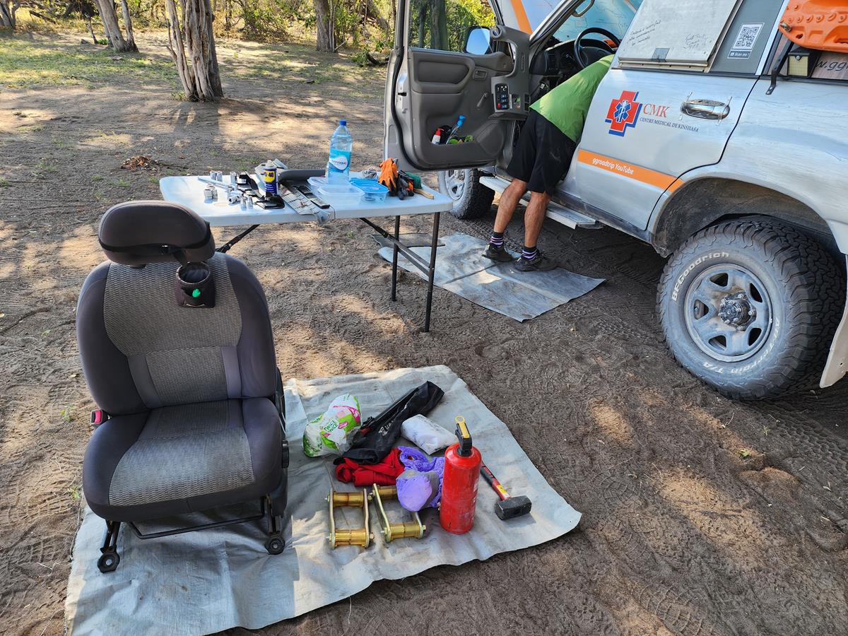 Avant d’arriver au camping Yannick prépare deux morceaux de tôle coupés dans une poêle qu’il avait acheté pour réparer la poignée de mon côté qui ne tenait plus à cause des policiers kinois qui veulent souvent entrer de force dans les véhicules.