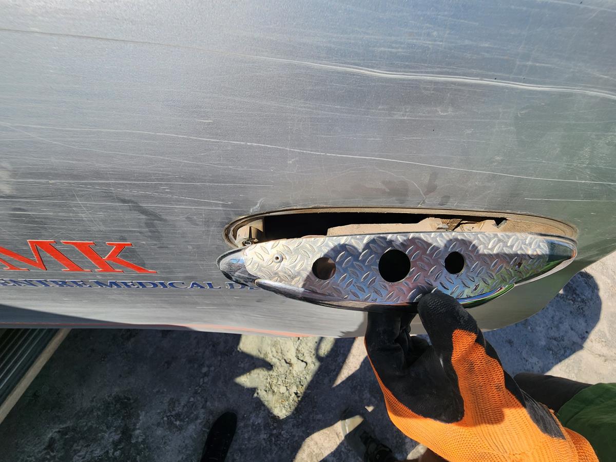Nous avons du bois sur la galerie et un morceau est tombé juste sur la poignée arrière et l’a tout simplement cassée.