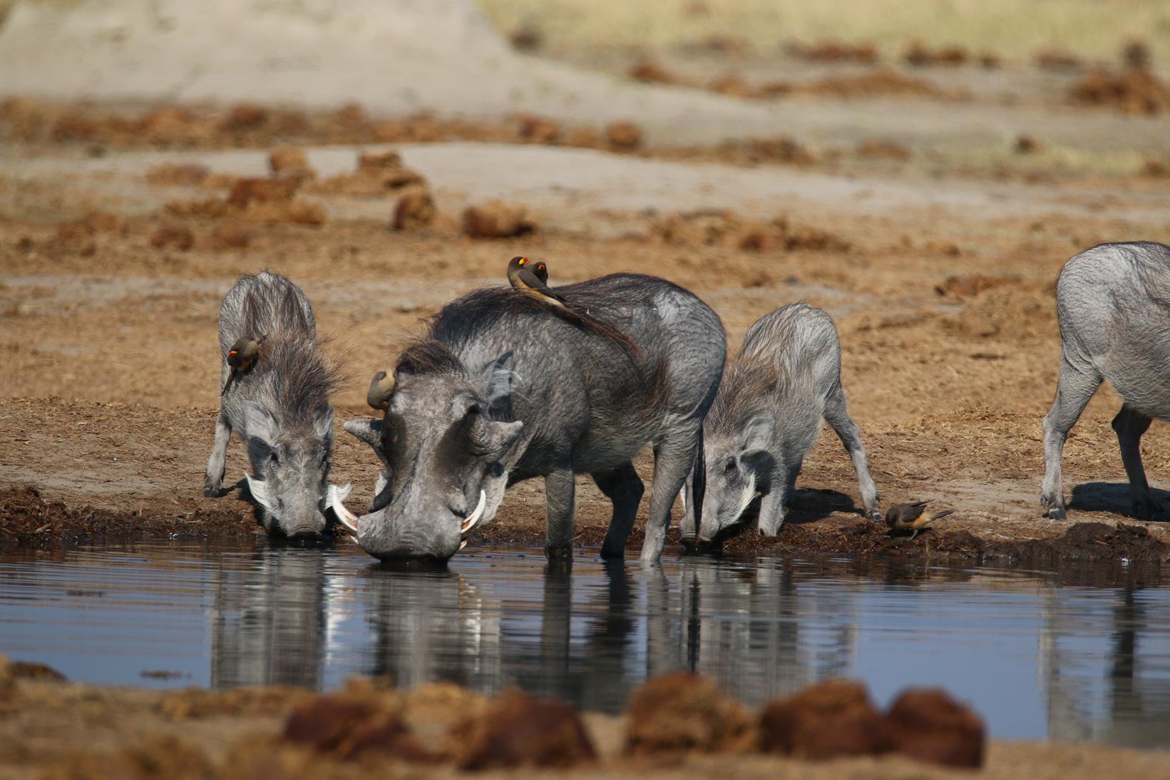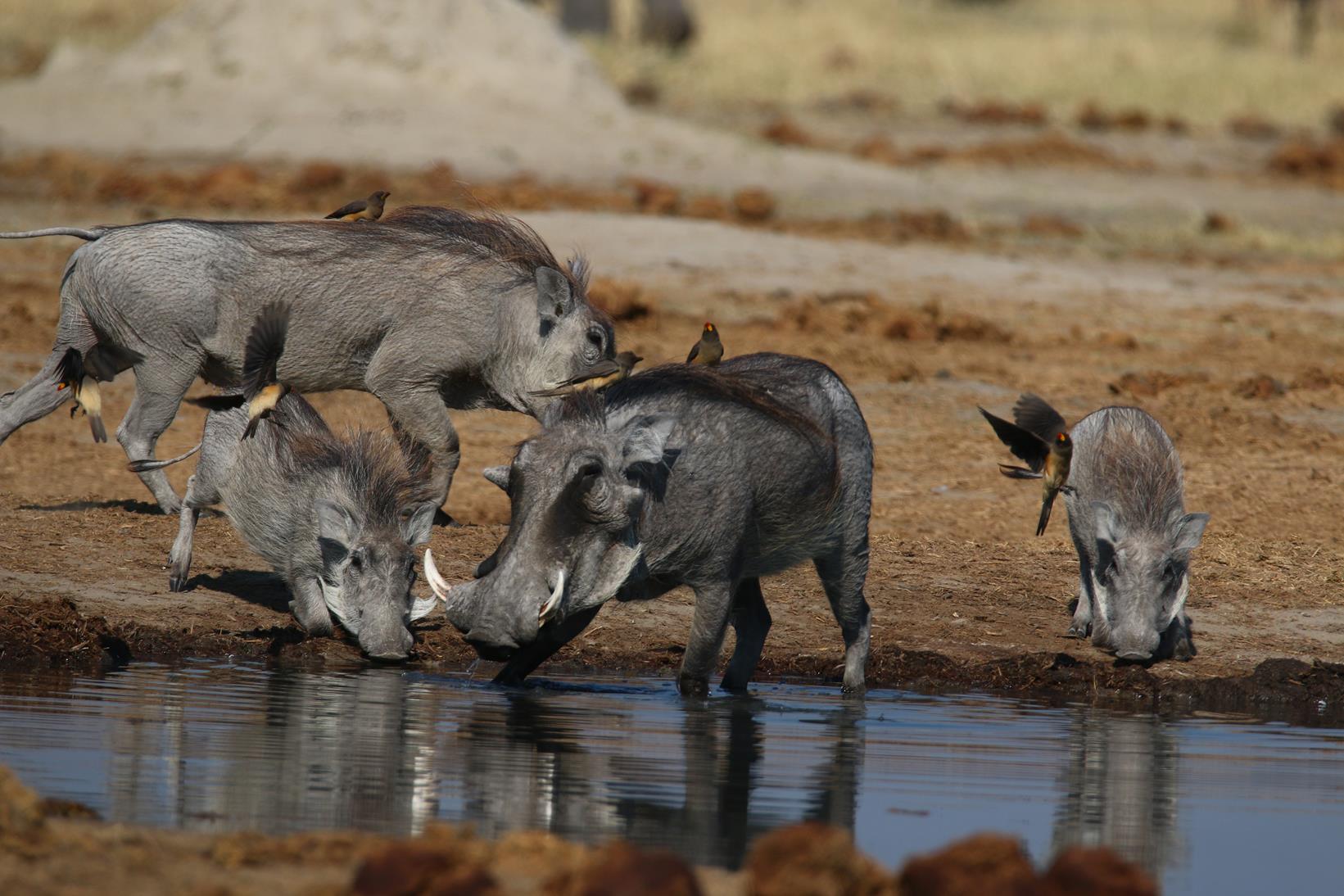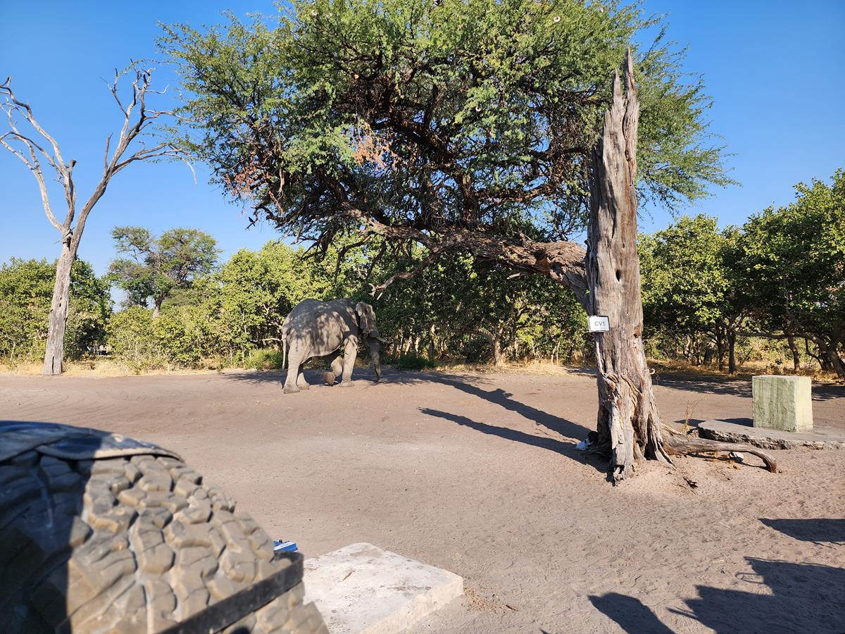 En fin d’après midi, visite de Babar encore, c’est normal et courant au Botswana, mais nous sommes toujours impressionnés surtout depuis que celui de Nxai Pan a plié notre fauteuil !