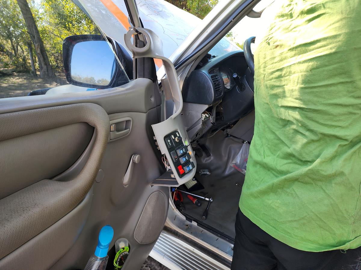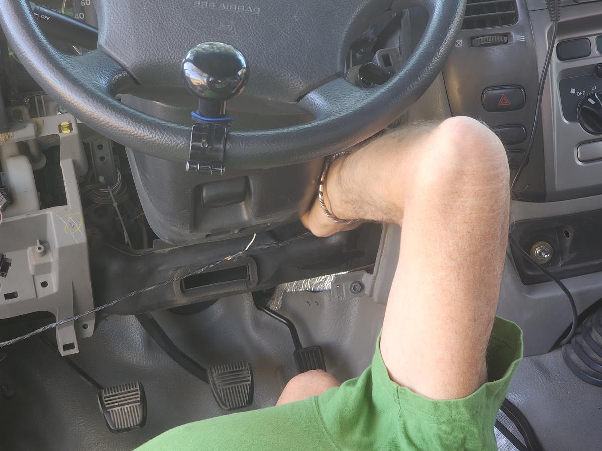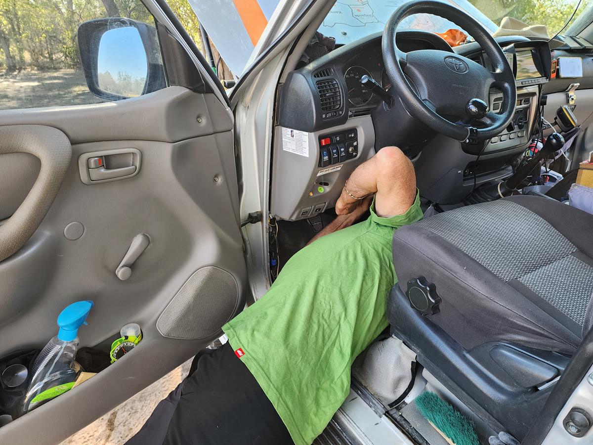 Il s’agit maintenant de tout remonter. À un certain moment j’entends « mais quel con, mais quel con j’ai coupé le fils de la climatisation » ah oui là par contre pas bon. Il faut trouver d’autres câbles pour allonger le fils que Yann a coupé au ras.