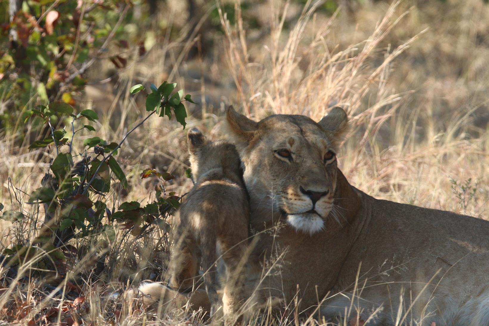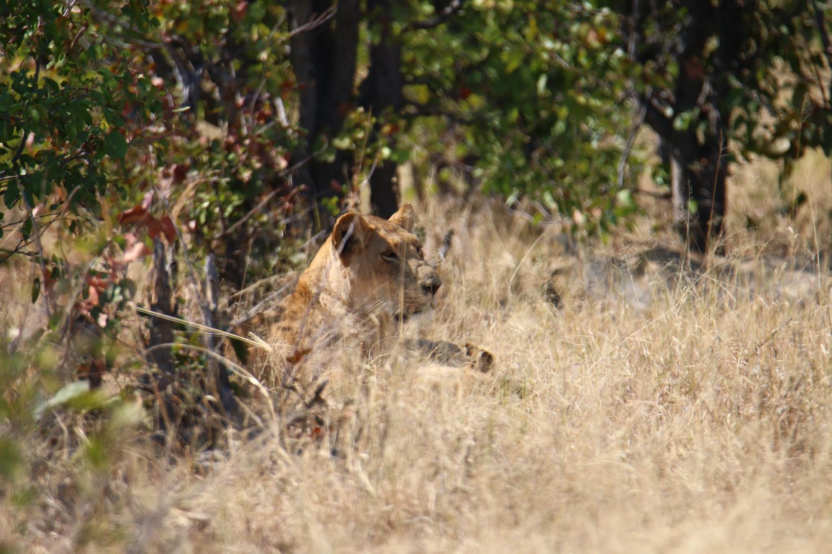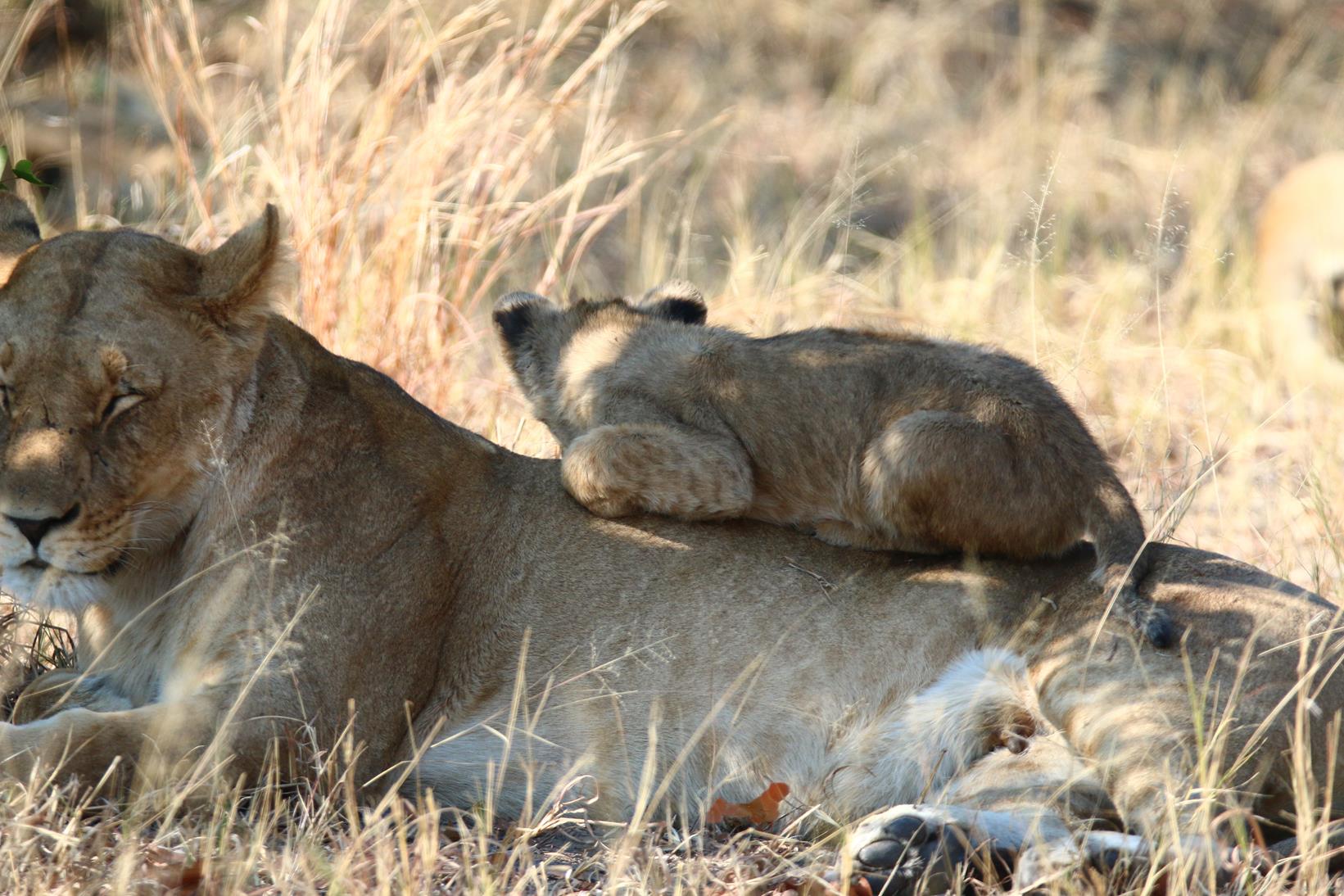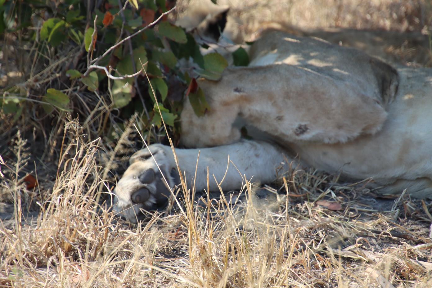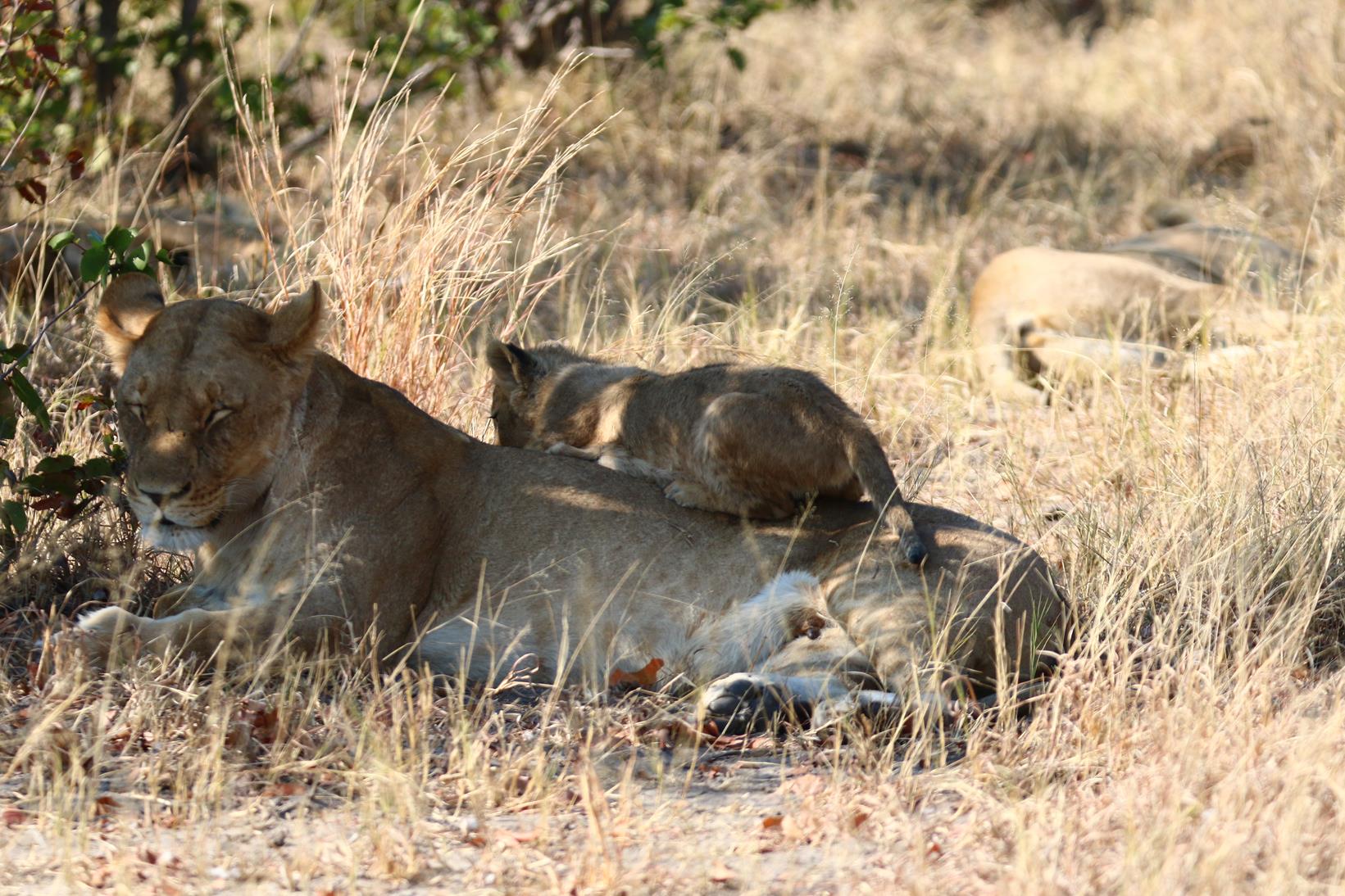 Une voiture vient à côté de nous et nous dit qu’il y a 9 lions juste à côté. Demi-tour et effectivement ils sont là, couchés avec des petits. Un guide se joint à nous et avance plus prés. Nous faisons pareil, il nous dit rien. C’a n’est pas vraiment la piste mais c’est tout comme.