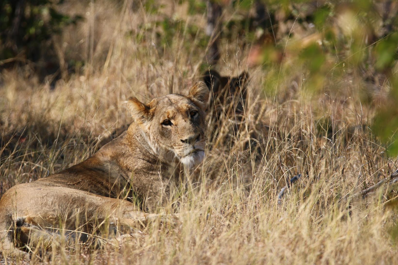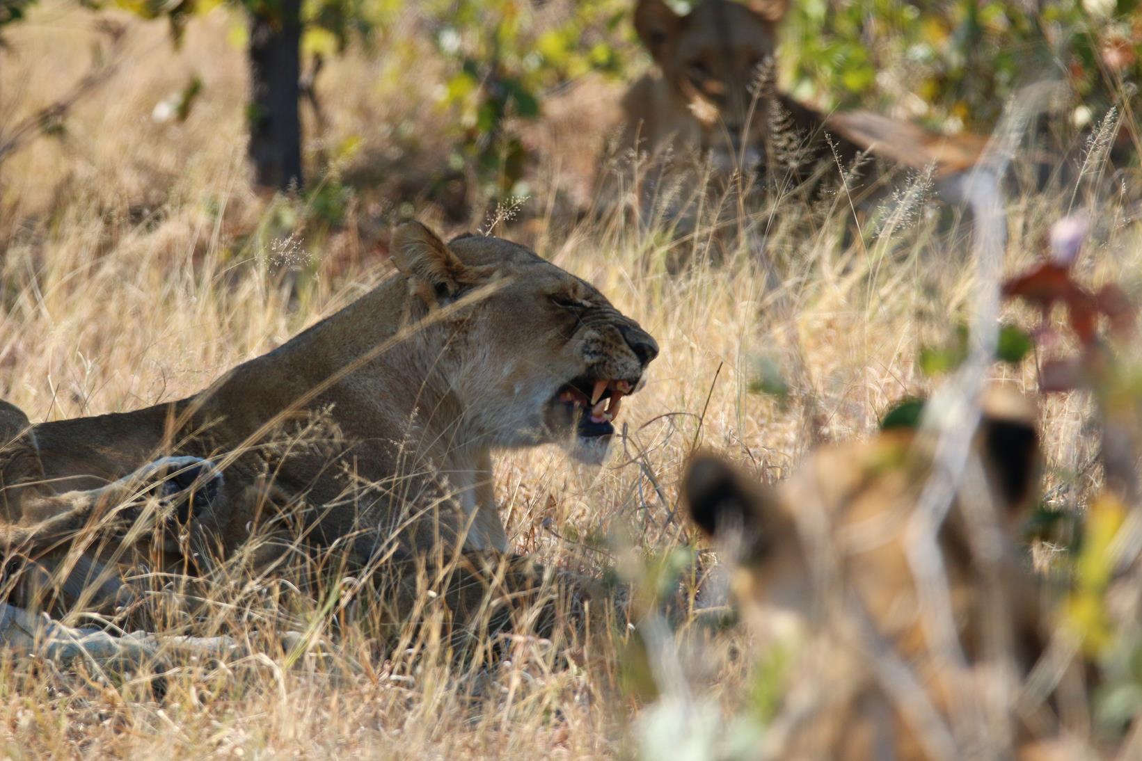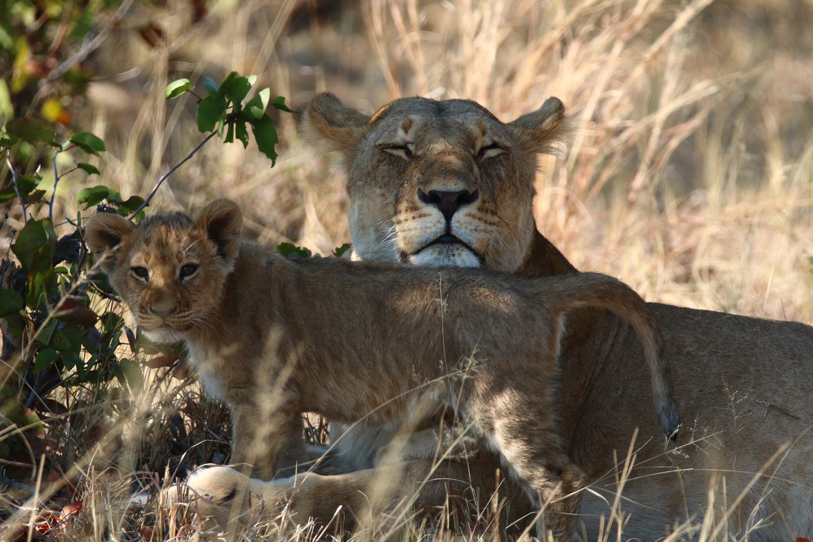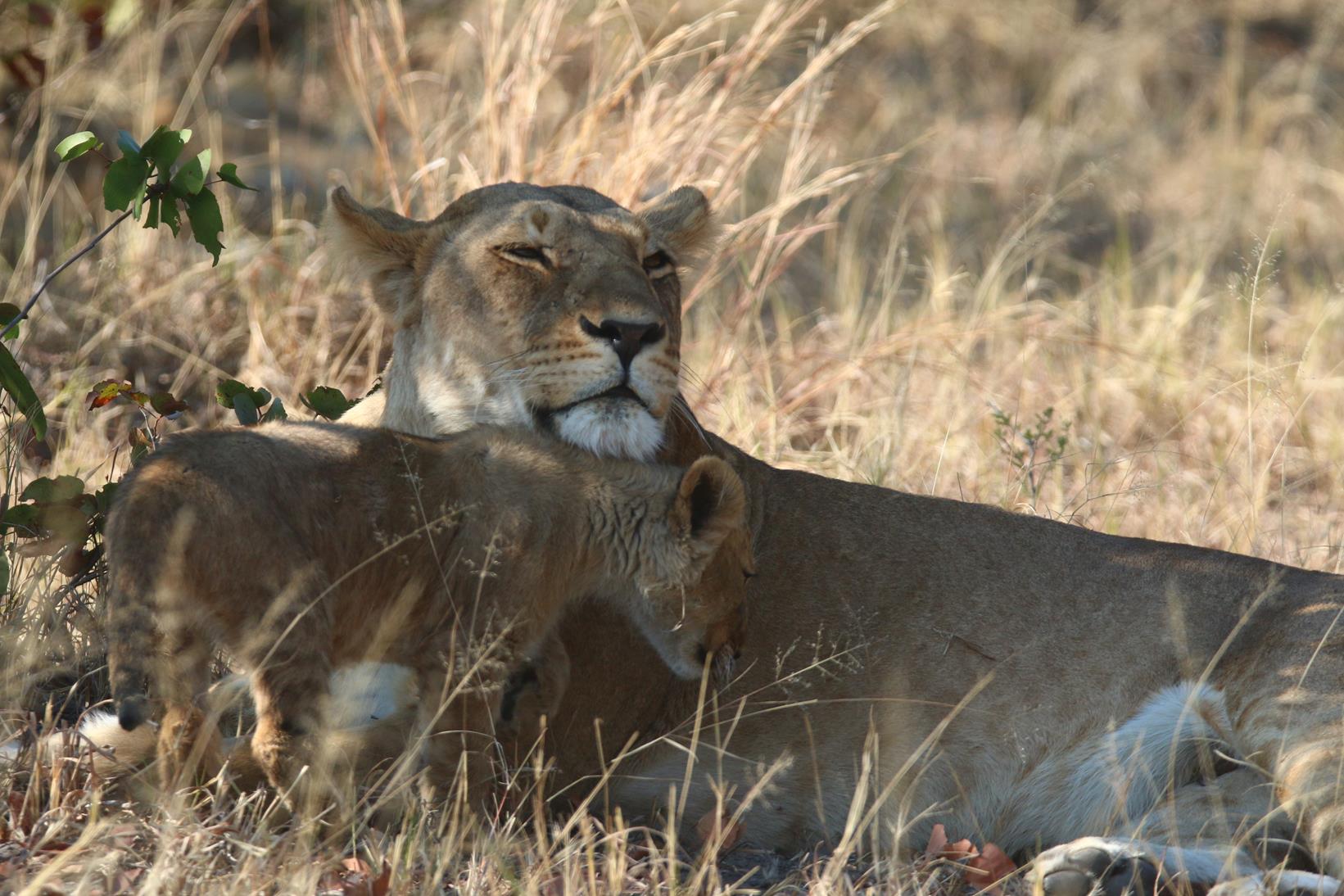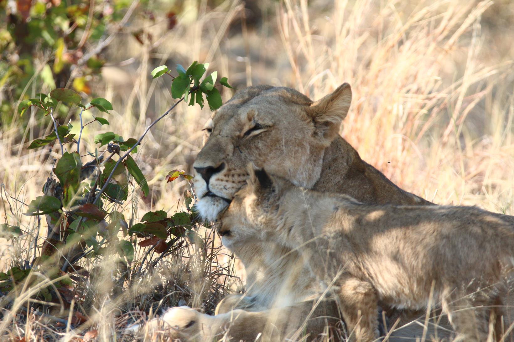 Une voiture vient à côté de nous et nous dit qu’il y a 9 lions juste à côté. Demi-tour et effectivement ils sont là, couchés avec des petits. Un guide se joint à nous et avance plus prés. Nous faisons pareil, il nous dit rien. C’a n’est pas vraiment la piste mais c’est tout comme.