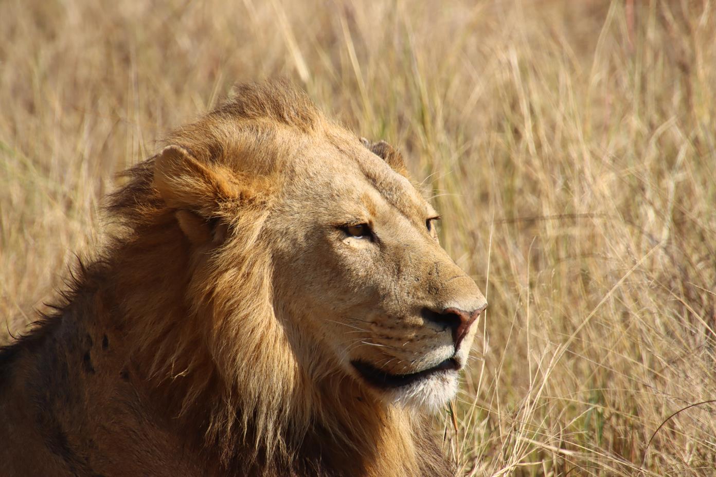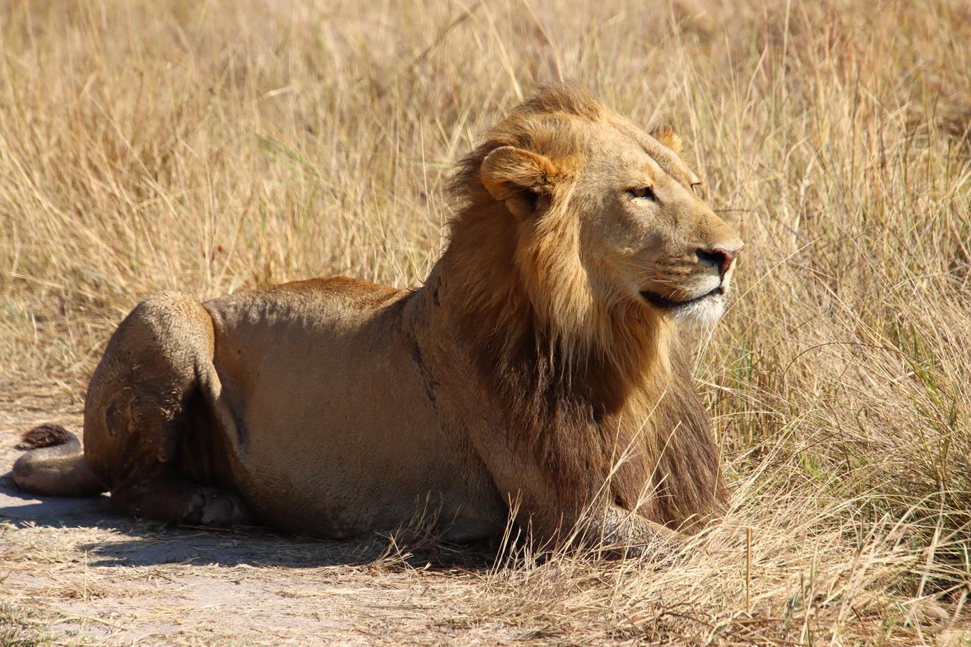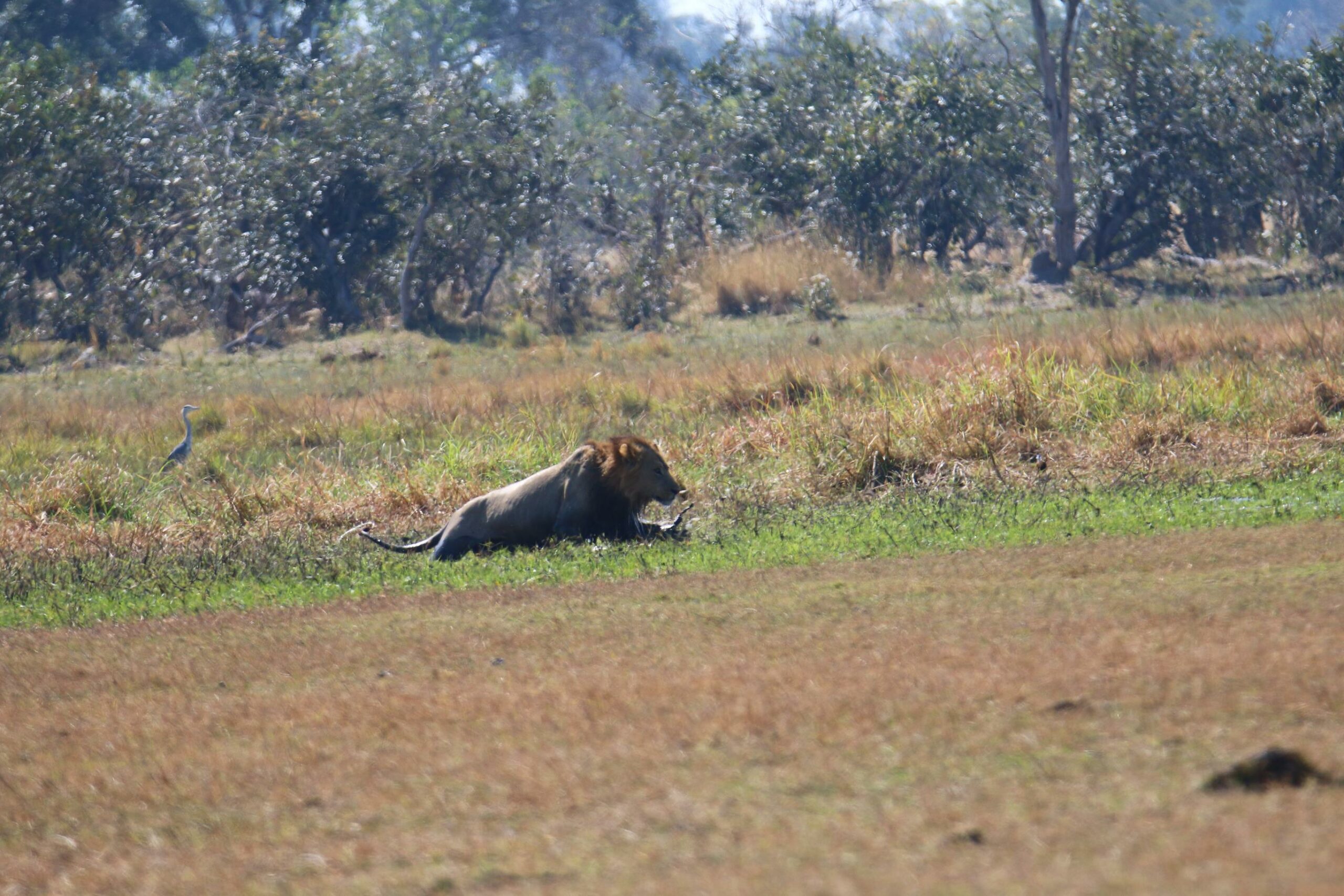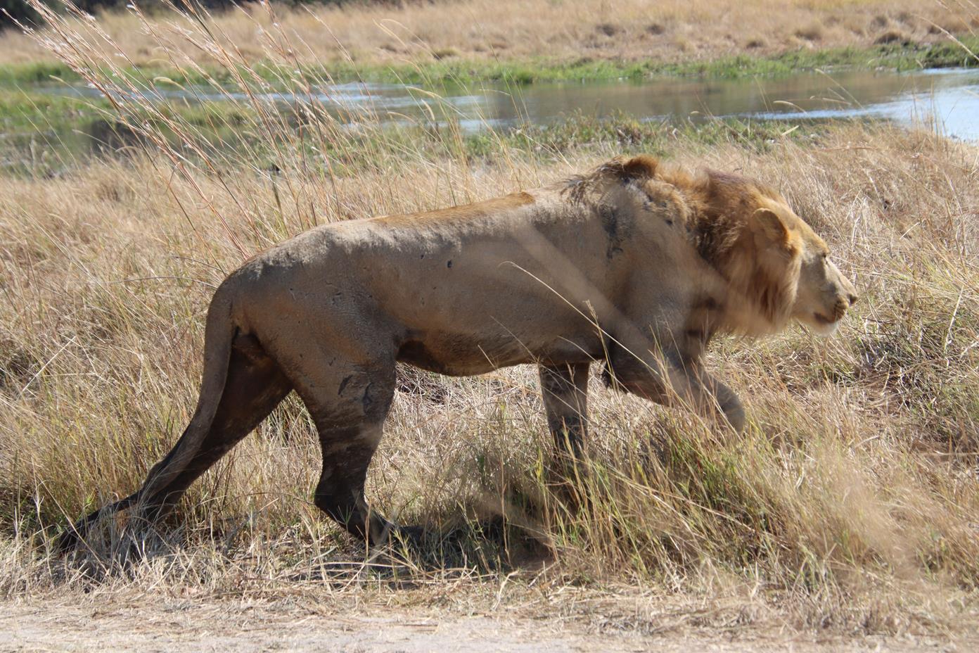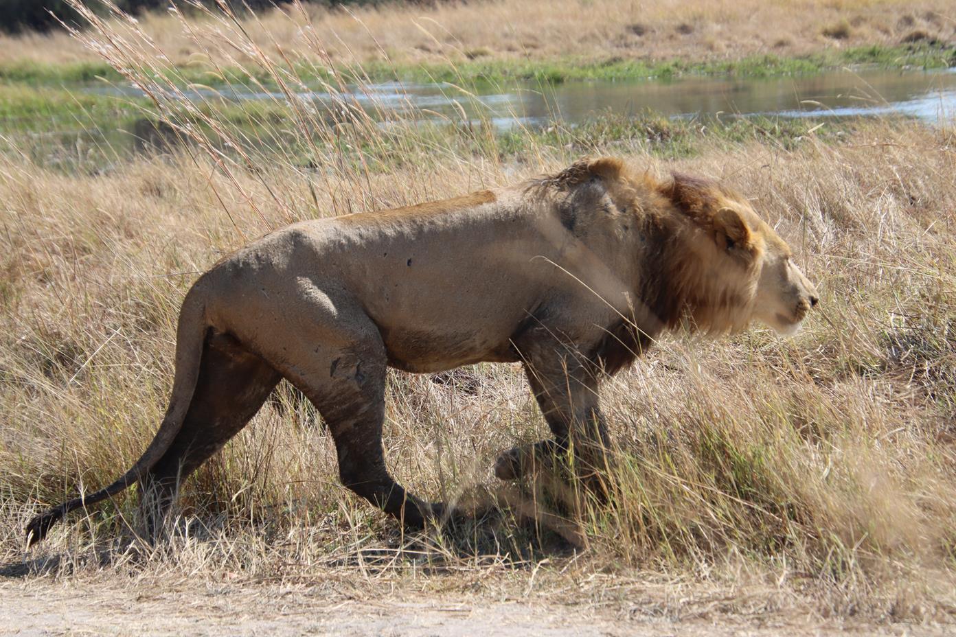 Le lion passe devant un troupeau d’antilopes sans leur prêter aucune attention. Il est focalisé sur cette antilope. Yannick a remarqué qu’il était sale. Il y a dû avoir une première attaque avant notre arrivée et l’antilope peut être un peu blessée. Ces antilopes ne bougent pas d’un centimètre.