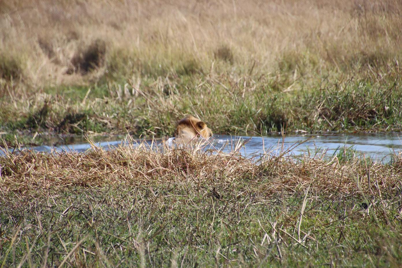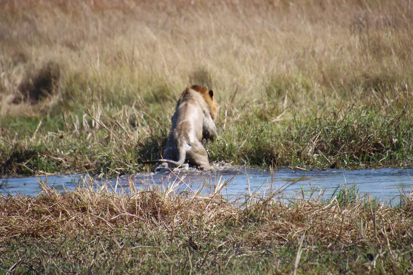 Elle retourne vers l’eau et plonge à nouveau. Le lion continue sa poursuite et plonge à son tour. C’est la panique sur la droite.