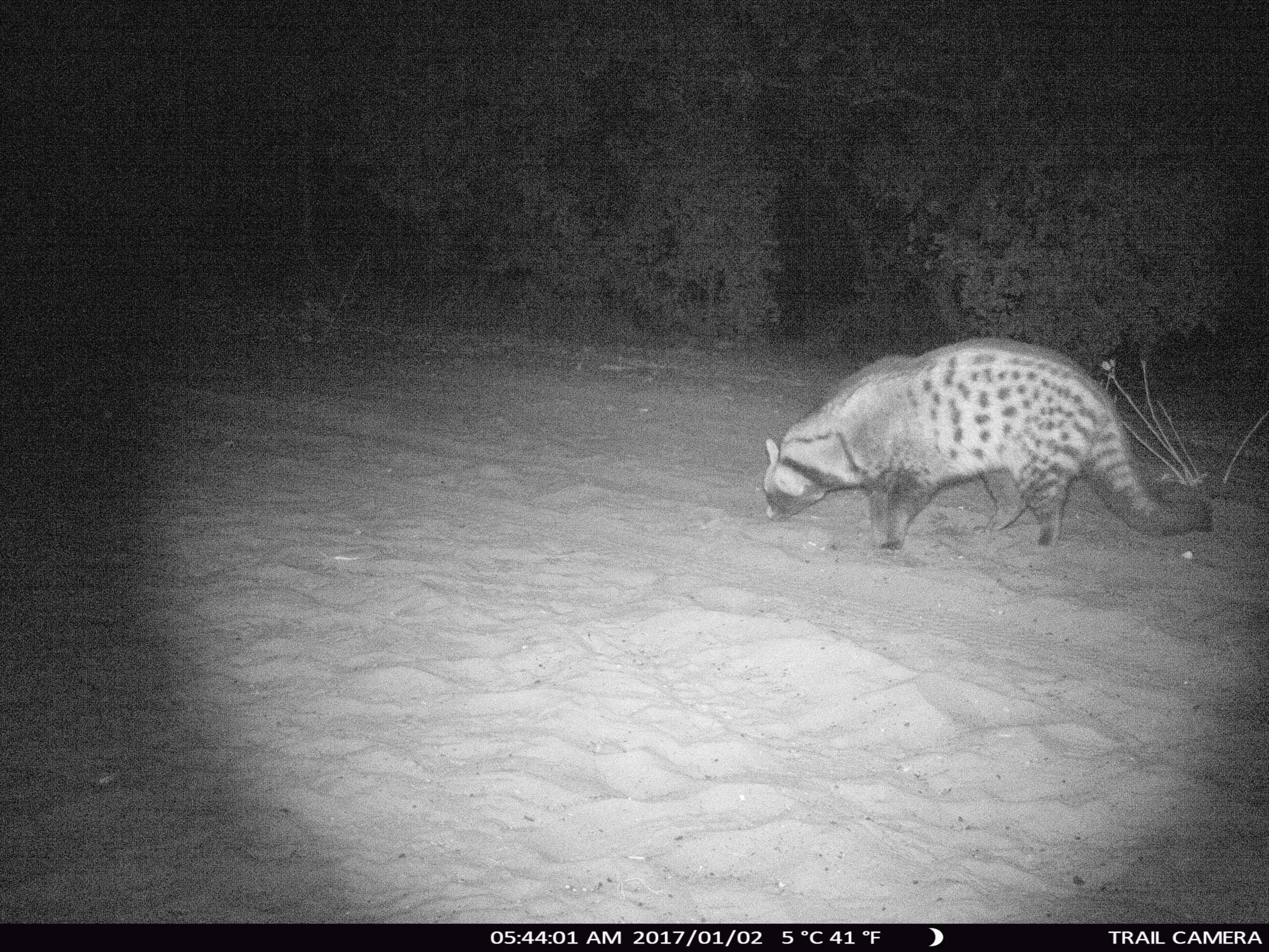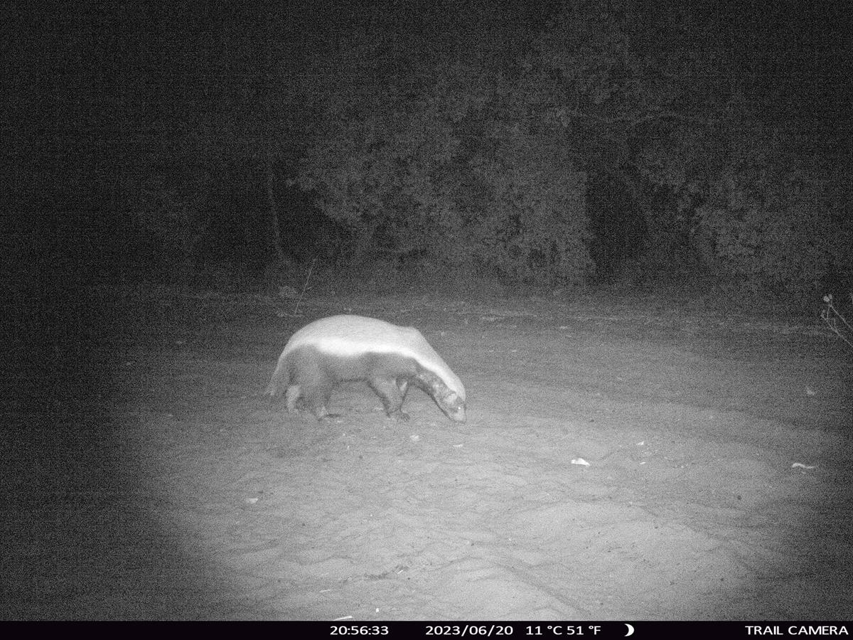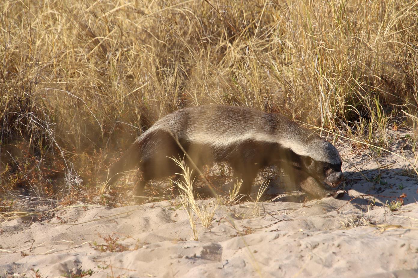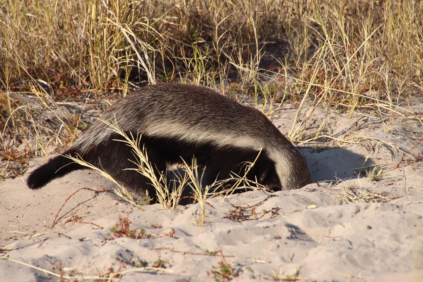Vers 11 h nous sommes réveillés par un boucan juste à côté de la voiture. Yann se lève et m’appelle : « gg vient voir » Un ratel. Il a basculé la poubelle et a sorti un pot de mayonnaise. Il le jette plusieurs fois et après quelques secondes il parvient à ouvrir le pot !