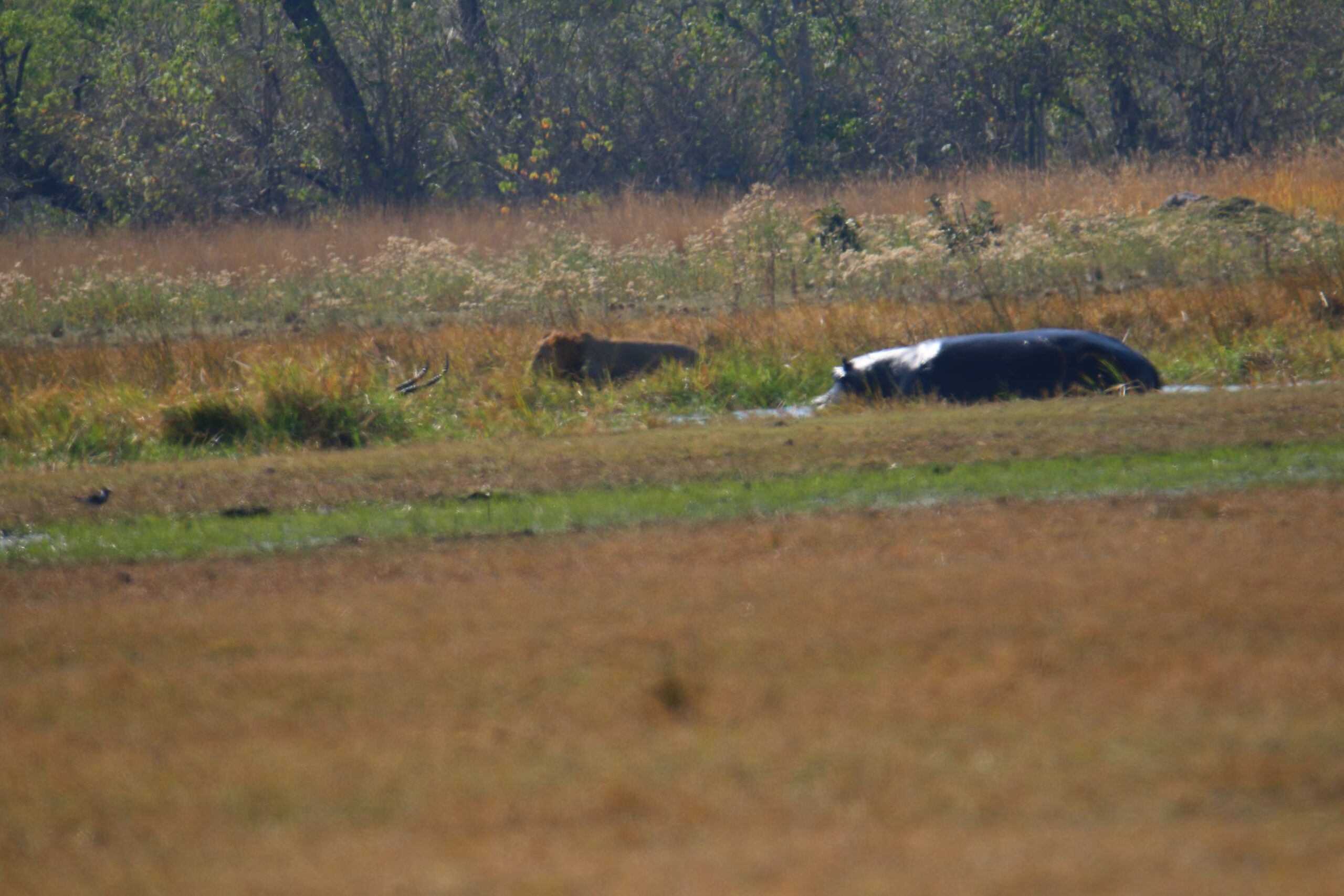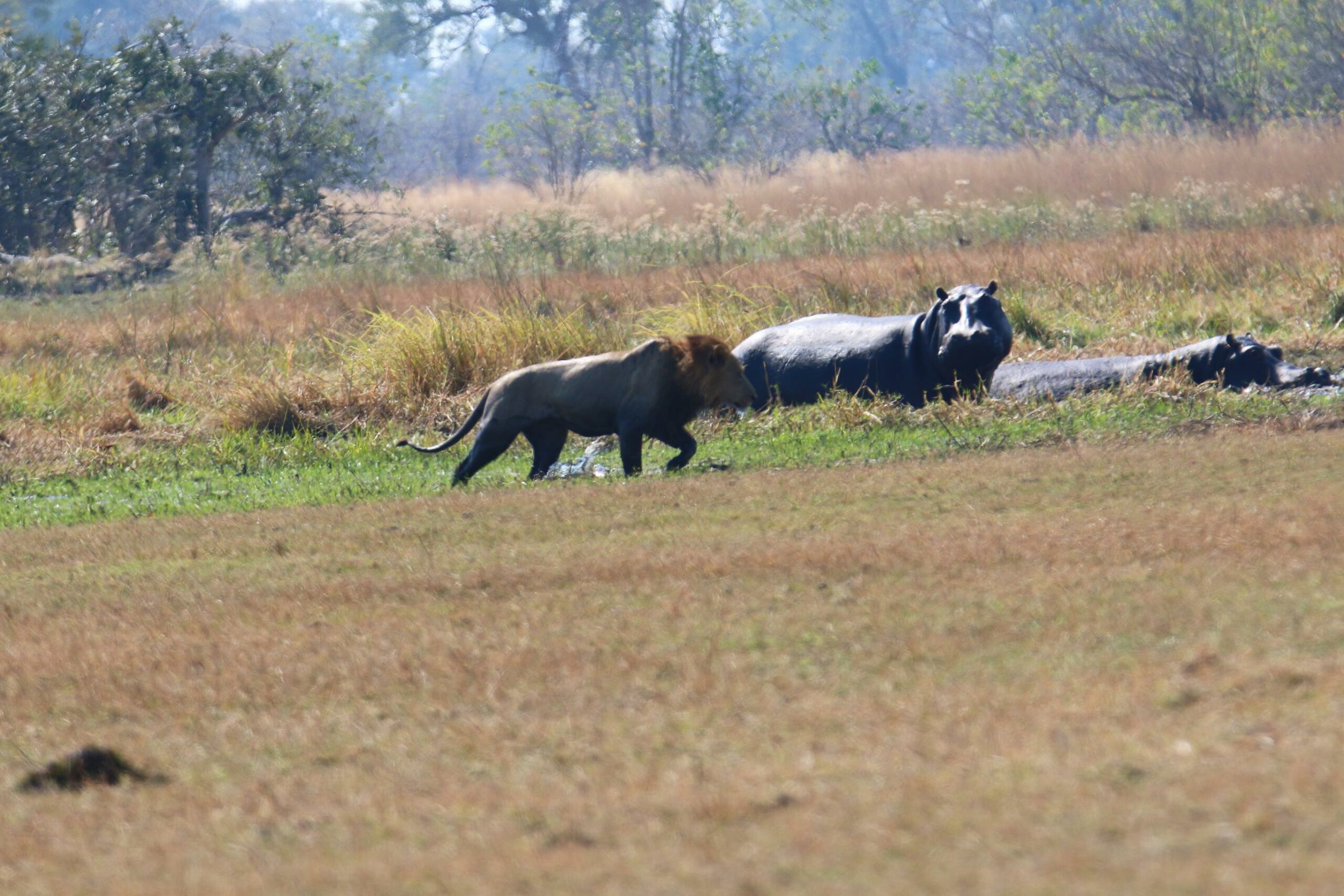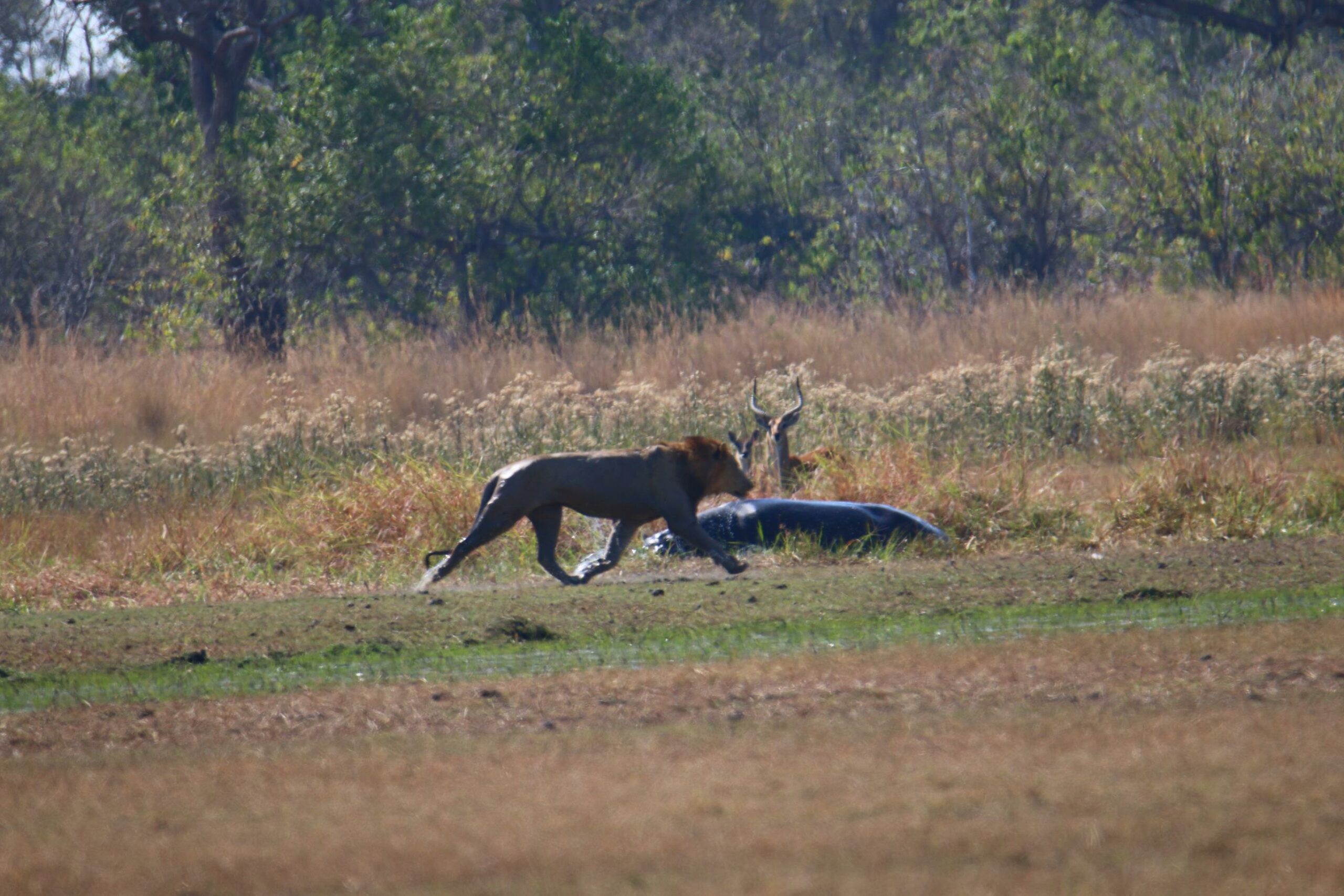 Soudain un hippo vient au secours de l’antilope et chasse le lion sans ménagement. Le lion fait demi-tour mais revient à la charge. Rebelote l’hippo le chasse.