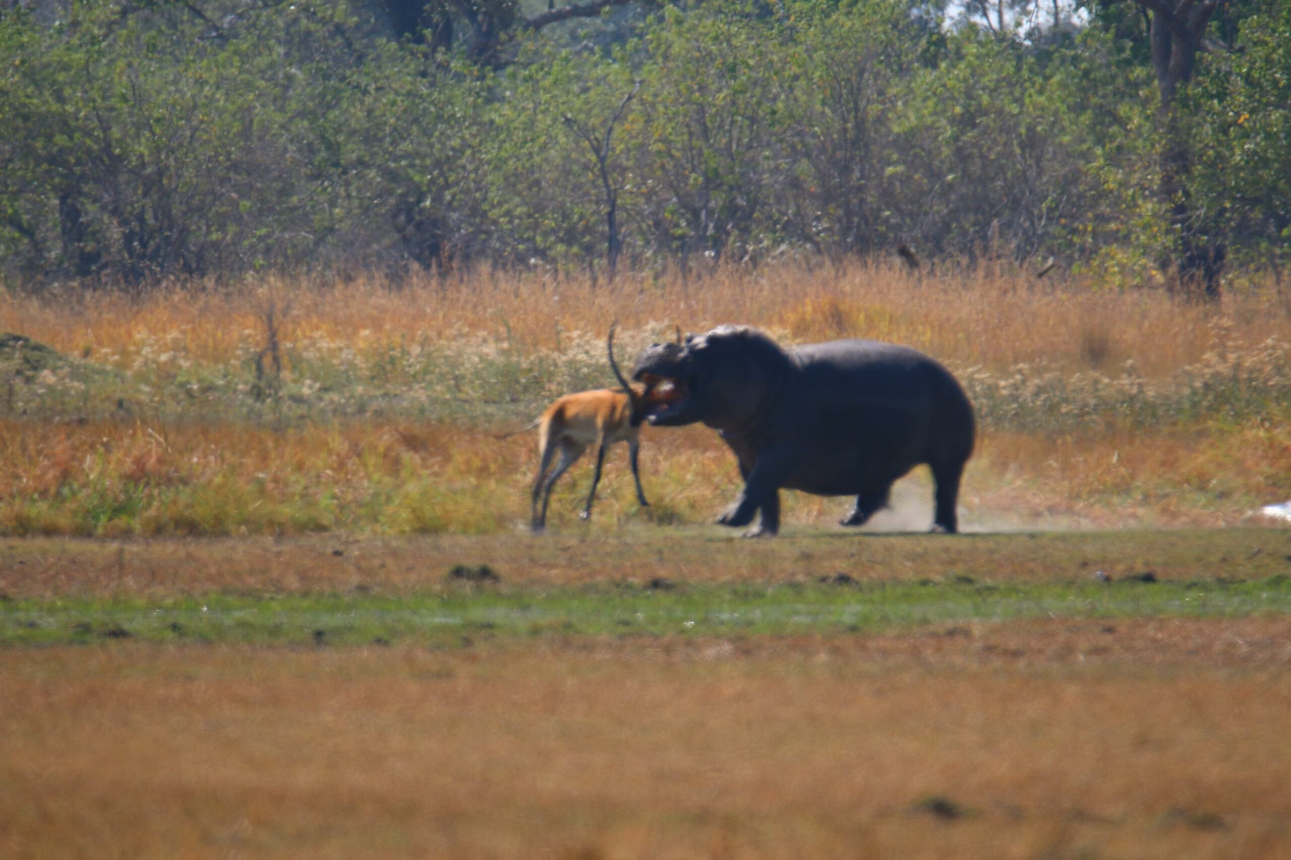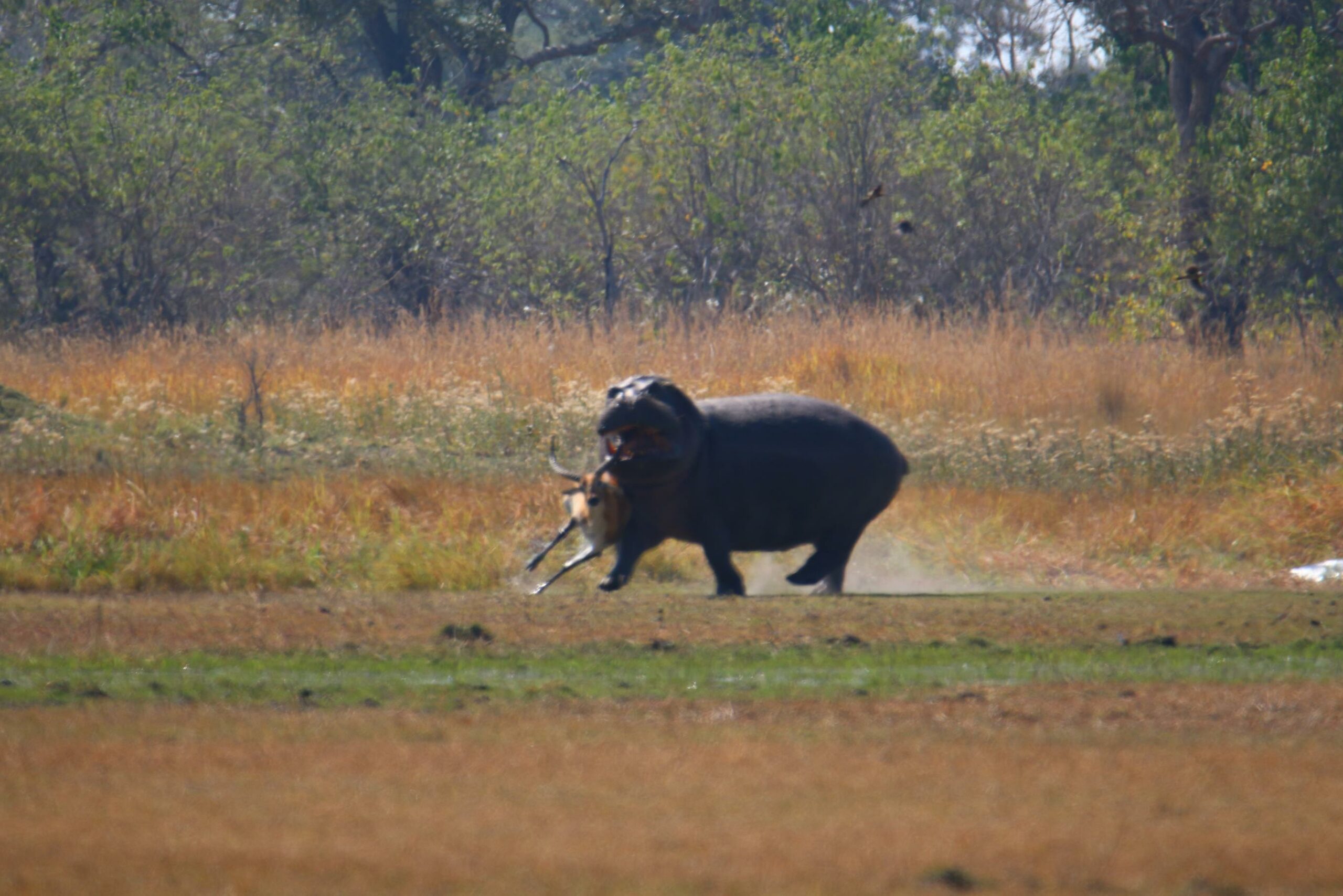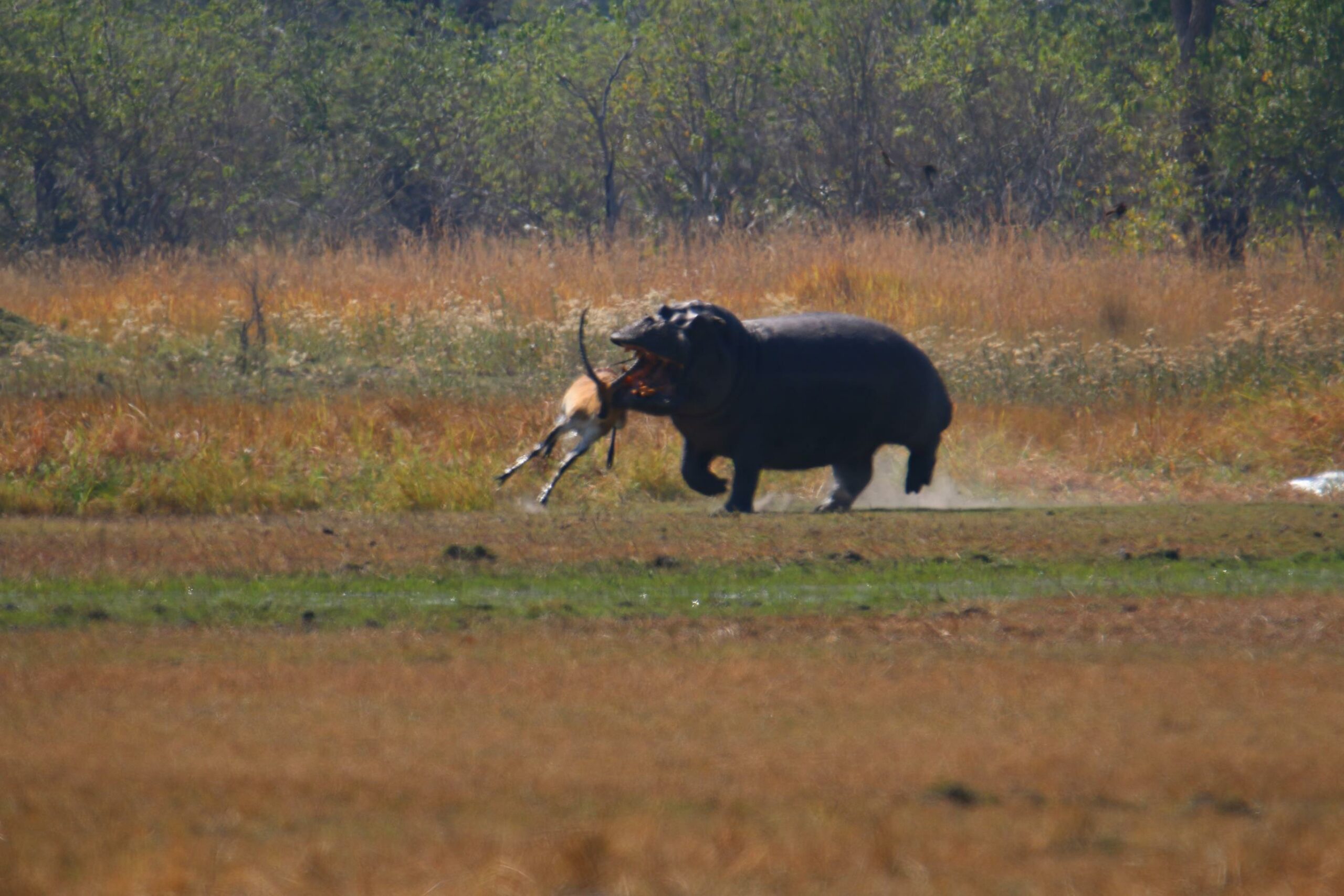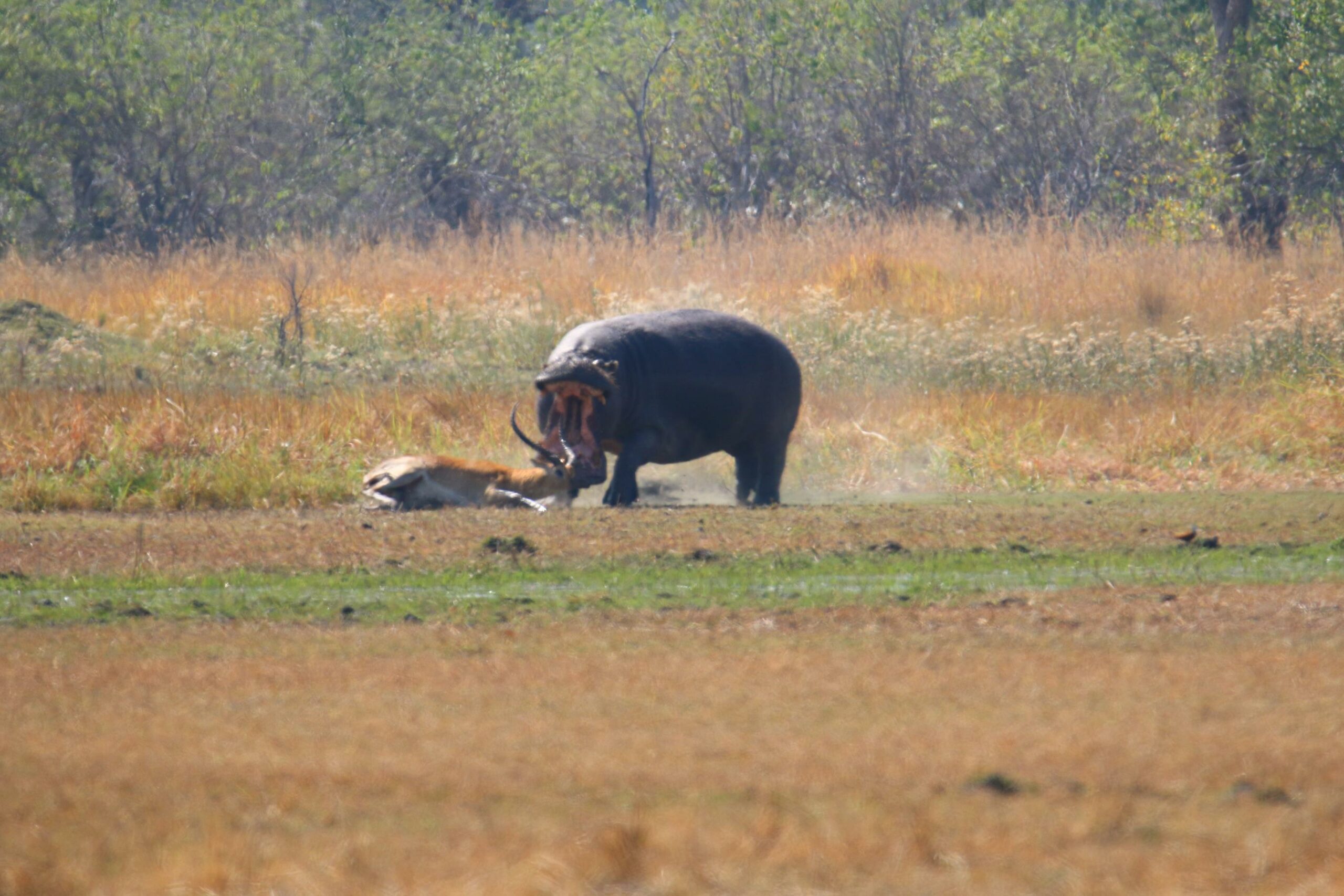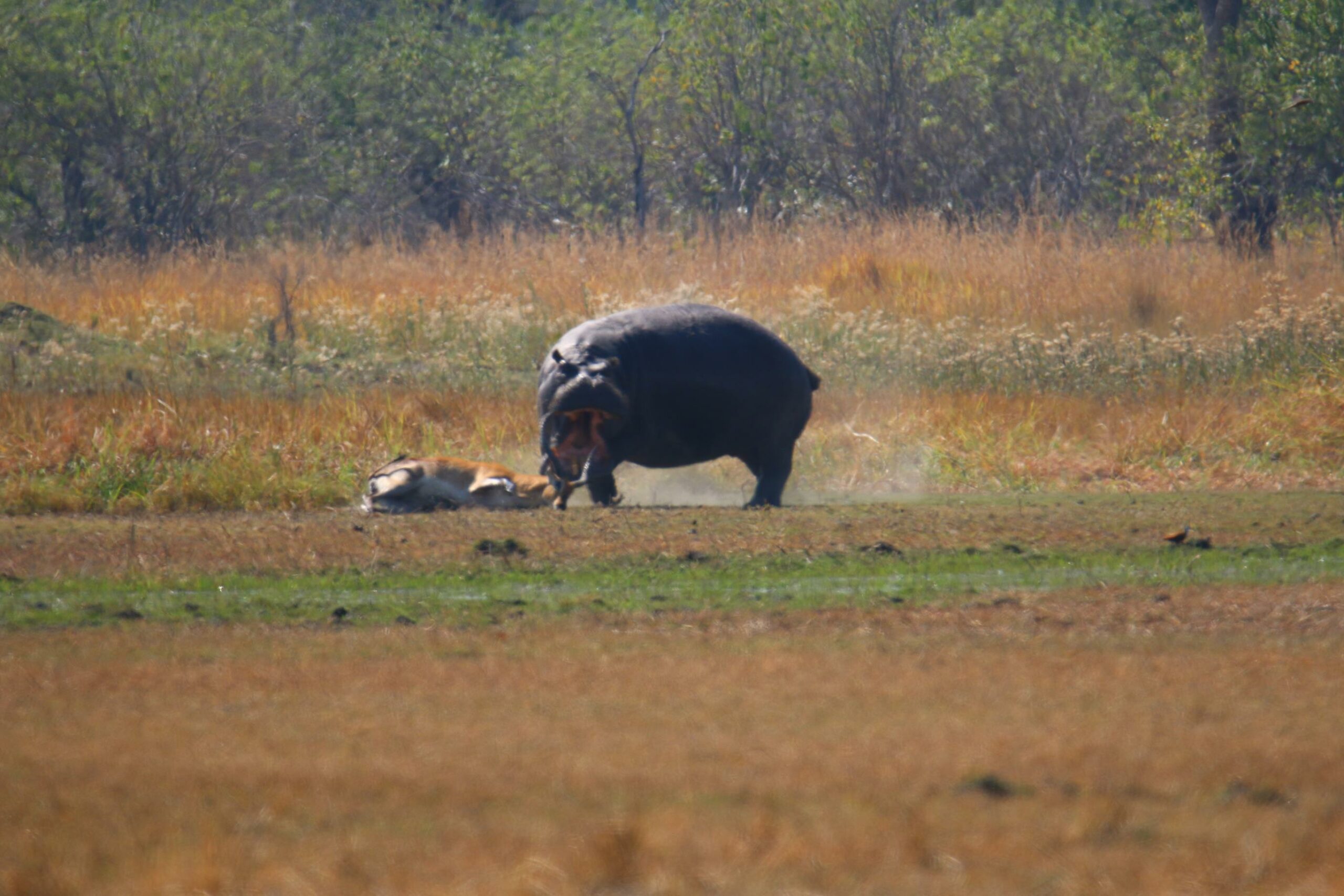 L’hippo ouvre la gueule et attrape l’antilope. Avec de brusques mouvements de tête il la fait valser de droite à gauche et la plaque violemment au sol.