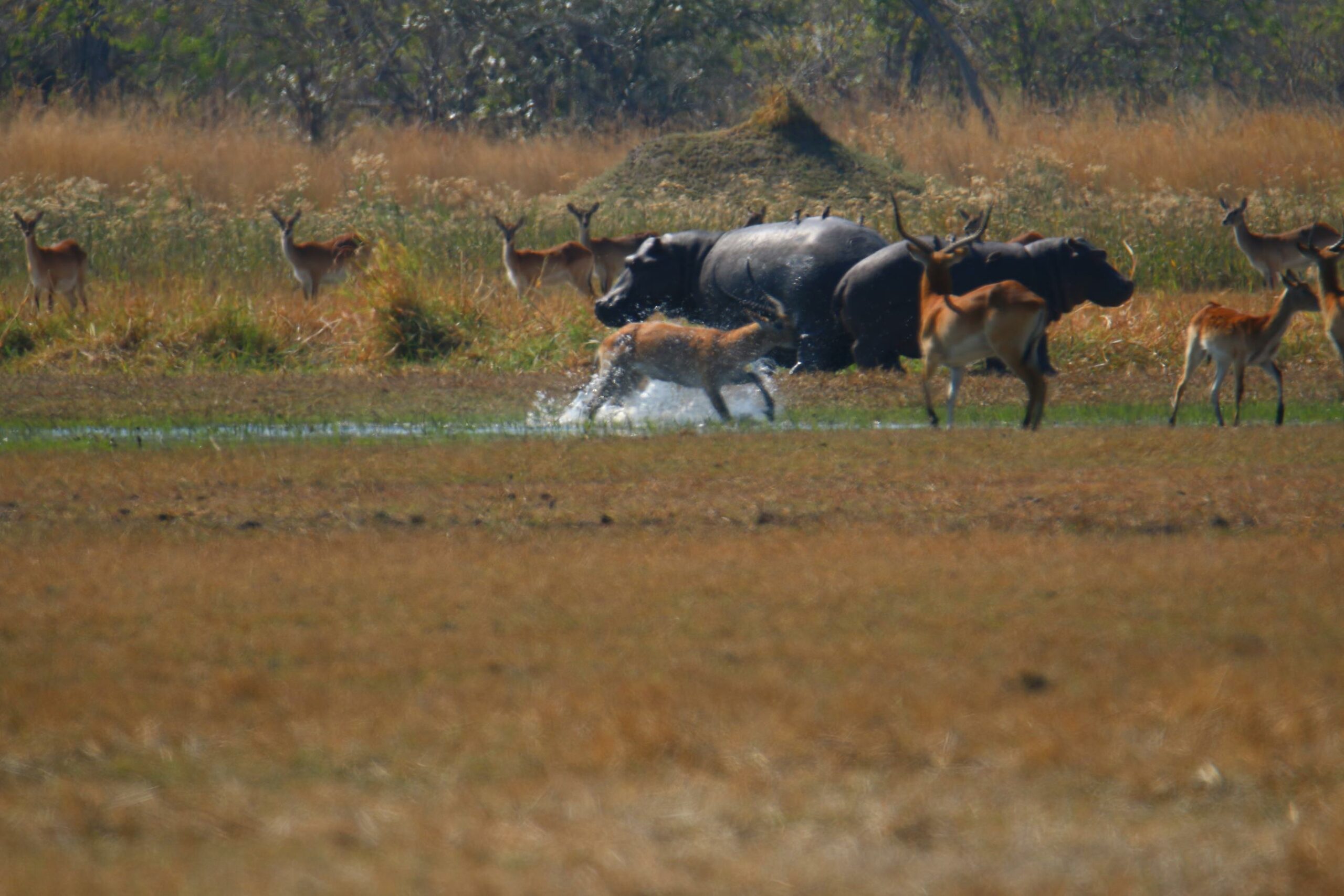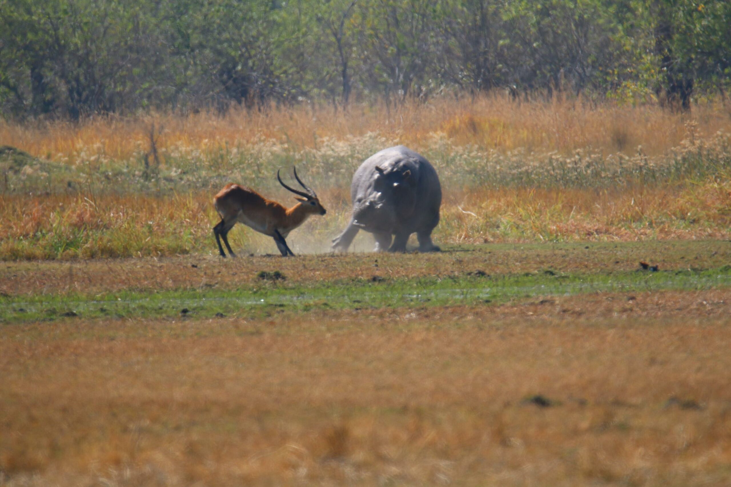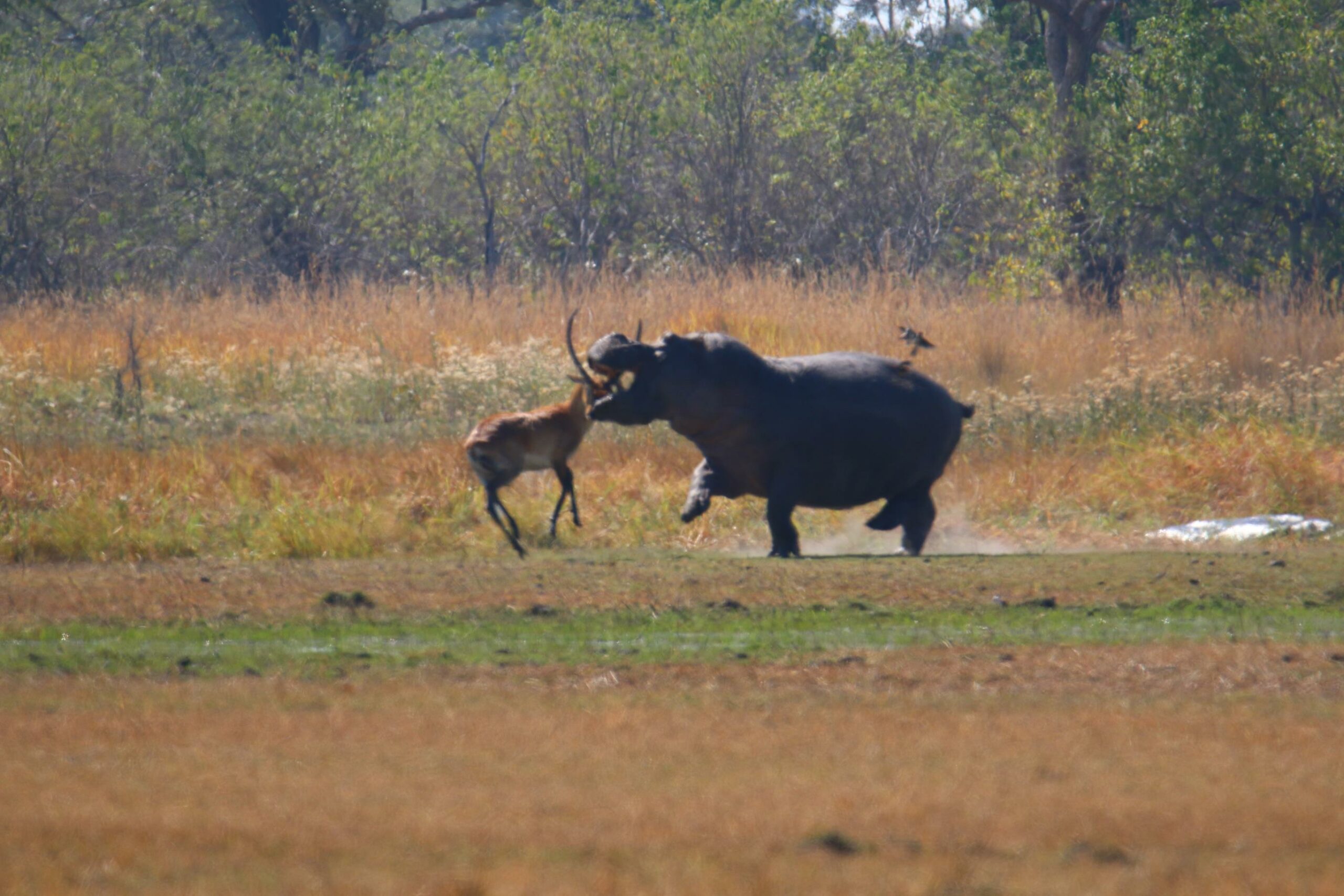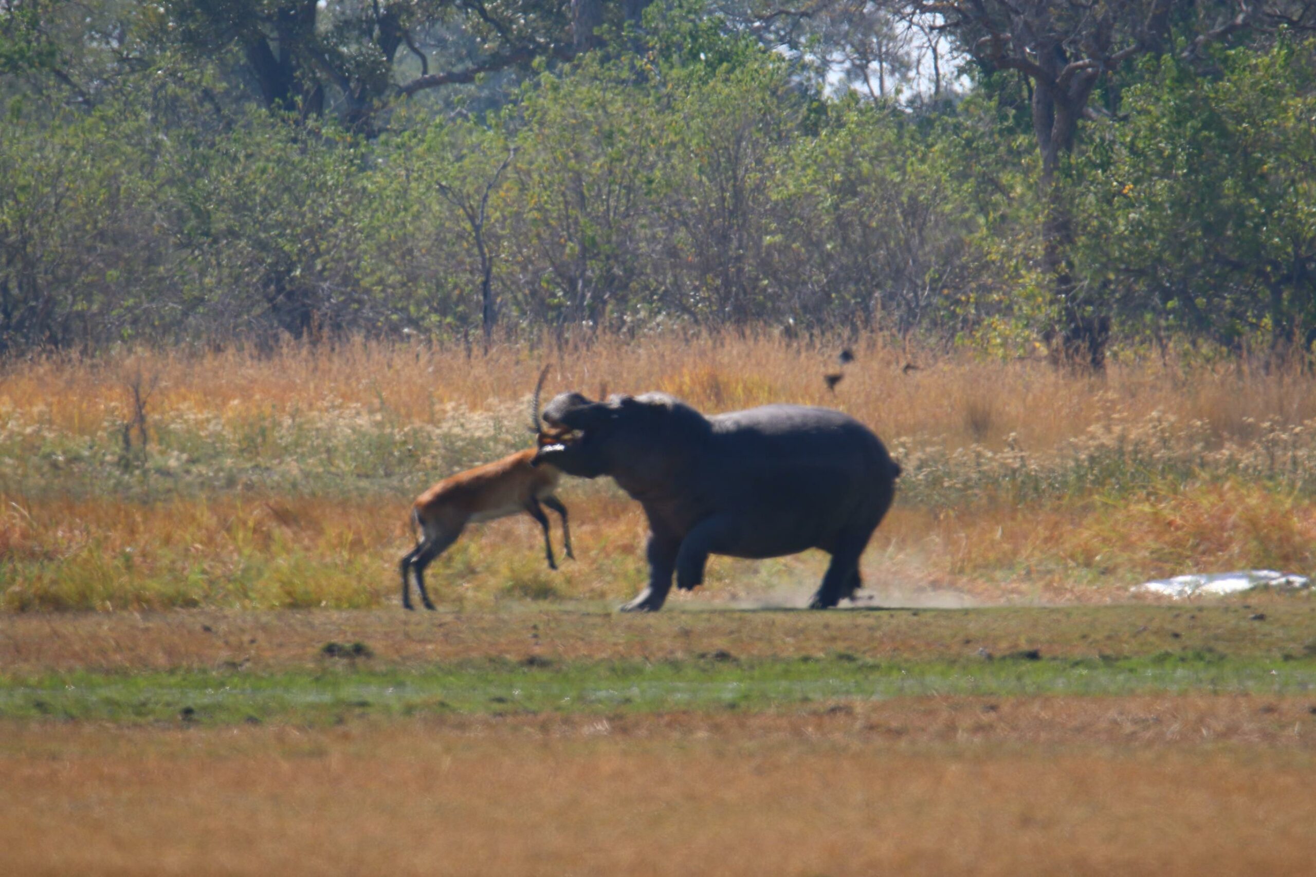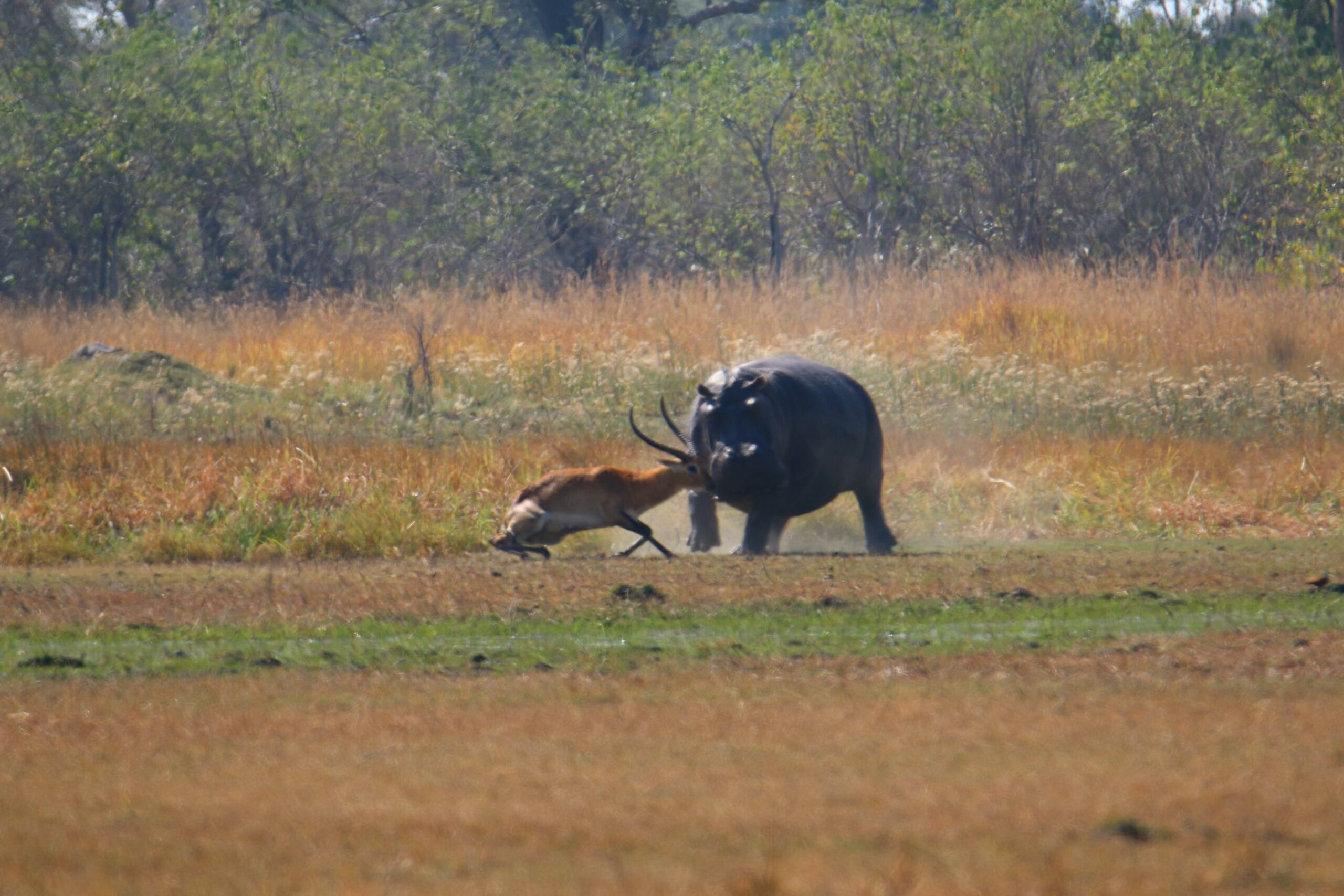 L’hippo ouvre la gueule et attrape l’antilope. Avec de brusques mouvements de tête il la fait valser de droite à gauche et la plaque violemment au sol.