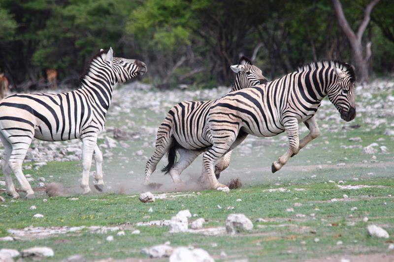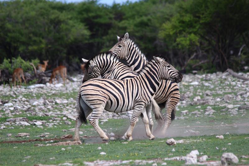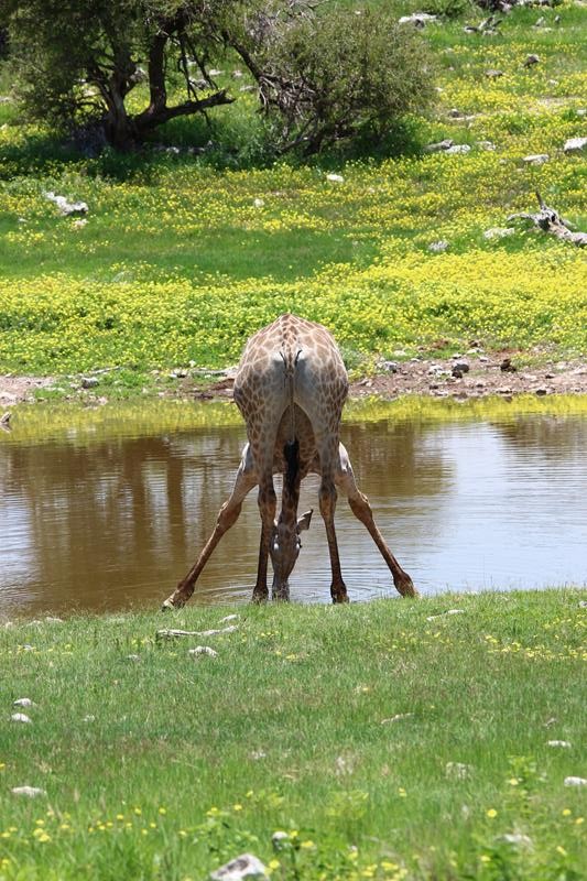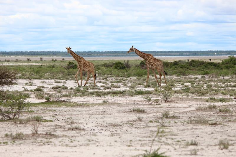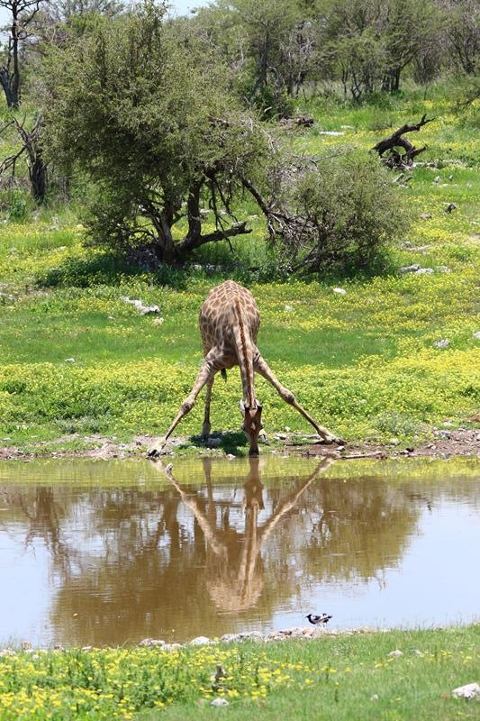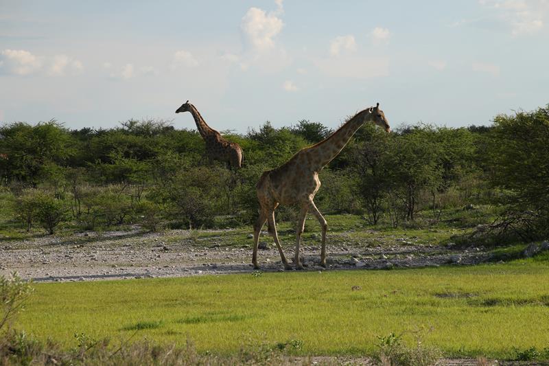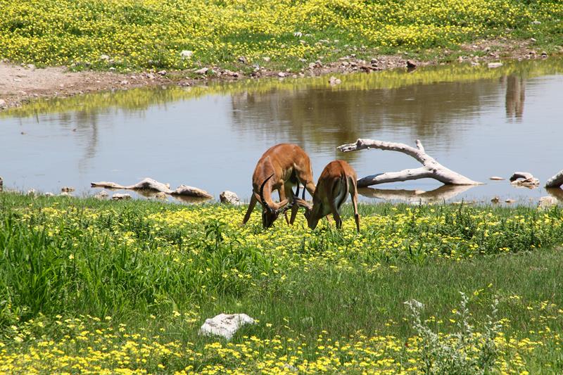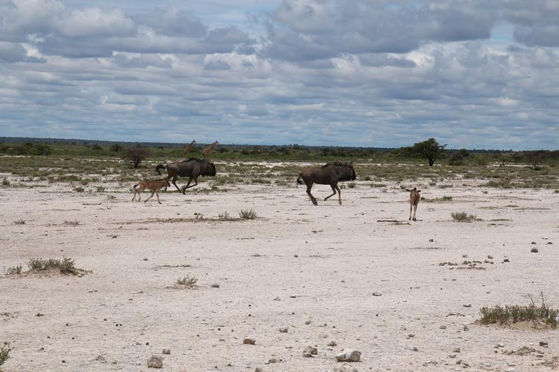 Etosha vert c’est merveilleux, le pan est humide, pas de poussière et les animaux se baladent. Le ciel est couvert et il fait 29°, le rêve. Au même endroit en novembre pas un animal en vue, aujourd’hui des dizaines et des dizaines de girafes, gnous, antilopes, et bien sur les zèbres toujours aussi joueurs.