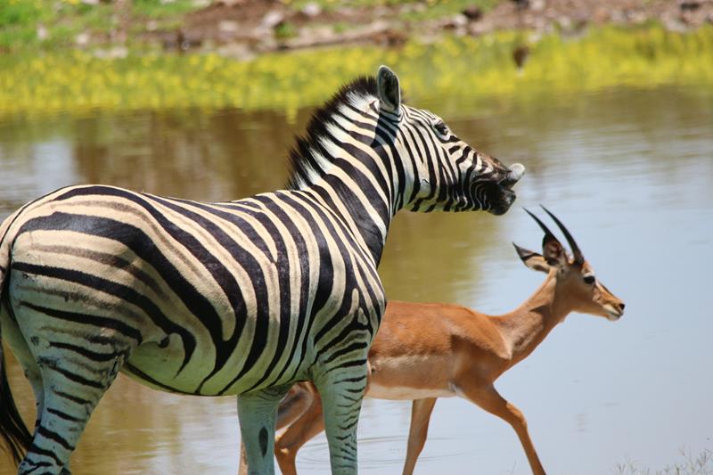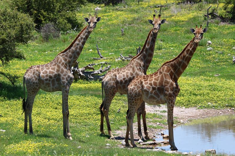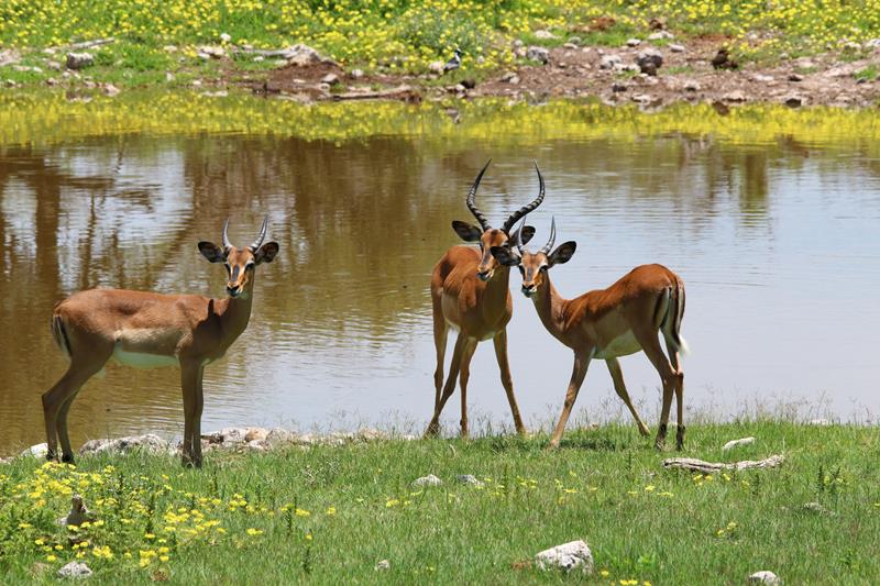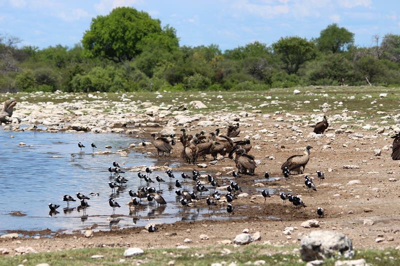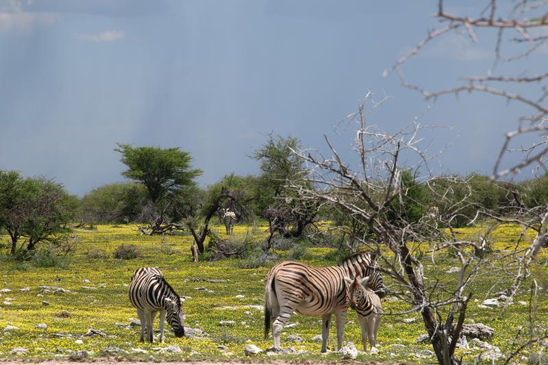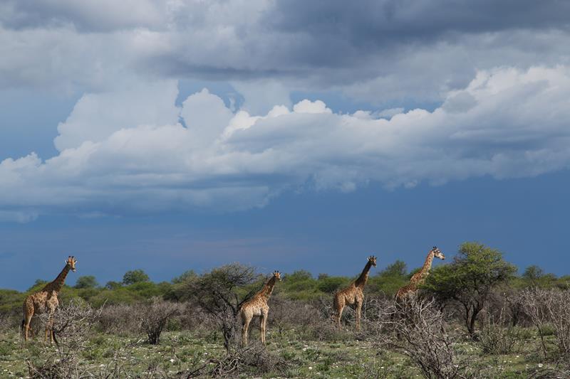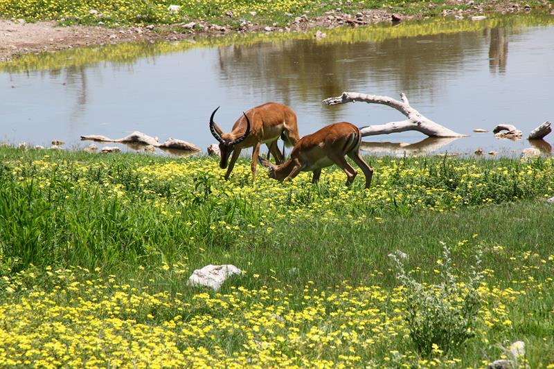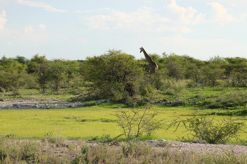 Etosha vert c’est merveilleux, le pan est humide, pas de poussière et les animaux se baladent. Le ciel est couvert et il fait 29°, le rêve. Au même endroit en novembre pas un animal en vue, aujourd’hui des dizaines et des dizaines de girafes, gnous, antilopes, et bien sur les zèbres toujours aussi joueurs.