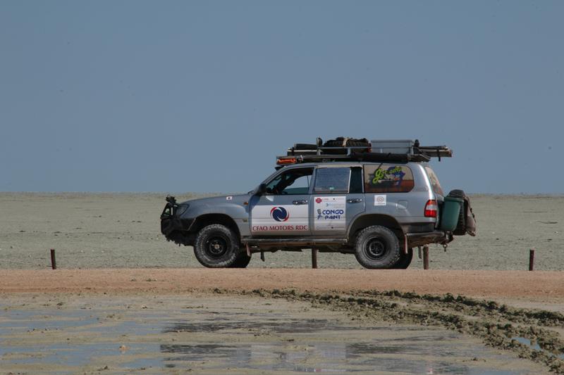 Passage frontière Namibie, nous avons un visa d’un mois.   En route pour 600 km. 100km plus tard, crevaison. Yann essai la bombe anti crevaison. Ça marche, ça marche,  ça marche… et soudain, POUF… la bombe explose,  il neige en Namibie !!! 60 km plus tard Yann change la roue.
