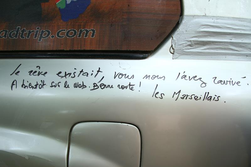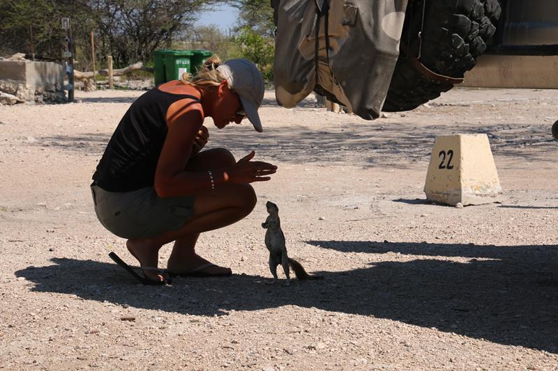 A un entracte nous avons rencontré 2 couples marseillais. Une des dames semble reconnaître la voiture et l’adresse du site ! C’est trop cool,  ça fait plaisir d’avoir contribué un tout petit peu à l’organisation d’un voyage. Ils nous écrivent un gentil mot sur la voiture et c’est retour au camp de Namutoni.