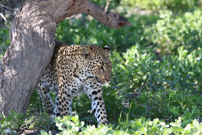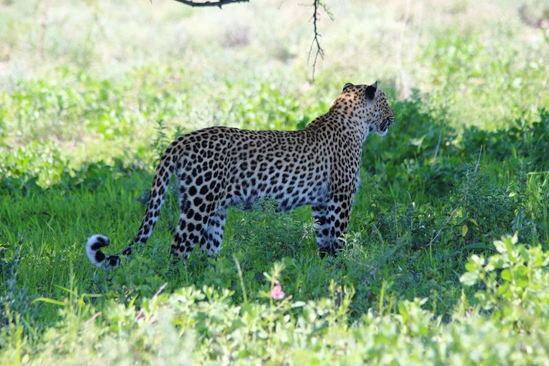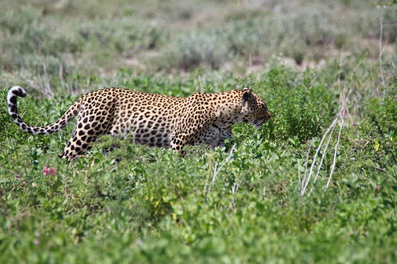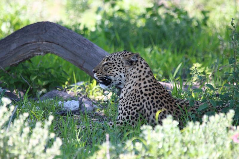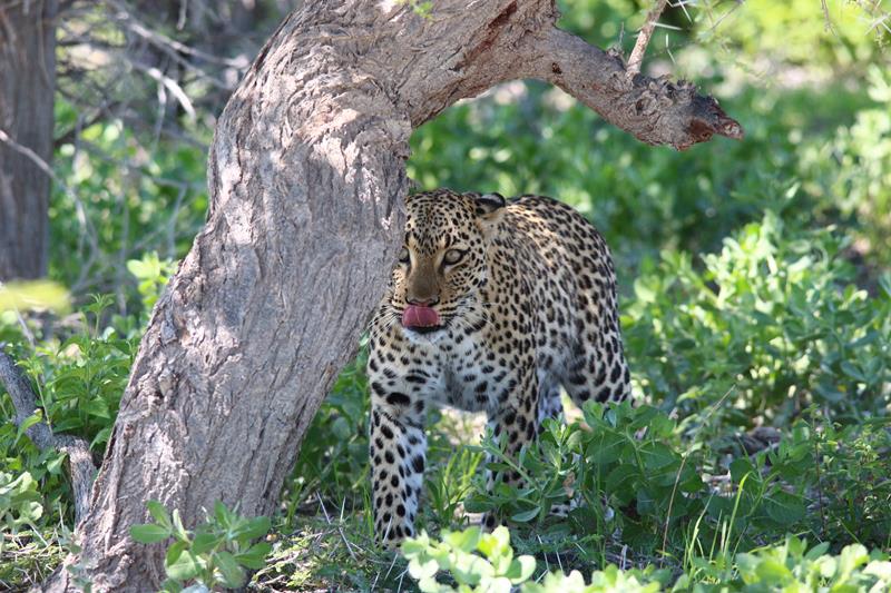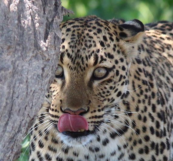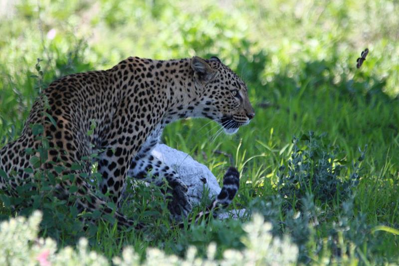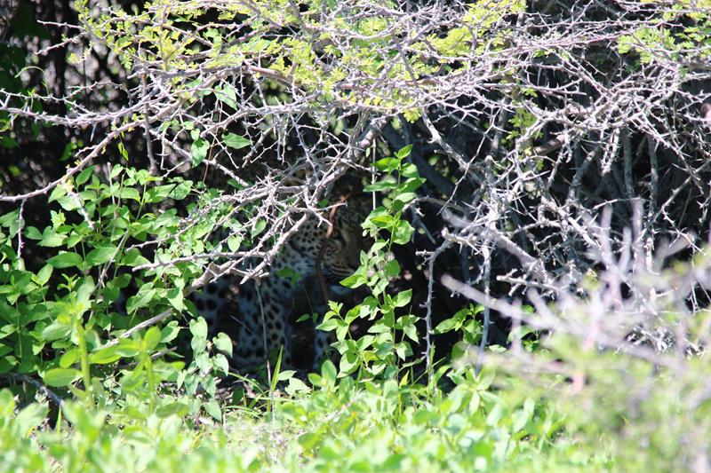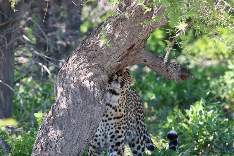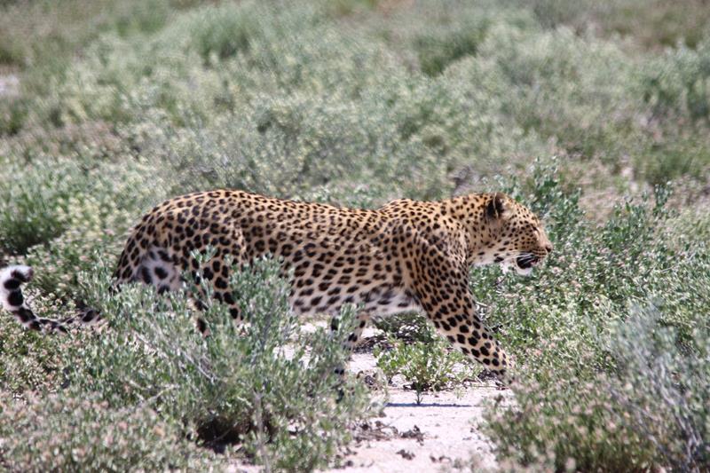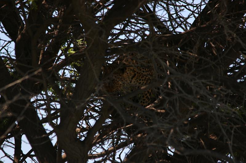 Mais ça n’est pas fini,  comme le public conquit du Bolchoï nous réclamons un « bis »,  et là, nous avons un grand air d’opéra, lequel ? Celui qui vous fait le plus  frissonner. Un léopard, beau, fier, inquiétant, envoutant, oh mon Dieu nous ne bougeons plus. Il passe juste à côté de la voiture. Yann me dit : « gg ferme ta fenêtre » ah non, si c’est écrit que je dois être mangée par un léopard ok, mais les probabilités sont quand même très minces ! Alors je continue mais il est trop près pour le gros appareil alors j’arrête et je le regarde tout simplement, lui aussi, il me tire même la langue !