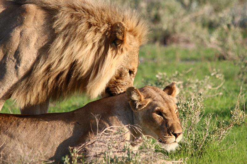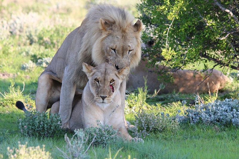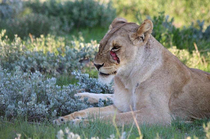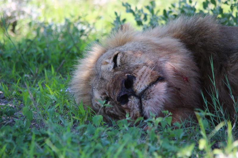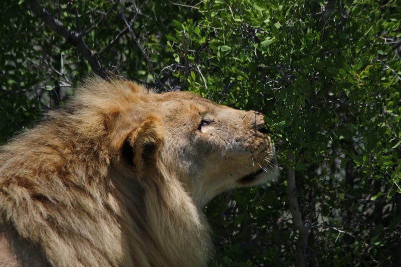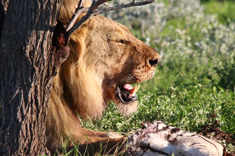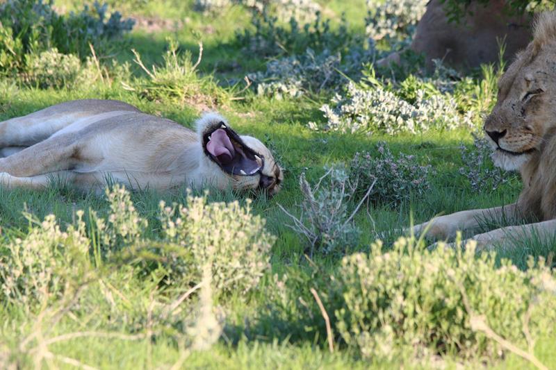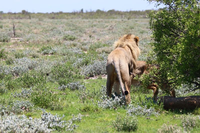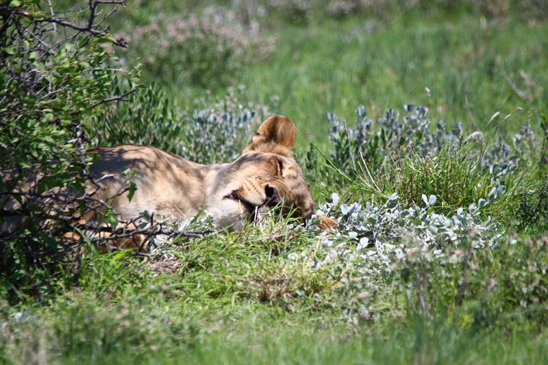 Entracte au picnic spot pour nous détendre. La musique repart et ça recommence, cette fois c’est l’apothéose, les 20 dernières minutes de l’opéra russe du Prince Igor : les lions, 5 lionnes et 2 lions.  Ils sont beaucoup moins sensuels que les éléphants et les girafes mais quel spectacle. Un male est couché et ne bougera pas, le ventre bien rempli de zèbre ! Le 2ème par contre est plus actif et honore « madame » toutes les 30 minutes. La pauvre lionne a une grosse blessure sous l’œil. Après plusieurs « 30 minutes » la dame se rebiffe et envoi paître son lascar. Pendant ce temps, les 4 autres lionnes partent à la chasse.  Nos deux heures de patience en plein soleil ont payé ! (il fait plus chaud que le 1er jour, 44°)