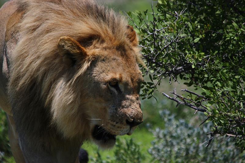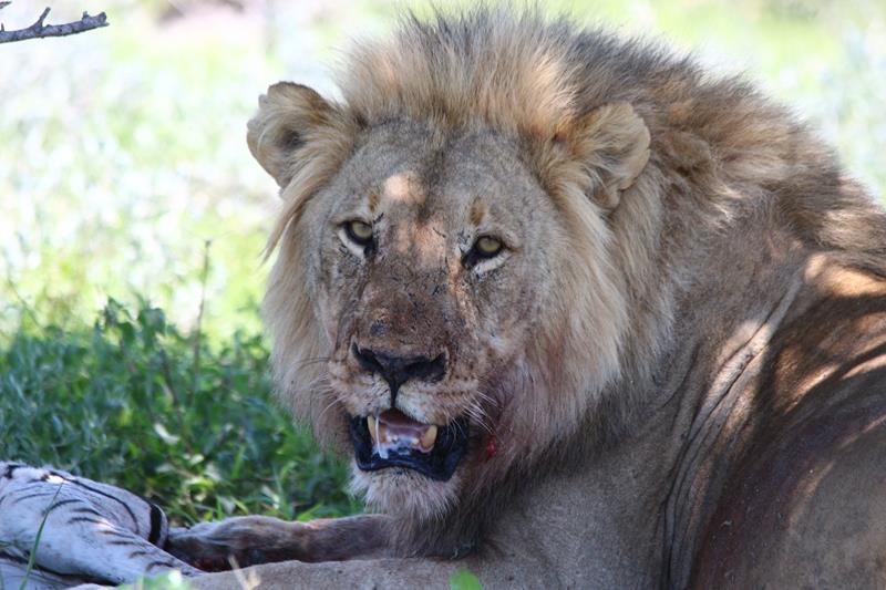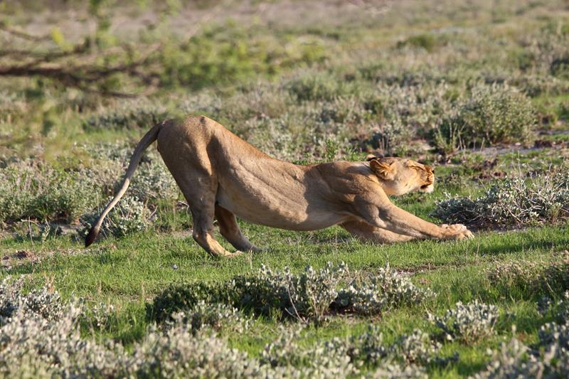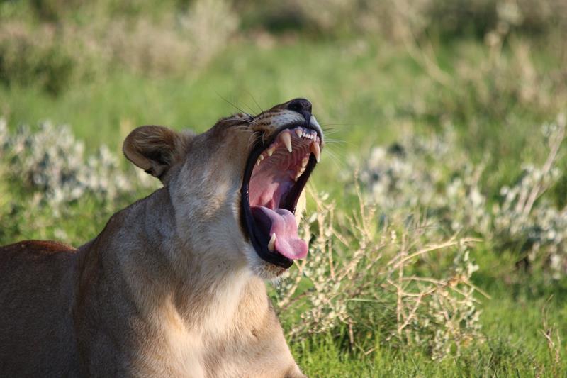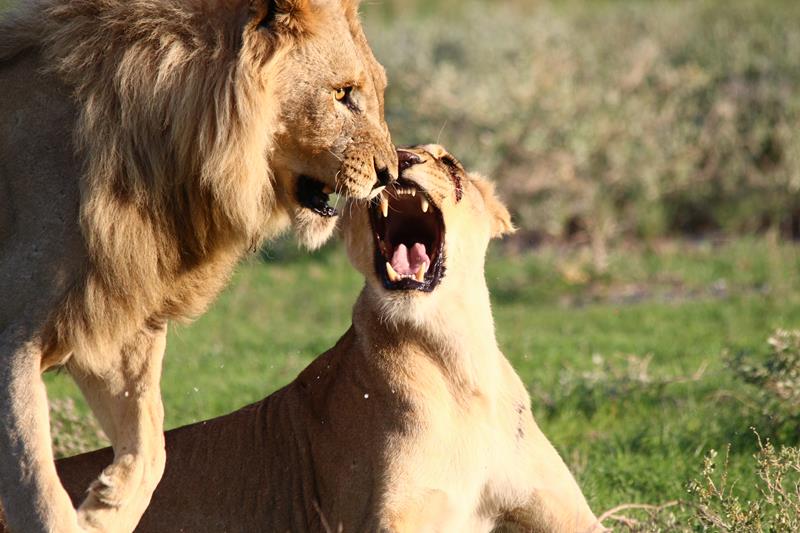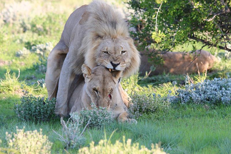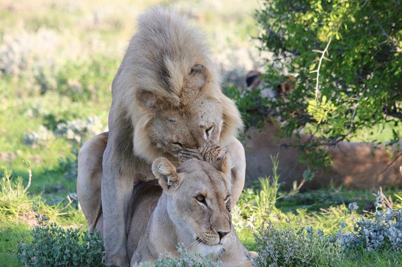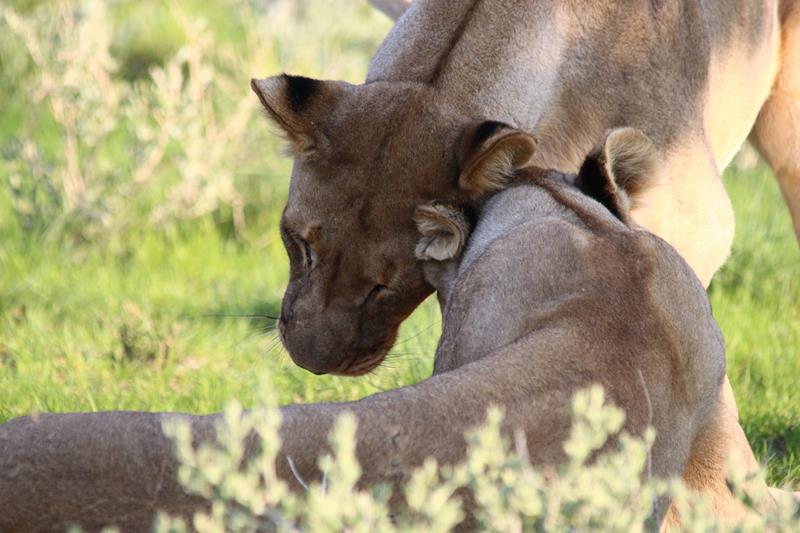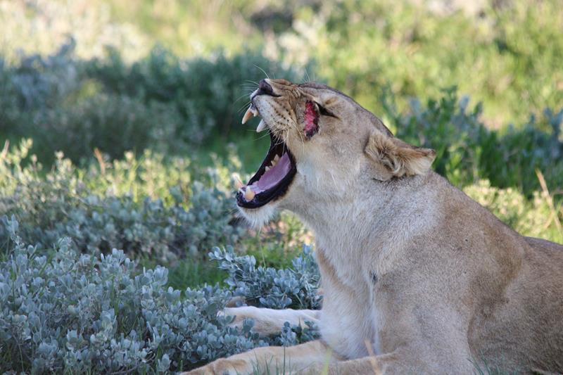 Entracte au picnic spot pour nous détendre. La musique repart et ça recommence, cette fois c’est l’apothéose, les 20 dernières minutes de l’opéra russe du Prince Igor : les lions, 5 lionnes et 2 lions.  Ils sont beaucoup moins sensuels que les éléphants et les girafes mais quel spectacle. Un male est couché et ne bougera pas, le ventre bien rempli de zèbre ! Le 2ème par contre est plus actif et honore « madame » toutes les 30 minutes. La pauvre lionne a une grosse blessure sous l’œil. Après plusieurs « 30 minutes » la dame se rebiffe et envoi paître son lascar. Pendant ce temps, les 4 autres lionnes partent à la chasse.  Nos deux heures de patience en plein soleil ont payé ! (il fait plus chaud que le 1er jour, 44°)