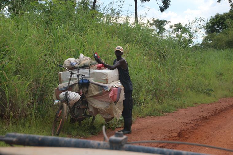 Il fait chaud et cette journée a été fatigante. Nous nous arrêtons au bord de la piste pour camper ( S 08°51.534’ / E 025°18.245’) à une trentaine de km de Kamina. Aucun problème avec les gens qui rentrent au village (motos, vélos, piétons) ils sont plus préoccupés à pousser leurs vélos surchargés