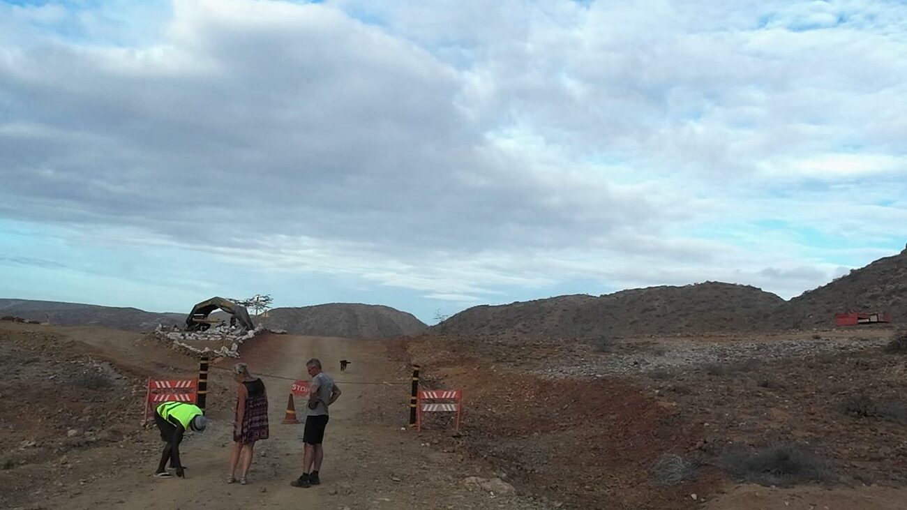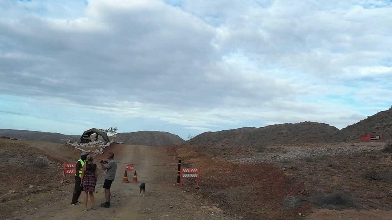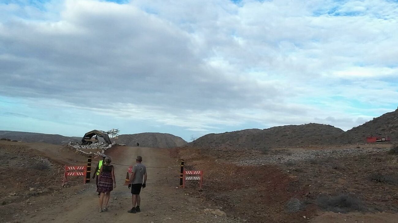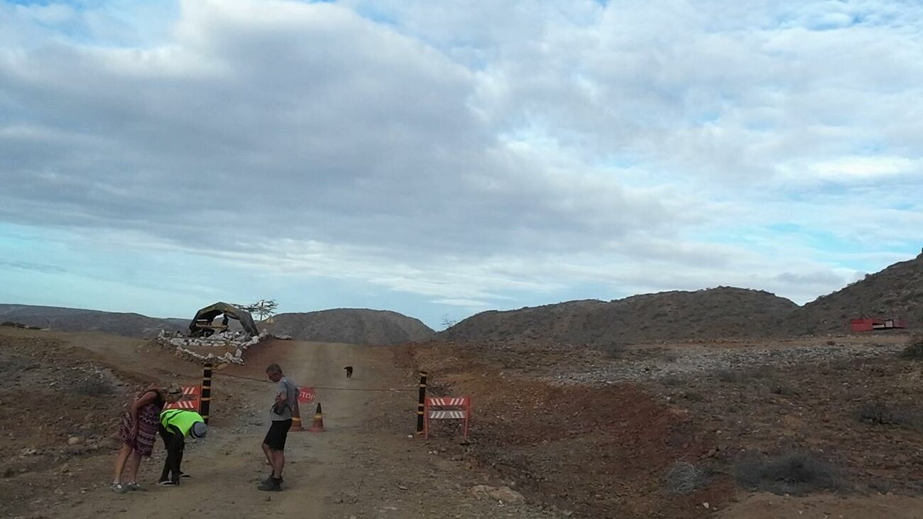 Nous nous dirigeons vers la baie de Binga pour y camper. Plusieurs kilomètres de piste ondulée horrible. À 17 h 40 nous arrivons à une barrière et un poste de contrôle.