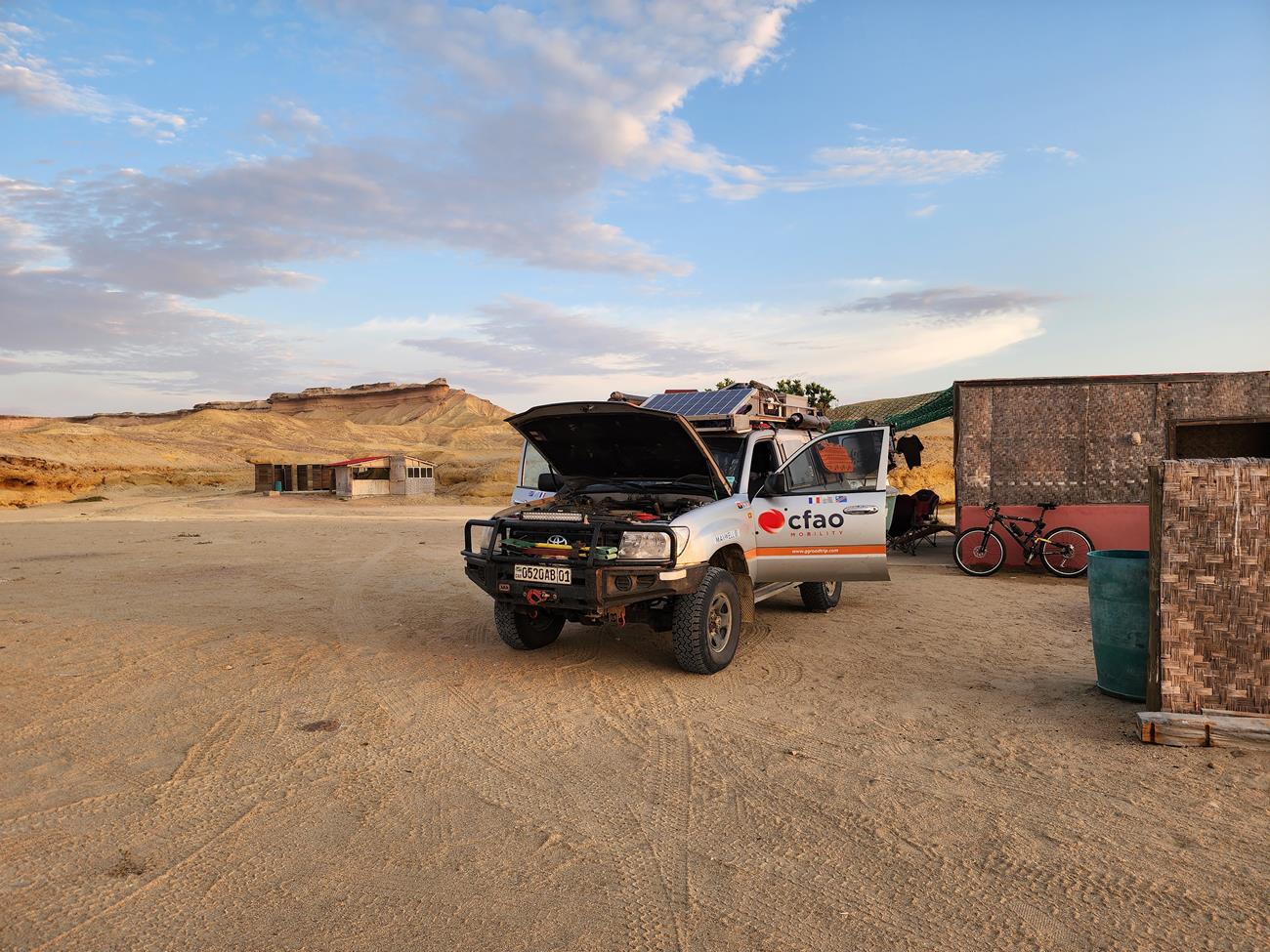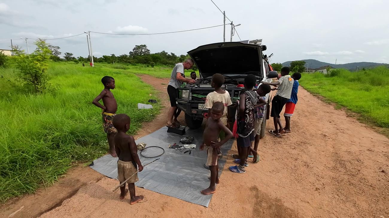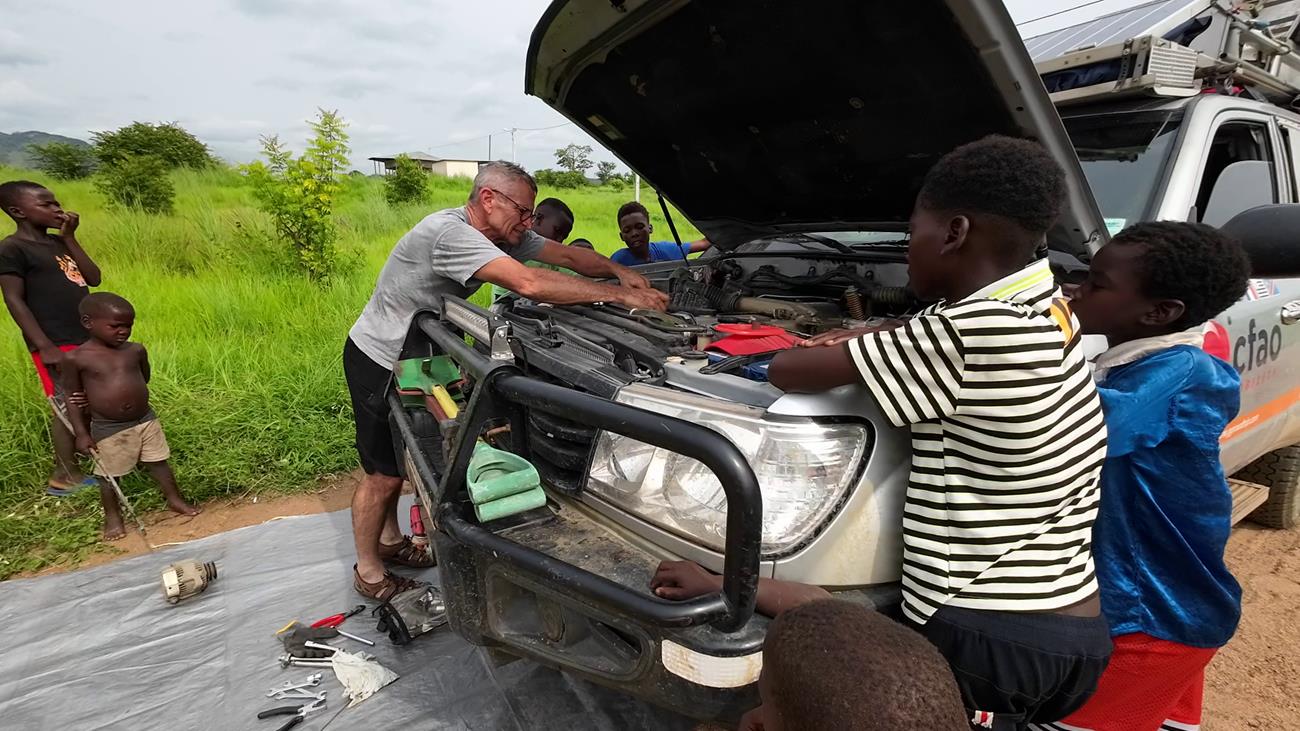 Demi-tour vers Dondo. Au retour Yannick entend un bruit sous le capot. C’est un roulement de l’alternateur qui « casse la croûte ». Il change l’alternateur avec celui de stock en 1 h 20 avec des spectateurs très attentifs.