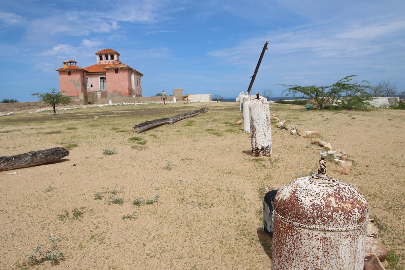 Une vieille maison abandonnée avec une clôture de bouteille de gaz.