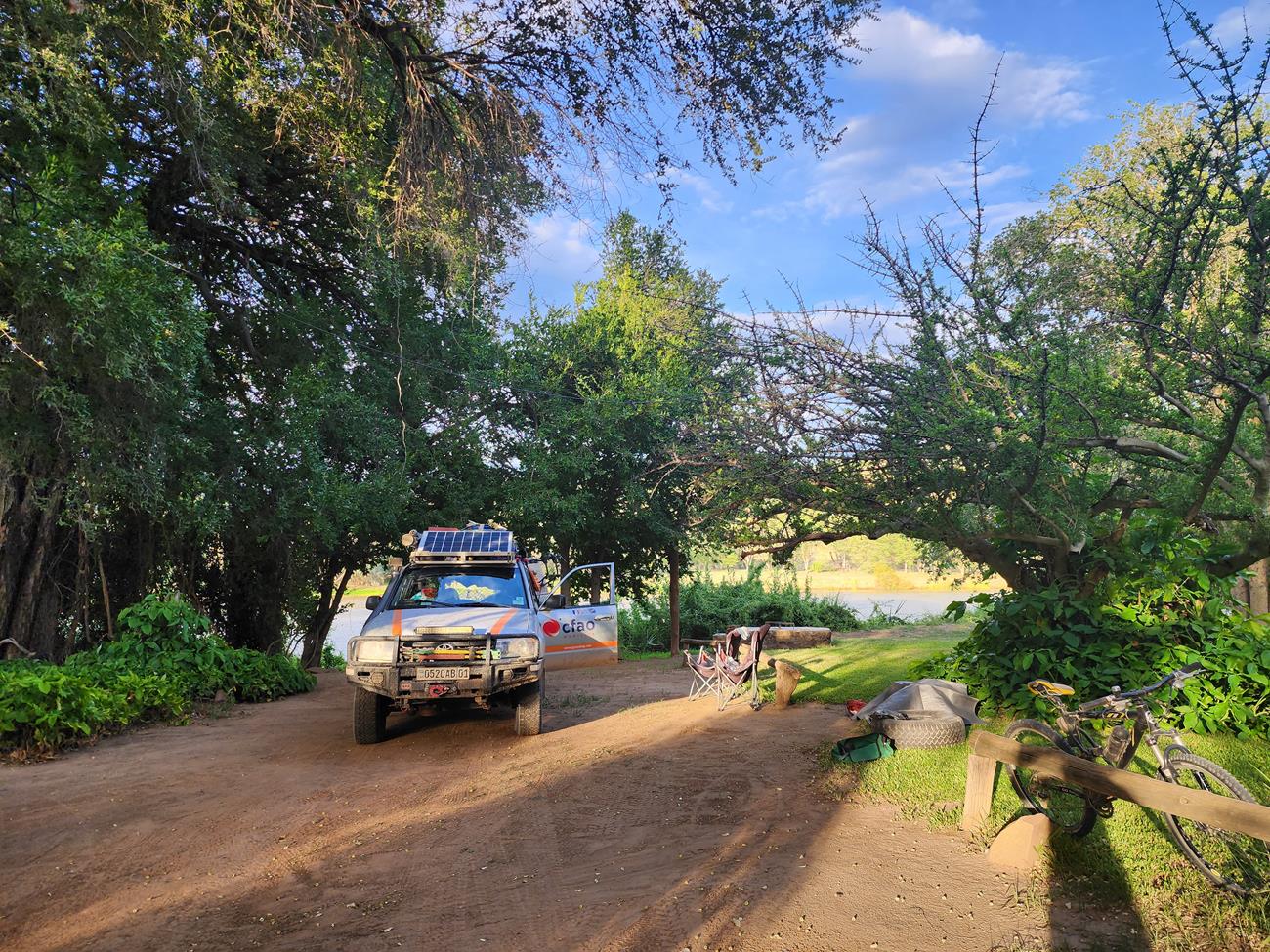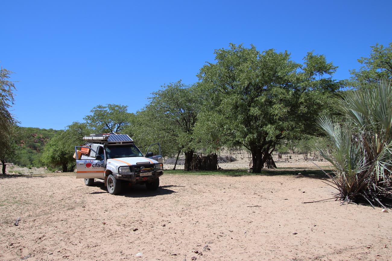 Nous nous faisons doubler par le couple qui était avec nous au Kunene camp. Lorsque nous stoppons au bord de la rivière nous les voyons revenir.