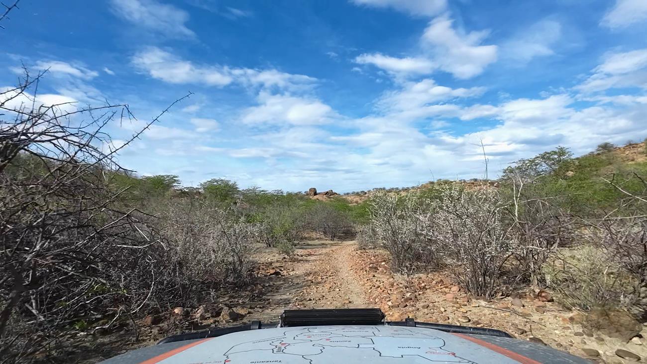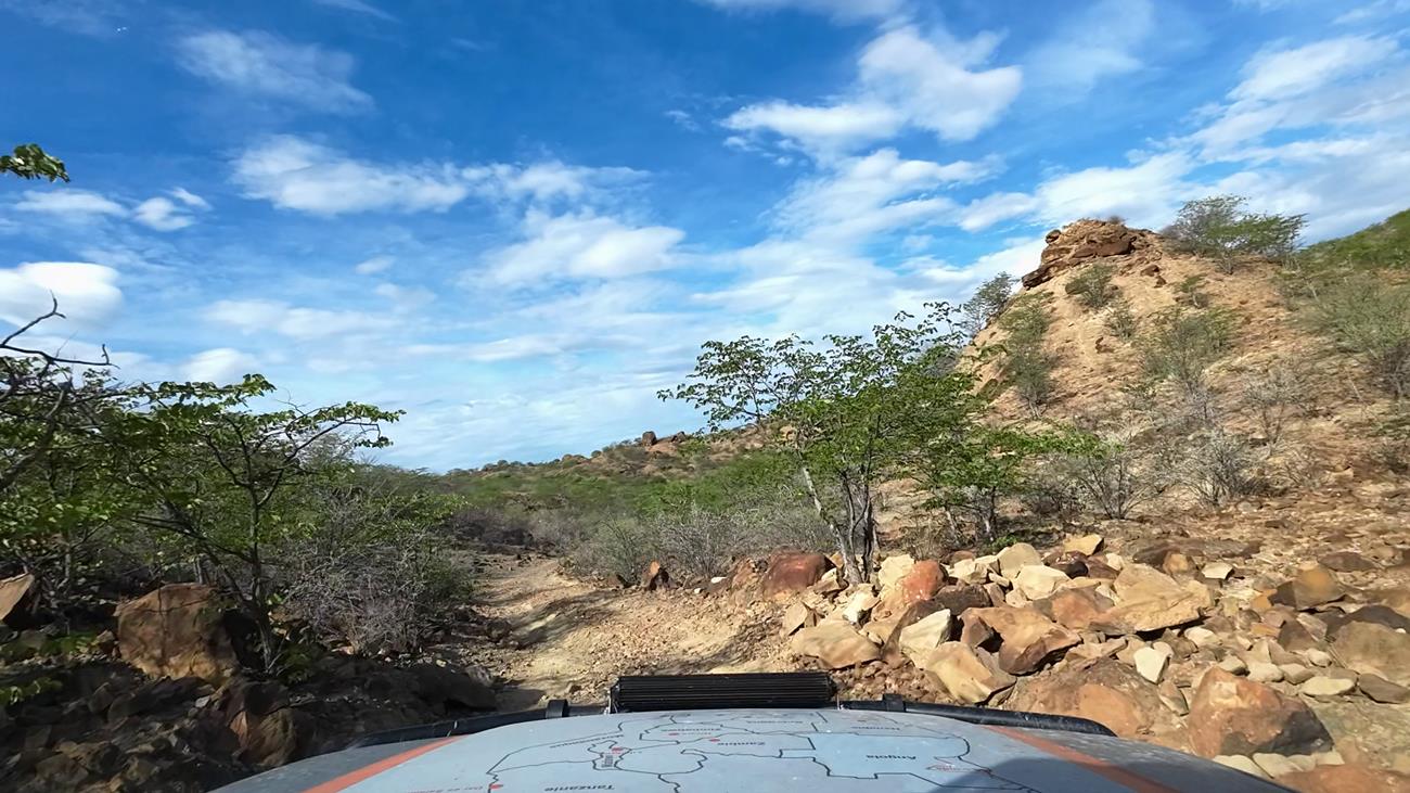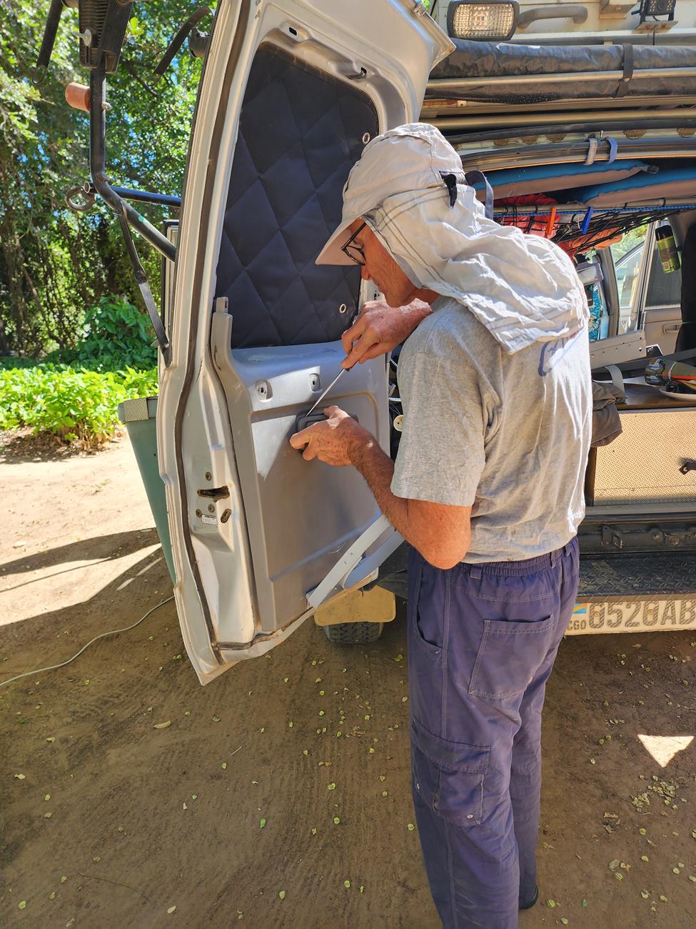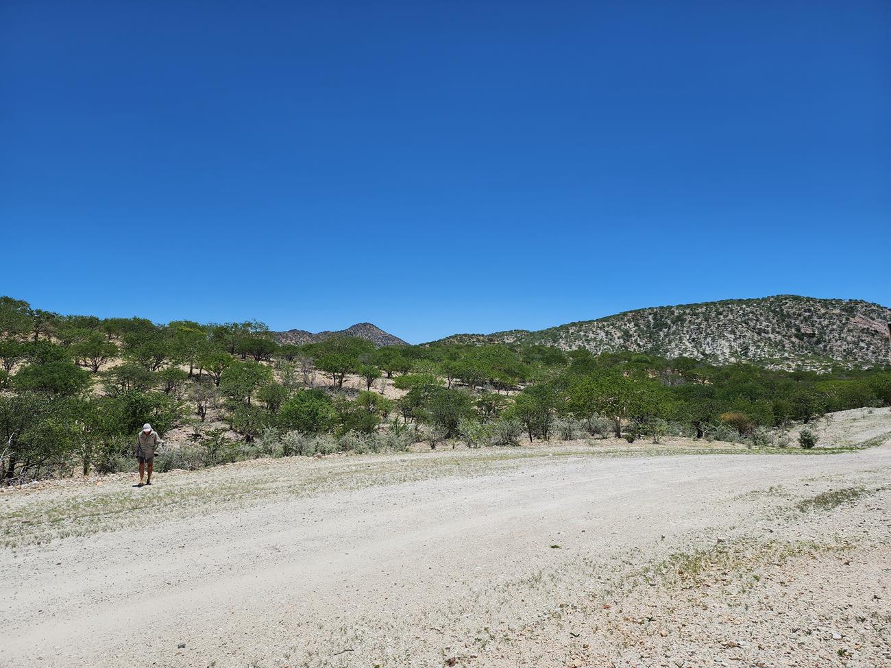 Yannick tente à nouveau d’ouvrir la porte et là c’est cata. Impossible, elle est coincée de chez coincée. Il commence à m’expliquer qu’il va devoir jouer de la disqueuse pour couper la porte et avoir accès au mécanisme. Avant tout ça nous devons trouver un lodge. À 5 km il y a le Kunene Lodge, sauf qu’ils ne font pas lodge, mais juste des emplacements.